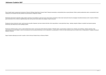 Halloween Cudaków 2007 Pokaz żonglerki ogniem zaproponował mieszkańcom Dobrzenia Wielkiego Zespół Sztuki Cyrkowej Cudaki. Okazją był zaczerpnięty z amerykańskiej kultury zwyczaj halloween. Brakło tu jednak przebierańców rodem z amerykańskich miast i miasteczek, bo też halloween był tylko pretekstem do prezentowania umiejętności Cudaków. Kilkadziesiąt osób brawami nagrodziło występy młodych cyrkowców. Przy dźwiękach muzyki pod czujnym okiem Grażyny Chmielowicz młodzi artyści wykonywali ćwiczenia wymagające niezwykłej koordynacji ruchów i skupienia. Efektowny pokaz trwał około 20 minut. Sceneria rozgwieżdżonego nieba nad Dobrzeniem tylko dodała uroku występom młodych cyrkowców. Żonglowanie oburącz doskonale rozwija i wyrównuje pracę obu półkul mózgowych, jest wręcz zalecane dla dzieci, które mają problemy z nauką (dysfunkcje mózgu - dysleksja, dysgrafia) .Wpływa na szybkość nauki poprzez poprawę koncentracji i jest zalecane przy nauce szybkiego czytania. Każdorazowo efektowne pokazy, jak ten w ostatni październikowy wieczór, promują grupę wśród miejscowej młodzieży. Podkreślić należy, że pomysł pokazu wypłynął nie od instruktora, ale od jednego z młodych cyrkowców. Chęć zaprezentowania się przed kolegami to także forma pozbywania się tremy podczas prezentacji na forum wojewódzkim czy ogólnopolskim. Od kilku lat Cudaki reprezentują Gminny Ośrodek Kultury na Ogólnopolskim Przeglądzie Dziecięcych Zespołów w Brodnicy. Zajęcia Cudaków odbywają się we wtorki i czwartki o 16.00 w Gminnym Ośrodku Kultury w Dobrzeniu Wielkim. 1/1