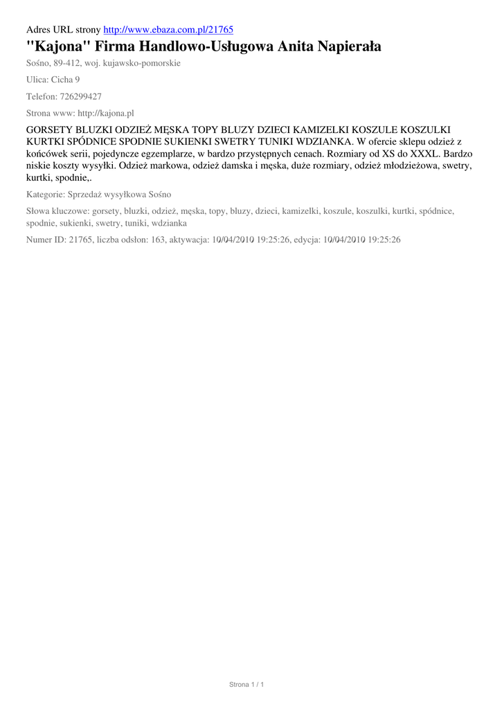 Adres URL strony http://www.ebaza.com.pl/21765 "Kajona" Firma Handlowo-Usługowa Anita Napierała Sośno, 89-412, woj. kujawsko-pomorskie Ulica: Cicha 9 Telefon: 726299427 Strona www: http://kajona.pl GORSETY BLUZKI ODZIEŻ MĘSKA TOPY BLUZY DZIECI KAMIZELKI KOSZULE KOSZULKI KURTKI SPÓDNICE SPODNIE SUKIENKI SWETRY TUNIKI WDZIANKA. W ofercie sklepu odzież z końcówek serii, pojedyncze egzemplarze, w bardzo przystępnych cenach. Rozmiary od XS do XXXL. Bardzo niskie koszty wysyłki. Odzież markowa, odzież damska i męska, duże rozmiary, odzież młodzieżowa, swetry, kurtki, spodnie,. Kategorie: Sprzedaż wysyłkowa Sośno Słowa kluczowe: gorsety, bluzki, odzież, męska, topy, bluzy, dzieci, kamizelki, koszule, koszulki, kurtki, spódnice, spodnie, sukienki, swetry, tuniki, wdzianka Numer ID: 21765, liczba odsłon: 163, aktywacja: 10/04/2010 19:25:26, edycja: 10/04/2010 19:25:26 Strona 1 / 1