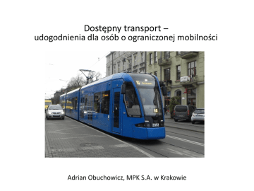 Dostępny transport – udogodnienia dla osób o ograniczonej mobilności Adrian Obuchowicz, MPK S.A. w Krakowie MPK S.A. w Krakowie (tradycje od 1875) 1875 – pierwszy omnibus 19 marca 2013, Katowice, 1901 – pierwsza linia tramwaju elektrycznego Adrian Obuchowicz, MPK S.A. w Krakowie MPK S.A. w Krakowie (tradycje od 1875) 1927 – pierwsza regularna linia autobusowa Ten sam autobus w 2008 r. 19 marca 2013, Katowice, Adrian Obuchowicz, MPK S.A. w Krakowie MPK S.A. w Krakowie Operator Transportu Publicznego • 300 millionów pasażerów rocznie • 430 autobusów dziennie na liniach • 216 pociągów tramwajowych • 140 linii autobusowych • 22 linii tramwajowych 19 marca 2013, Katowice, Adrian Obuchowicz, MPK S.A. w Krakowie Tabor autobusowy w MPK Krakow • 506 autobusów w inwentarzu • 430 autobusów dziennie na liniach • 188 autobusów przegubowych – w tym tylko 3 autobusy z wysoką podłogą • 258 autobusów standardowych – 100% niskiej podłogi • 63 autobusów typu midi – 100% niskiej podłogi • Ogółem 99,5% taboru jest niskopodłogowa 19 marca 2013, Katowice, Adrian Obuchowicz, MPK S.A. w Krakowie Ostatnie dostawy Solaris Urbino 19 marca 2013, Katowice, Adrian Obuchowicz, MPK S.A. w Krakowie Ostatnie dostawy Mercedes Citaro 19 marca 2013, Katowice, Adrian Obuchowicz, MPK S.A. w Krakowie Tabor tramwajowy w MPK Krakow • 270 pociągów tramwajowych w inwentarzu • 216 pociągów dziennie na liniach • 50 Bombardierów NGT6 (26 m) • 24 Bombardiery NGT8 (32 m) • 39 pociągów typu N8S i EU8N – z częścią niskopodłogową • 1 pociąg typu 405N – z 2 członami z niską podłogą • 46% tramwajów w ruchu jest niskopodłogowa 19 marca 2013, Katowice, Adrian Obuchowicz, MPK S.A. w Krakowie NGT6 19 marca 2013, Katowice, Adrian Obuchowicz, MPK S.A. w Krakowie NGT8 19 marca 2013, Katowice, Adrian Obuchowicz, MPK S.A. w Krakowie N8S 19 marca 2013, Katowice, Adrian Obuchowicz, MPK S.A. w Krakowie EU8N 19 marca 2013, Katowice, Adrian Obuchowicz, MPK S.A. w Krakowie 405N 19 marca 2013, Katowice, Adrian Obuchowicz, MPK S.A. w Krakowie Wnętrza pojazdów Automat dotykowy z wibracją przycisków Bezpośrednia łączność z motorniczym 19 marca 2013, Katowice, Adrian Obuchowicz, MPK S.A. w Krakowie Wnętrza pojazdów Kampanie informacyjne 19 marca 2013, Katowice, Adrian Obuchowicz, MPK S.A. w Krakowie Wnętrza pojazdów Tablice informacyjne z zapowiadaniem głosowym 19 marca 2013, Katowice, Adrian Obuchowicz, MPK S.A. w Krakowie Przyciski dźwiękowe opisane alfabetem Braille’a 19 marca 2013, Katowice, Adrian Obuchowicz, MPK S.A. w Krakowie Rozkładane rampy 19 marca 2013, Katowice, Adrian Obuchowicz, MPK S.A. w Krakowie Oznakowane wejścia 19 marca 2013, Katowice, Adrian Obuchowicz, MPK S.A. w Krakowie Oznakowanie krawędzi peronów 19 marca 2013, Katowice, Adrian Obuchowicz, MPK S.A. w Krakowie Wyniesione jezdnie aby ułatwić wejście 19 marca 2013, Katowice, Adrian Obuchowicz, MPK S.A. w Krakowie Przystanki 19 marca 2013, Katowice, Adrian Obuchowicz, MPK S.A. w Krakowie Działania dla osób starszych– projekt aeneas Asysta dla starszych pasażerów 19 marca 2013, Katowice, Adrian Obuchowicz, MPK S.A. w Krakowie Wnętrza pojazdów – projekt aeneas Nowe oznakowania wewnątrz pojazdów 19 marca 2013, Katowice, Adrian Obuchowicz, MPK S.A. w Krakowie Dziękuję za uwagę, Adrian Obuchowicz Kierownik Działu Projektowania Przewozów i Analiz Eksploatacyjnych MPK S.A. w Krakowie tel. 012/254-11-46, fax. 012/254-19-46 19 marca 2013, Katowice, Adrian Obuchowicz, MPK S.A. w Krakowie
