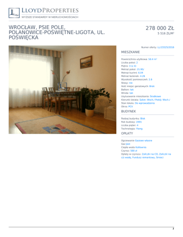 WROCŁAW, PSIE POLE, POLANOWICE-POŚWIĘTNE-LIGOTA, UL. POŚWIĘCKA 278 000 ZŁ 5 516 ZŁ/M2 Numer oferty: LL/15525/2016 MIESZKANIE Powierzchnia użytkowa: 50.4 m2 Liczba pokoi: 2 Piętro: 3 (z 4) Metraż pokoi: 21.95/ Metraż kuchni: 6.04 Metraż łazienek: 4.26 Wysokość pomieszczeń: 2.6 Skosy: nie Ilość miejsc garażowych: Brak Balkon: tak Winda: tak Usytuowanie mieszkania: Środkowe Kierunki świata: Salon: Wsch./ Pokój: Wsch./ Stan lokalu: Do wprowadzenia Okna: PCV BUDYNEK Rodzaj budynku: Blok Rok budowy: 2001 Liczba pięter: 4 Technologia: Ytong OPŁATY Ogrzewanie Gazowe własne Gaz Jest Ciepła woda Kotłownia Czynsz: 580 zł Opłaty w czynszu: Zaliczki na CO, Zaliczki na c/z wodę, Fundusz remontowy, Śmieci 1 +48 71 712 70 92, +48 533 340 314 [email protected] OPIS Mieszkanie składa się z dużego, słonecznego salonu, mniejszego pokoju, który świetnie spełnia się w roli sypialni, widnej oddzielnej kuchni, łazienki oraz przedpokoju. Mieszkanie jest wyremontowane, więc nie wymaga od nowych lokatorów żadnych dodatkowych nakładów finansowych. Lokal jest w pełni rozkładowy, dzięki temu, że okna są od strony wschodniej jest w nim słonecznie i przytulnie, jednak nie jest gorąco. Na balkon można wyjść za równo z salonu jak z mniejszego pokoju. W mniejszym pokoju oraz w przedpokoju są duże szafy wnękowe, w których można trzymać rzeczy, a ponadto do mieszkania przynależy komórka lokatorska, w której można trzymać rzeczy rzadszego użytku, a także rowery itp. Mieszkanie idealne dla pary bądź pary z dzieckiem. Budynek z 2001 roku, nowe budownictwo oraz instalacje, winda dostosowana do osób niepełnosprawnych. Istnieje możliwość wynajęcia miejsca w garażu podziemnym. Przy wejściu do budynku jest domofon. Nieruchomość znajduje się w spokojnej zielonej okolicy. Wokół znajdują się liczne sklepy, w pobliskim sąsiedztwie znajduje się Centrum Handlowe Marino. Zaraz przy bloku znajduje się przystanek autobusowy, a niedaleko jest pętla tramwajowa Poświętne skąd można dostać się do centrum, a także na uczelnie, dzięki czemu mieszkanie także nadaje się jako inwestycja pod wynajem. Idealny dojazd na Autostradową Obwodnicę Wrocławia, skąd można się dostać do każdej części Wrocławia. 2