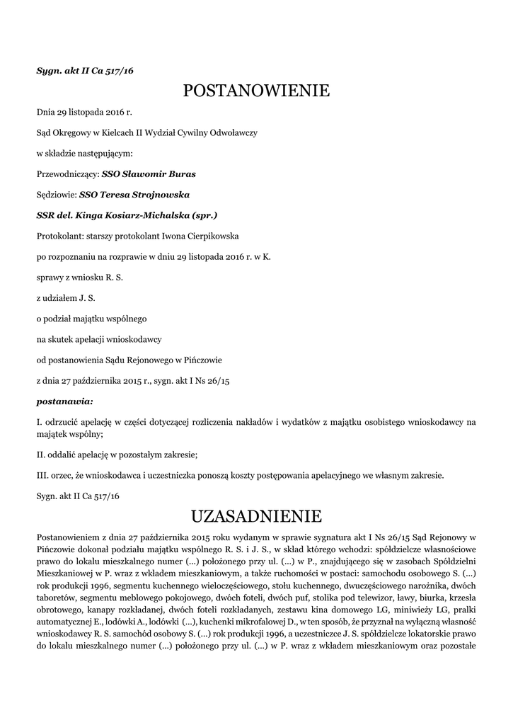 Sygn. akt II Ca 517/16 POSTANOWIENIE Dnia 29 listopada 2016 r. Sąd Okręgowy w Kielcach II Wydział Cywilny Odwoławczy w składzie następującym: Przewodniczący: SSO Sławomir Buras Sędziowie: SSO Teresa Strojnowska SSR del. Kinga Kosiarz-Michalska (spr.) Protokolant: starszy protokolant Iwona Cierpikowska po rozpoznaniu na rozprawie w dniu 29 listopada 2016 r. w K. sprawy z wniosku R. S. z udziałem J. S. o podział majątku wspólnego na skutek apelacji wnioskodawcy od postanowienia Sądu Rejonowego w Pińczowie z dnia 27 października 2015 r., sygn. akt I Ns 26/15 postanawia: I. odrzucić apelację w części dotyczącej rozliczenia nakładów i wydatków z majątku osobistego wnioskodawcy na majątek wspólny; II. oddalić apelację w pozostałym zakresie; III. orzec, że wnioskodawca i uczestniczka ponoszą koszty postępowania apelacyjnego we własnym zakresie. Sygn. akt II Ca 517/16 UZASADNIENIE Postanowieniem z dnia 27 października 2015 roku wydanym w sprawie sygnatura akt I Ns 26/15 Sąd Rejonowy w Pińczowie dokonał podziału majątku wspólnego R. S. i J. S., w skład którego wchodzi: spółdzielcze własnościowe prawo do lokalu mieszkalnego numer (...) położonego przy ul. (...) w P., znajdującego się w zasobach Spółdzielni Mieszkaniowej w P. wraz z wkładem mieszkaniowym, a także ruchomości w postaci: samochodu osobowego S. (...) rok produkcji 1996, segmentu kuchennego wieloczęściowego, stołu kuchennego, dwuczęściowego narożnika, dwóch taboretów, segmentu meblowego pokojowego, dwóch foteli, dwóch puf, stolika pod telewizor, ławy, biurka, krzesła obrotowego, kanapy rozkładanej, dwóch foteli rozkładanych, zestawu kina domowego LG, miniwieży LG, pralki automatycznej E., lodówki A., lodówki (...), kuchenki mikrofalowej D., w ten sposób, że przyznał na wyłączną własność wnioskodawcy R. S. samochód osobowy S. (...) rok produkcji 1996, a uczestniczce J. S. spółdzielcze lokatorskie prawo do lokalu mieszkalnego numer (...) położonego przy ul. (...) w P. wraz z wkładem mieszkaniowym oraz pozostałe opisane w orzeczeniu ruchomości. Tytułem dopłaty Sąd zasądził od uczestniczki J. S. na rzecz wnioskodawcy R. S. kwotę 2.127,50 zł , a od wnioskodawcy na rzecz uczestniczki kwotę 2.404,53 zł tytułem kosztów utrzymania mieszkania oraz kwotę 121 zł tytułem zwrotu kosztów tego postepowania, w pozostałym zakresie oddalając to żądanie. Ponadto Sąd umorzył postępowanie w zakresie żądania zapłaty kwoty 855,16 zł z tytułu zwrotu kosztów utrzymania mieszkania z uwagi na cofnięcie żądania w tym zakresie. Sąd nakazał pobrać na rzecz Skarbu Państwa (Sądu Rejonowego w Pińczowie) tytułem wydatków poniesionych tymczasowo przez Skarb Państwa od wnioskodawcy kwotę 203,03 zł, a od uczestniczki kwotę 1.203,02 zł orzekając, że w pozostałym zakresie wnioskodawca i uczestniczka ponoszą koszty związane ze swym udziałem w sprawie (k. 436). Sąd Rejonowy ustalił, że w skład majątku wspólnego wnioskodawcy i uczestniczki weszły ruchomości szczegółowo opisane w części dyspozytywnej postanowienia oraz spółdzielcze lokatorskie prawo do lokalu mieszkalnego numer (...), położonego przy ul. (...) w P., przy czym wkład mieszkaniowy został zgromadzony przez rodziców uczestniczki, a następnie wyłącznie jej darowany. Sąd I instancji ustalił także, że w trakcie trwania wspólności majątkowej, R. S. i J. S. w lokalu mieszkalnym wykonali szereg prac remontowych, na których środki pochodziły z ich majątku wspólnego. Sąd ten ustalił także, że R. S. otrzymał od swego brata kwotę pieniężną z tytułu spłat związanych z działem spadku po ich ojcu, a pieniądze te przeznaczył na zaspokojenie potrzeb rodziny. Sąd ustalił również, że już po ustaniu wspólności majątkowej J. S. poniosła wydatki związane z utrzymaniem lokalu mieszkalnego w łącznej kwocie 4.398,38 zł. Biorąc to pod uwagę sąd dokonał podziału majątku wspólnego wnioskodawcy i uczestniczki, przyznając poszczególne składniki uczestnikom zgodnie z ich stanowiskiem w tym zakresie. Ponadto sąd przyjął, że skoro wkład mieszkaniowy związany ze spółdzielczym lokatorskim prawem do lokalu stanowił wyłączną własność J. S., to jest to nakład z jej majątku osobistego na majątek wspólny, a więc wnioskodawcy nie przysługuje z tego tytułu spłata na rzecz uczestniczki, mimo tego, iż prawo to stanowiło majątek wspólny uczestników. Sąd przyjął także, że skoro wnioskodawca przeznaczył pieniądze otrzymane z działu spadku po swym ojcu na potrzeby własnej rodziny, to również z tego tytułu nie może domagać się od uczestniczki zapłaty. Sąd Rejonowy uznał również, że niezasadne jest żądanie rozliczenia nakładu z majątku wspólnego na majątek osobisty uczestniczki w postaci środków pieniężnych wyprowadzanych przez nią ze wspólnego konta na rachunek jej matki. W tym zakresie uznał to żądanie za nieudowodnione (k. 440-446). Apelację od powyższego orzeczenia wniósł pełnomocnik wnioskodawcy skarżąc je w części nierozpoznania i nierozliczenia przy orzekaniu w przedmiocie spółdzielczego lokatorskiego prawa do lokalu, wartości wkładu mieszkaniowego, nierozliczenia nakładów i wydatków poniesionych przez wnioskodawcę z majątku osobistego na majątek wspólny oraz darowizn dokonanych przez uczestniczkę postępowania z majątku wspólnego na rzecz osób trzecich, zaskarżonemu postanowieniu zarzucając: 1. obrazę przepisów art. 567 § 1 i 3, art. 618 § 1 k.p.c. przez odmowę dokonania przez Sąd rozliczenia wkładu mieszkaniowego w sytuacji, kiedy spółdzielcze lokatorskie prawo do lokalu mieszkalnego byłych małżonków powstało w trybie obowiązującego wówczas art. 215 § 1, 2 i 4 prawa spółdzielczego, stanowiło ich majątek wspólny, a ustalenie kwoty udziału wnioskodawcy w wartości przedmiotowego prawa wg. wskazań zawartych w art. 11 i następnych usta