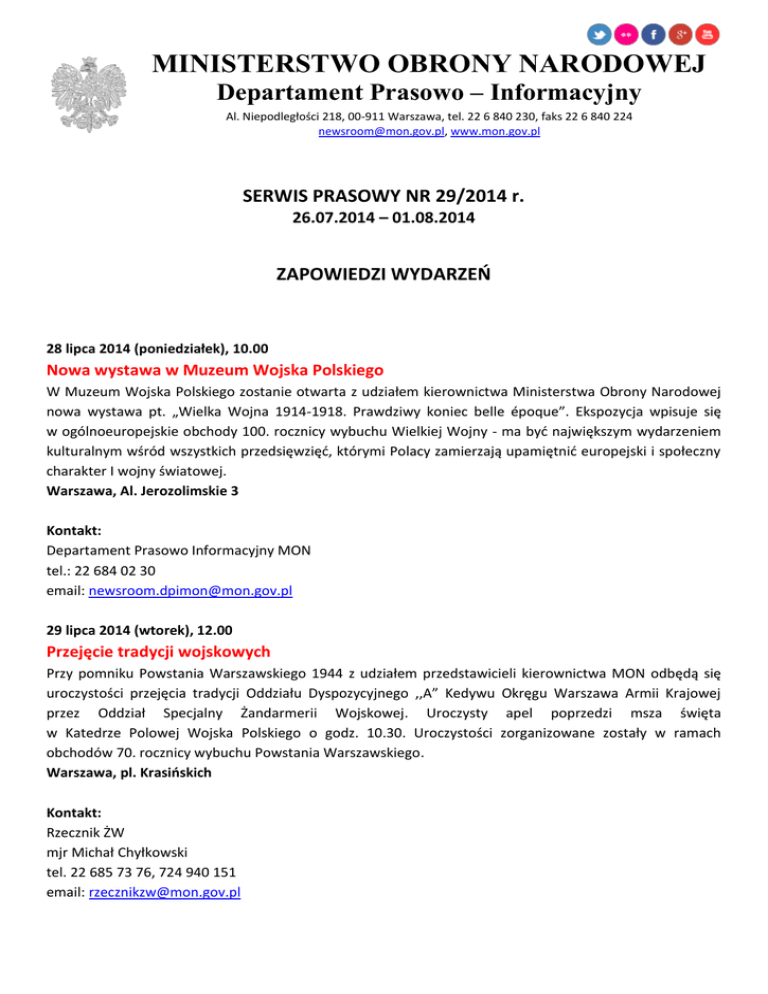 MINISTERSTWO OBRONY NARODOWEJ Departament Prasowo – Informacyjny Al. Niepodległości 218, 00-911 Warszawa, tel. 22 6 840 230, faks 22 6 840 224 [email protected], www.mon.gov.pl SERWIS PRASOWY NR 29/2014 r. 26.07.2014 – 01.08.2014 ZAPOWIEDZI WYDARZEŃ 28 lipca 2014 (poniedziałek), 10.00 Nowa wystawa w Muzeum Wojska Polskiego W Muzeum Wojska Polskiego zostanie otwarta z udziałem kierownictwa Ministerstwa Obrony Narodowej nowa wystawa pt. „Wielka Wojna 1914-1918. Prawdziwy koniec belle époque”. Ekspozycja wpisuje się w ogólnoeuropejskie obchody 100. rocznicy wybuchu Wielkiej Wojny - ma być największym wydarzeniem kulturalnym wśród wszystkich przedsięwzięć, którymi Polacy zamierzają upamiętnić europejski i społeczny charakter I wojny światowej. Warszawa, Al. Jerozolimskie 3 Kontakt: Departament Prasowo Informacyjny MON tel.: 22 684 02 30 email: [email protected] 29 lipca 2014 (wtorek), 12.00 Przejęcie tradycji wojskowych Przy pomniku Powstania Warszawskiego 1944 z udziałem przedstawicieli kierownictwa MON odbędą się uroczystości przejęcia tradycji Oddziału Dyspozycyjnego ,,A” Kedywu Okręgu Warszawa Armii Krajowej przez Oddział Specjalny Żandarmerii Wojskowej. Uroczysty apel poprzedzi msza święta w Katedrze Polowej Wojska Polskiego o godz. 10.30. Uroczystości zorganizowane zostały w ramach obchodów 70. rocznicy wybuchu Powstania Warszawskiego. Warszawa, pl. Krasińskich Kontakt: Rzecznik ŻW mjr Michał Chyłkowski tel. 22 685 73 76, 724 940 151 email: [email protected] 30 lipca 2014 (środa), 21.00 Projekcja filmu ,,Miasto 44” Na Stadionie Narodowym odbędzie się uroczysty pokaz specjalny filmu „Miasto 44” z udziałem przedstawicieli kierownictwa Ministerstwa Obrony Narodowej. Projekcja obrazu w reżyserii Jana Komasy jest częścią oficjalnych obchodów 70. rocznicy Powstania Warszawskiego. Warszawa Kontakt: Rzecznik prasowy Urzędu m.st. Warszawy Bartosz Milczarczyk tel. 726 086 525 e.mail: [email protected] 31 lipca 2014 (czwartek), 18.00 Uroczystości rocznicowe Przy pomniku Powstania Warszawskiego 1944 odbędzie się uroczysty apel poległych z udziałem przedstawicieli resortu obrony narodowej zorganizowany w ramach obchodów 70. rocznicy Powstania Warszawskiego. Warszawa, pl. Krasińskich Program obchodów: godz. 18.00 – uroczysta polowa Msza Święta; godz. 19.00 – Apel Poległych; godz. 20.00 – Widowisko ,,Śpiew Murów ´44” Kontakt: Departament Prasowo Informacyjny MON tel. 22 684 02 30 email: [email protected] 31 lipca 2014 (czwartek) Przystanek Woodstock W ramach przystanku Woodstock odbędzie się przelot z elementami pokazu zespołu akrobacyjnego ,,Biało-Czerwone Iskry”. Kostrzyn Kontakt: Rzecznik prasowy DG RSZ ppłk Artur Goławski tel. 519 038 593 email: [email protected] 1 sierpnia 2014 (piątek) Obchody 70. rocznicy Powstania Warszawskiego Centralne obchody 70. rocznicy Powstania Warszawskiego, z udziałem kierownictwa Ministerstwa Obrony Narodowej i kadry Sił Zbrojnych RP. Warszawa Program obchodów 70. rocznicy wybuchu Powstania Warszawskiego: godz. 10.00 - uroczystości przy Pomniku „Mokotów Walczący - 1944”. „Marsz Mokotowa” - przemarsz ul. Puławską do ul. Dworkowej. Park im. Generała Gustawa Orlicz-Dreszera. godz. 11.30 – uroczystość posadzenia drzewa pamięci w Ogrodzie Saskim dla uczczenia 70. rocznicy Powstania Warszawskiego; godz. 12:00 - uroczysta zmiana warty przy Grobie Nieznanego Żołnierza na placu Marszałka Józefa Piłsudskiego godz. 17.00 - Godzina „W” - złożenie hołdu Powstańcom. Pomnik Gloria Victis, Cmentarz Wojskowy na Powązkach. Kontakt: Departament Prasowo Informacyjny MON tel.: 22 684 02 30 email: [email protected] KRONIKA 19 lipca 2014 (sobota) Dzień otwarty lotniska w Gdyni Babich Dołach Pokazy dynamiczne w powietrzu, wystawa statyczna samolotów i śmigłowców oraz uzbrojenia i specjalistycznego wyposażenia to główne atrakcje dnia otwartego lotniska w Gdyni Babich Dołach. Więcej … 21 lipca 2014 (poniedziałek) Święto Strzelców Konnych Przez dwa dni Strzelcy Konni z Wielkopolskiej Brygady uroczyście obchodzili święto pułkowe, podczas którego 99-letni porucznik Franciszek Andrzejak, ostatni żyjący żołnierz 7 Pułku Strzelców Konnych, odebrał akt mianowania na stopień rotmistrza. Więcej … 21 lipca 2014 (poniedziałek) W armii będzie 294 nowych kaprali O stopień podoficera w szkole wojsk lądowych walczyło prawie 300 szeregowych. Przez pół roku uczyli się dowodzić: prowadzić musztrę, zajęcia ze strzelania czy łączności. – Wejście w rolę dowódcy wcale nie jest łatwe, gdy do tej pory samemu stało się w szyku – mówi chor. Marcin Szubert z poznańskiej szkoły. Ci, którzy zdali egzaminy wkrótce zostaną dowódcami drużyn i załóg. Więcej … 22 lipca 2014 (wtorek) Nowe mundury dla wojska Czołgiści jeszcze w tym roku będą mogli założyć nowy rodzaj kurtek zimowych, marynarze ubrania sztormowe, a piloci – kombinezony tropikalne. To tylko część zakupów w ramach trwającej w armii wymiany umundurowania. Więcej … 23 lipca 2014 (środa) Minister obrony gościem "Sygnałów Dnia" „Ukraina jest naszym bliskim partnerem, mamy [z nią] kontakty wojskowe, mamy plan współpracy. Natomiast kwestia wsparcia wojskowego dla Ukrainy to sprawa całego NATO, całego Zachodu” powiedział w "Sygnałach Dnia" minister obrony narodowej Tomasz Siemoniak. Więcej … 24 lipca 2014 (czwartek) Międzynarodowe szkolenie spadochroniarzy Żołnierze 6 Brygady Powietrznodesantowej przez tydzień szkolili się w Niemczech. To kolejny element międzynarodowej współpracy jednostek powietrznodesantowych państw NATO. Więcej … 24 lipca 2014 (czwartek) Szef MON gościem narady ambasadorów „Od lat wskazywaliśmy, że zagrożeń we współczesnym świecie nie brakuje, dlatego też spraw obronnych nie wolno odkładać na później” – mówił minister obrony narodowej Tomasz Siemoniak podczas Dorocznej Narady Amba