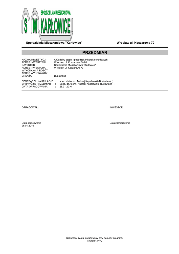Spółdzielnia Mieszkaniowa "Karłowice" Wrocław ul. Koszarowa 70 PRZEDMIAR NAZWA INWESTYCJI ADRES INWESTYCJI INWESTOR ADRES INWESTORA WYKONAWCA ROBÓT ADRES WYKONAWCY BRANŻA : : : : : : : OKładziny stopni i posadzek 9 klatek schodowych Wrocław, ul. Koszarowa 64-80 Spółdzielnia Mieszkaniowa "Karłowice" Wrocław, ul. Koszarowa 70 Budowlana SPORZĄDZIŁ KALKULACJE : SPRAWDZIŁ PRZEDMIAR : DATA OPRACOWANIA : spec. ds techn. Andrzej Kapelewski (Budowlana ) Spec. ds. techn. Andrzej Kapelewski (Budowlana ) 26.01.2016 OPRACOWAŁ : INWESTOR : Data opracowania 26.01.2016 Data zatwierdzenia Dokument został opracowany przy pomocy programu NORMA PRO PRZEDMIAR Okładziny schodów Koszarowa 64-80 PRZEDMIAR Lp. Podstawa Opis i wyliczenia WROCŁAW, UL.Koszarowa 46-62 1 Okładziny schodów 1 KNR 4-01 Skucie nierówności betonu przy głębokości skucia do 1 cm na ścianach d.1 0211-01 lub podłogach 0.80*9 j.m. m2 m2 5 KNR-W 2-02 Okładziny schodów z płytek z kamieni sztucznych 30x30 cm układanych m d.1 1120-02 na zaprawie klejowej Gres strukturalny ALPINO BEŻ 33x33 CERAMIKA GRES Gat.1 ALPIBEŻ-33-333-NA-1 Gres strukturalny ALPINO BEŻ 33x33 CERAMIKA GRES stopnica ryflowana, Gat.1 CG-ST-ALPI-BEŻ-330-330-NA-1 Zaprawa klejowa Ceresit CM 17 "Super Flexible" wysokoelastyczna do ukladania plytek gresowych, ceramicznych i kamienia naturalnego, opak. 5 kg Fuga Mira Elastyczna kolor 138 - 5kg' 79.5*9 m 7 KNR K-04 d.1 0109-01 m Norma PRO Wersja 4.38 Nr seryjny: 28597 Użytkownik: SM "Karłowice" 357.750 RAZEM 357.750 317.850 RAZEM 317.850 317.850 RAZEM 317.850 715.500 RAZEM 715.500 723.700 RAZEM 723.700 101.070 RAZEM 101.070 723.700 RAZEM 723.700 72.000 RAZEM 72.000 m m 9 NNRNKB (z.VII) Osadzenie profilu aluminiowego Profil schodowy - 8 stopni w przy- szt d.1 202 0842-01 ziemiu Profil schodowy FSTA 110/250 DURAL 8*9 szt -2- 7.200 m Wykonanie tynków mozaikowych na gotowym podłożu z zaprawy MOZA- m2 TYNK o wielkości kamienia 1,2 mm Tynk mozaikowy BOLIX TM - 07B Grunt pod tynki cienkowarstwowe GRUNTOFIX KREISEL 11.23*9 m2 8 NNRNKB (z.VII) Osadzenie listew wykończających przy licowaniu ścian płytkami d.1 202 0842-01 cokolikami w pomieszczeniach o pow. do 8 m2 z uszczelnieniem masą sylikonową szczelin przy ścianach - listwa wkolorze płytek cokolika. listwa wykończająca PCV Masa uszczelniająca "Silikon Mira 138" poz.6 7.200 RAZEM m2 4 KNR-W 2-02 Posadzki jedno- i dwubarwne z płytek z kamieni sztucznych 30x30 cm na m2 d.1 1111-03 zaprawie klejowej układane metodą regularną Gres strukturalny ALPINO BEŻ 33x33 CERAMIKA GRES Gat.1 ALPIBEŻ-33-333-NA-1 Zaprawa klejowa Ceresit CM 17 "Super Flexible" wysokoelastyczna do ukladania plytek gresowych, ceramicznych i kamienia naturalnego, opak. 5 kg Fuga Mira Elastyczna kolor 138 - 5kg 32.65*9+24 m2 6 NNRNKB 2- (z.VI) Cokoliki z płytek kamionkowych GRES na zaprawie klejowej w pod.1 02 2809-01 mieszczeniach o pow.do 10 m2 Gres strukturalny ALPINO BEŻ 33x33 CERAMIKA GRES Gat.1 ALPIBEŻ-33-333-NA-1' Fuga Mira Elastyczna kolor 138 - 5kg 78.80*9+14.5 Razem m2 2 NNRNKB (z.VII) Gruntowanie podłoży preparatami - powierzchnie poziome - scho- m2 d.1 202 1134-01 dy Atlas Grunto-Plast Warstwa sczepna na trudne podłoża 79.5*0.5*9 m2 3 NNRNKB (z.VII) Gruntowanie podłoży preparatami - powierzchnie poziome - pod.1 202 1134-01 sadzki Atlas Grunto-Plast Warstwa sczepna na trudne podłoża 32.65*9+24 Poszcz