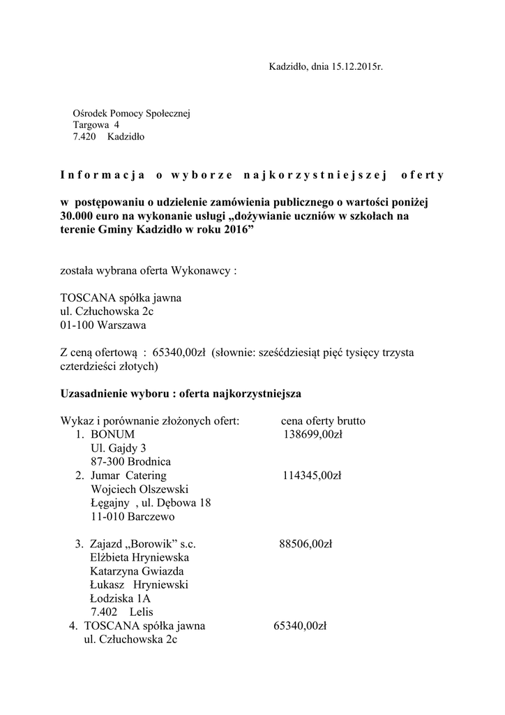 Kadzidło, dnia 15.12.2015r. Ośrodek Pomocy Społecznej Targowa 4 7.420 Kadzidło Informacja o wyborze najkorzystniejszej o f e rt y w postępowaniu o udzielenie zamówienia publicznego o wartości poniżej 30.000 euro na wykonanie usługi „dożywianie uczniów w szkołach na terenie Gminy Kadzidło w roku 2016” została wybrana oferta Wykonawcy : TOSCANA spółka jawna ul. Człuchowska 2c 01-100 Warszawa Z ceną ofertową : 65340,00zł (słownie: sześćdziesiąt pięć tysięcy trzysta czterdzieści złotych) Uzasadnienie wyboru : oferta najkorzystniejsza Wykaz i porównanie złożonych ofert: 1. BONUM Ul. Gajdy 3 87-300 Brodnica 2. Jumar Catering Wojciech Olszewski Łęgajny , ul. Dębowa 18 11-010 Barczewo 3. Zajazd „Borowik” s.c. Elżbieta Hryniewska Katarzyna Gwiazda Łukasz Hryniewski Łodziska 1A 7.402 Lelis 4. TOSCANA spółka jawna ul. Człuchowska 2c cena oferty brutto 138699,00zł 114345,00zł 88506,00zł 65340,00zł 01-100 Warszawa Do wiadomości: 1. BONUM Ul. Gajdy 3 87-300 Brodnica 2. Jumar Catering Wojciech Olszewski Łęgajny , ul. Dębowa 18 11-010 Barczewo 3. Zajazd „Borowik” s.c. Elżbieta Hryniewska Katarzyna Gwiazda Łukasz Hryniewski Łodziska 1A 07-402 Lelis 4. TOSCANA spółka jawna ul. Człuchowska 2c 1.100 Warszawa Kierownik Ośrodka Pomocy Społecznej Mariola Bednarczyk