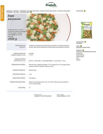 BONDUELLE / PRODUKTY / MROŻONE / MIESZANKI WARZYWNE / FASOLKA SZPARAGOWA ZIELONA , KALAFIOR, MARCHEWKA, PIETRUSZKA, POR, SELER / ZUPA JARZYNOWA OPAKOWANIE Zupa Jarzynowa SKŁAD: Warzywa w różnych proporcjach: fasolka szparagowa zielona, kalafior, marchew, korzeń selera, por, korzeń pietruszki. 2500 g TECHNOLOGIA MROŻONE CHARAKTERYSTYKA PRODUKTU: WARTOŚCI ODŻYWCZE I ENERGETYCZNE (W 100 G): ŚREDNIE WARTOŚCI ODŻYWCZE (W 100 G): SPOSÓB PRZYGOTOWANIA: Tradycyjna mieszanka stanowiąca bazę do wszelki zup. Idealne proporcje warzyw, ładne cięcie sprawiają, że produkt ładnie się prezentuje na talerzu. 28 KCAL 117 KJ błonnik – 2,8 g; białko – 2,6 g; węglowodany – 2,3 g; tłuszcz – 0,3 g Garnek: temp. wyjściowa produktu -18°C: gotować 5 min. we wrzącej, lekko osolonej wodzie. Przyprawić według uznania. JEDNOSTKA SPRZEDAŻY: Worek 2,5 kg OPAKOWANIE ZBIORCZE: 4 szt. TERMIN PRZYDATNOŚCI: 24 miesięcy WARUNKI PRZECHOWYWANIA: ILOŚĆ PORCJI: Chłodnia lub lodówka (od 0°C do +3°C): 24 h. Mroźnia lub zamrażalnik (18°C): kilka miesięcy. 17 All rights reserved projekt i realizacja Copyright © 2012-2015 Bonduelle Agencja Reklamowa 4 ALL GAMA MIESZANKI WARZYWNE WARZYWA FASOLKA SZPARAGOWA ZIELONA KALAFIOR MARCHEWKA PIETRUSZKA POR SELER