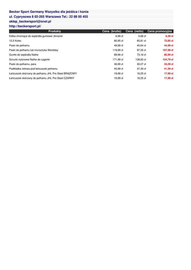 Becker Sport Germany Wszystko dla jeźdźca i konia ul. Cyprysowa 8 02-265 Warszawa Tel.: 22 88 00 455 [email protected] http://beckersport.pl/ Produkty Kółka chroniące do wędzidła gumowe/ ślinianki 12,5 Kolec Paski do pelhamu Paski do pelhamu lub munsztuka Wembley Gumki do wędzidła Nathe Sznurki nylonowe Nathe do cyganki Cena (brutto) Cena (netto) Cena promocyjna 6,99 zł 5,68 zł 6,29 zł 80,95 zł 65,81 zł 72,85 zł 49,99 zł 40,64 zł 44,99 zł 119,99 zł 97,55 zł 107,99 zł 89,99 zł 73,16 zł 80,99 zł 171,99 zł 139,83 zł 154,79 zł Paski do pelhamu, para 36,99 zł 30,07 zł 33,29 zł Podkładka żelowa pod łańcuszek pelhamu 45,99 zł 37,39 zł 41,39 zł Łańcuszek skórzany do pelhamu JHL Pro Steel BRĄZOWY 19,99 zł 16,25 zł 17,99 zł Łańcuszek skórzany do pelhamu JHL Pro Steel CZARNY 19,99 zł 16,25 zł 17,99 zł