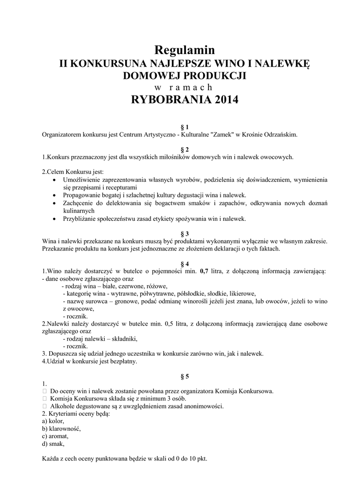 Regulamin II KONKURSUNA NAJLEPSZE WINO I NALEWKĘ DOMOWEJ PRODUKCJI w ramach RYBOBRANIA 2014 §1 Organizatorem konkursu jest Centrum Artystyczno - Kulturalne "Zamek" w Krośnie Odrzańskim. §2 1.Konkurs przeznaczony jest dla wszystkich miłośników domowych win i nalewek owocowych. 2.Celem Konkursu jest: Umożliwienie zaprezentowania własnych wyrobów, podzielenia się doświadczeniem, wymienienia się przepisami i recepturami Propagowanie bogatej i szlachetnej kultury degustacji wina i nalewek. Zachęcenie do delektowania się bogactwem smaków i zapachów, odkrywania nowych doznań kulinarnych Przybliżanie społeczeństwu zasad etykiety spożywania win i nalewek. §3 Wina i nalewki przekazane na konkurs muszą być produktami wykonanymi wyłącznie we własnym zakresie. Przekazanie produktu na konkurs jest jednoznaczne ze złożeniem deklaracji o tych faktach. §4 1.Wino należy dostarczyć w butelce o pojemności min. 0,7 litra, z dołączoną informacją zawierającą: - dane osobowe zgłaszającego oraz - rodzaj wina – białe, czerwone, różowe, - kategorię wina - wytrawne, półwytrawne, półsłodkie, słodkie, likierowe, - nazwę surowca – gronowe, podać odmianę winorośli jeżeli jest znana, lub owoców, jeżeli to wino z owocowe, - rocznik. 2.Nalewki należy dostarczyć w butelce min. 0,5 litra, z dołączoną informacją zawierającą dane osobowe zgłaszającego oraz - rodzaj nalewki – składniki, - rocznik. 3. Dopuszcza się udział jednego uczestnika w konkursie zarówno win, jak i nalewek. 4.Udział w konkursie jest bezpłatny. §5 1. Do oceny win i nalewek zostanie powołana przez organizatora Komisja Konkursowa. Komisja Konkursowa składa się z minimum 3 osób. Alkohole degustowane są z uwzględnieniem zasad anonimowości. 2. Kryteriami oceny będą: a) kolor, b) klarowność, c) aromat, d) smak, Każda z cech oceny punktowana będzie w skali od 0 do 10 pkt. W przypadku większej ilości win zgłoszonych na konkurs, komisja ma prawo wyodrębnić poszczególne kategorie konkursu, ustalone w oparciu o rodzaje win (np. podział na białe, czerwone, wytrawne, słodkie, gronowe, owocowe, tegoroczne itp.). 3. W przypadku nalewek komisja oceniać będzie alkohole zbiorczo, bez podziału na kategorie. 4. W szczególnych przypadkach, komisja może nie przyznać nagrody w danej kategorii lub przyznać nagrody specjalne. W przypadku równej ilości punktów, głos decydujący posiada przewodniczący komisji. Decyzje komisji są ostateczne. §6 1.Osoby przekazujące produkty na konkurs wyrażają zgodę na przetwarzanie przez organizatora konkursu swoich danych osobowych oraz zgodę na przetwarzanie wizerunku.(Ustawa o ochronie danych osobowych z dnia 29 sierpnia 1997 roku, Dz. U. Nr 133, poz. 833, z późn. zm.). 2. Wina i nalewki zgłoszone do konkursu nie będą zwracane właścicielom. §7 1.Zgłoszenia udziału w konkursie prosimy potwierdzić poprzez wypełnienie, podpisanie i dostarczenie formularza zgłoszenia (załącznik nr 1) wraz z próbkami win i nalewek do dnia 20 czerwca 2014 roku na poniższe miejsce: CAK "Zamek" w Krośnie Odrzańskim, ul. Szkolna 1, 66-600 Krosno Odrzańskie. 2.Rozstrzygnięcie konkursu i wręczenie nagród nastąpi w dniu 22 czerwca 2014 roku ok. godziny 18.00 na głównej scenie w porcie rzecznym w Krośnie Odrzańskim podczas imprezy RYBOBRANIE 2014. 3. Rozstrzygnięcie konkursu i wręczenie nagród poprzedzą warsztaty winiarskie, które odbędą się w dniu 22 czerwca 2014 r. o godz. 15.00 w Zamku Piastowskim w Krośnie Odrzańskim. 4.Warsztaty poprowadzi Pan Roman Grad z Winnicy „Julia”, ze Starego Kisielina k. Zielonej Góry. §8 Organizatorzy konkursu przewidzieli nagrody rzeczowe oraz upominki dla laureatów i osób wyróżnionych w kategorii: wino i nalewka. Ponadto, laureaci i uczestnicy konkursu otrzymają pamiątkowe dyplomy. §9 1.Organizator zastrzega sobie prawo do zmiany terminu lub miejsca wręczenia nagród. 2.O ewentualnej zmianie terminu oraz miejsca wręczenia nagród laureaci zostaną powiadomieni telefonicznie przez Organizatora. § 10 Wszelkich informacji na temat konkursu można zasięgać w siedzibie Centrum Artystyczno - Kulturalnego "Zamek" w Krośnie Odrzańskim, ul. Szkolna 1, 66-600 Krosno Odrzańskie, tel. 68 383 89 94, e-mail: [email protected]. Załącznik nr 1 Formularz zgłoszeniowy II KONKURS NA NAJLEPSZE WINO I NALEWKĘ DOMOWEJ PRODUKCJI Dane zgłaszającego: Imię i nazwisko: ........................................................................................................................... Adres:............................................................................................................................................ Tel.:............................................................................................................................................... e-mail:........................................................................................................................................... Dane dotyczące zgłaszanego wina: Rodzaj wina - (wytrawne, półwytrawne, półsłodkie,słodkie, likierowe), ................................................................................. Nazwa owocu/ owoców (szczepy winogron) ………………………..................................................................................................................... Rocznik............................................................................................................................................ Dane dotyczące zgłaszanej nalewki: Rodzaj nalewki (składniki): ............................................................................................................ Rocznik:.......................................................................................................................................... Zawartość procentowa (nieobowiązkowo):..................................................................................... O