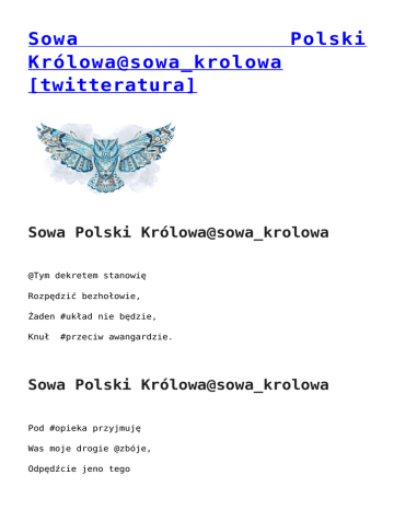 Sowa Polski Królowa@sowa_krolowa [twitteratura] Sowa Polski Królowa@sowa_krolowa @Tym dekretem stanowię Rozpędzić bezhołowie, Żaden #układ nie będzie, Knuł #przeciw awangardzie. Sowa Polski Królowa@sowa_krolowa Pod #opieka przyjmuję Was moje drogie @zbóje, Odpędźcie jeno tego Bardzo, bardzo małego. Sowa Polski Królowa@sowa_krolowa „Dziś mnie boli #głowa, – Rzekła smutno #królowa – Ogłaszam zatem #święta, Odwołam prezydenta.” Sowa Polski Królowa@sowa_krolowa Wrogów nieznane #spiski Zwalczaj od kołyski, @Lesbijki prowadź na #stos. Tam rzuć ich życia #los. Rzecznik Praw Pawik@rzecznik_pawik Rządu Rzecznik Rządu Pawik@rzecznik_pawik @Nasz #dyplomatołek Błyskiem wzleciał na #stołek, Gdy zejdzie ze stołka, Braknie dyplomatołka. Rzecznik Praw Pawik@rzecznik_pawik @PAD miałeś dzień ciężki? Odpuść, niech@ ekolożki Wpuszczą @ruchadełko, Wtedy spłódź #arcydziełko. Rządu Rzecznik Praw Pawik@rzecznik_pawik Rządu O tejże ważnej sprawie Powiem w akuzatiwie, To #grzech, #owszem, twierdzę, Gdy mój #zarodek skrzywdzę. Rzecznik Praw Pawik@rzecznik_pawik Rządu #Dzień_Zawsze_Dobry_TV Powiedział, żem #chłop_na_schwał, Nawet kota zgwałciłem I #morda nie zbrudziłem. Delfinka Matka Pimka@delfinka_matka_pimka Delfinka Pimka@delfinka_matka_pimka Nasze janiepawlenie – – słyszę – ma niezłe brzmienie, #Nasz_Koncert , #Nasza_Polska! Czytaj: #Moja_Warcholska! Delfinka Matka Pimka@delfinka_matka_pimka Mówię: #godność_i_wódka, To nie jest rzecz malutka. Historii naszej scheda, Rozweseli pół nieba. Delfinka Matka Pimka@delfinka_matka_pimka Matka To #kraj, gdzie #story_sztukas, Zmienisz na #story_whiskas, A taka przy tym frajda, Bo nie widział jej #Wajda. Delfinka Matka Pimka@delfinka_matka_pimka Yyyy … wtf, wow, #Poland? Na ja, das ist #Vaterland? Chcesz powiedzieć #Katoland? A usłyszeć #Tuskoland? Muszka Kopciuszka@muszka_kopciuszka Muszka Kopciuszka@muszka_kopciuszka Stań na #zmywak, @lewak, W obozie w Licheniu, Pomyśl o zbawieniu, Nim użyję #tasak. Muszka Kopciuszka@muszka_kopciuszka Studencie, mój bracie, Gdy szepną autokracie, Że się śni Honoracie, Zapisz to w doktoracie. Muszka Kopciuszka@muszka_kopciuszka Zacny @Alfred_Nobel Był wielki #marzyciel, Nim jego muzyczny #cień Nie wytrzymał barda pień. Muszka Kopciuszka@muszka_kopciuszka W dzień po wyborach @Muszka Spytała: „Gdzie pieluszka?” Wnet o abstrakcjach myśli Przegnali @niezawiśli. Ośmiorniczek Prztyczek@Ośmiorniczek_Prztyc zek Ośmiorniczek Prztyczek@Ośmiorniczek_Prztyczek @Mój_ludu, #Katastrofa, Poznaj zdradę filozofa, Narodzie to #Zamach, Kumatego w „izmach”. Ośmiorniczek Prztyczek@Osmiorniczek_Prztyczek @Leming, ty się nie bój, Ty lepiej #krowa dój, Ona wżdy #patriotka, nasza #polska_ciotka. Ośmiorniczek Prztyczek@Osmiorniczek_Prztyczek Sekret zdradzę, bracie: #Grypa to wynik spisku Szpiegów na lotnisku. Idź i powiedz to Tacie. Ośmiorniczek Prztyczek@Osmiorniczek_Prztyczek Najedz się, @Krycha, sera, Nim wybuchnie #afera, Nim w ciupie będziesz siedzieć. Za co? – Wstyd powiedzieć. Słonik Balonik@SłonikBalonik Słonik Balonik@SlonikBalonik #Plan budowy więzień, #Plan budowy więzień, #Plan budowy więzień, @Suweren, się nie leń. Słonik Balonik@SlonikBalonik #Nic się nie zmarnuje, #Nic się nie zmarnuje, #Nic wam obiecuję, #Wszystko się zhajcuje. Słonik Balonik@SlonikBalonik Zlikwiduję, obiecuję, Czy wiesz, o czym mówię? Będziem w pierwszej #klasa, Będziem jeść @kiełbasa. Słonik Balonik@SlonikBalonik Ja @premier z Pacanowa, Pytam, gdzie w tym #głowa? #Prawa dla @kobitki Napiszą @karmelitki. Doktorek Dromaderek@DoktorekDromaderek Doktorek Dromaderek@DoktorekDromaderek #Polska jest mi miła, @Polska znów zwyciężyła, #Polska, ja Cię wyleczę, @Polska, przed Tobą #DwaMiecze Doktorek Dromaderek@DoktorekDromaderek #Protest będzie wielki, Będziem zbierać #muszelki, Kandydujcie na mnie, Bo @lud będzie w trumnie. Doktorek Dromaderek@DoktorekDromaderek #Wszystko znów rozwalone, To zrobiły to #one, @młodzież już bez pracy, A bije ją @Horacy. Doktorek Dromaderek@DoktorekDromaderek Od tego ony som, Skażę was na banicję, Rozwalić przyjdzie @GROM, Czas zbierać amunicję. Jo Koń konowalski Konowalski@kon- Jo Koń Konowalski@kon-konowalski Jo was zbawie, Zbawie ja was, Wszyscy pójdą won, Jo naprawie wszystko som! Jo Koń Konowalski@kon-konowalski Demolud to my, Oni som bardzo źli, Pogonimy hołote, Wyrżniemy ciemnote. Jo Koń Konowalski@kon-konowalski Co się stało się? Bydlaki rządzo się! Zrobie wszędzie porządek, Bo bardzo źle dzieje się! Jo Koń Konowalski@kon-konowalski Parlament? Do pracy! Konik pyta, co na tacy rodacy? A ja powiem wam, Zdelegalizuję wszystko sam! Gołąbek Kardynałek@gołąbek_kardynałek [twitteratura] Gołąbek Kardynałek@gołąbek_kardynałek @gołąbek_kardynałek, Tyś #kłamczuszek-aniołek, Wezwanie do #miłości Przypomną #ludzie prości! Gołąbek Kardynałek@gołąbek_kardynałek Dziewko moja droga, Skoroś ty @dlaboga, Nie chcemy cię w klubie, Bo #my przy Belzebubie. Gołąbek Kardynałek@gołąbek_kardynałek Kocham cię, @Gołąbku, Nie mów więc „Ty czubku!” Bardzom chciała dzieciątka, @Jezus dla nas to #gratka. Gołąbek Kardynałek@gołąbek_kardynałek Nie szukaj tylko @władzy, Nie wzbudzaj bogactw @żądzy, Nie żyj krzywdą @człeka, I nie udawaj @Greka. Panienek Syrenek @panienek syrenek [Twitteratura] Panienek Syrenek @panienek syrenek RT @Hilary daj #dolary, Po #wybory #kacyki Przyślą nam #patyki, Taki świat. Jam już stary. Panienek Syrenek @panienek syrenek Jam jest #chłop czyli #baba, #Prawda, mucha nie siada, @Oener o tym wie, Cicho! Niech zatka się. Panienek Syrenek @panienek syrenek @Donald nie noś Trampek, Przybędzie animuszu W twoim kapeluszu, Gdy zaśpiewa @Cichłopek. Panienek Syrenek @panienek syrenek Dawaj czadu, @aniołek, Obiecaj mi #stołek, Jak trza, to damy radę, Wypijemy malagę. Related Posts Pl