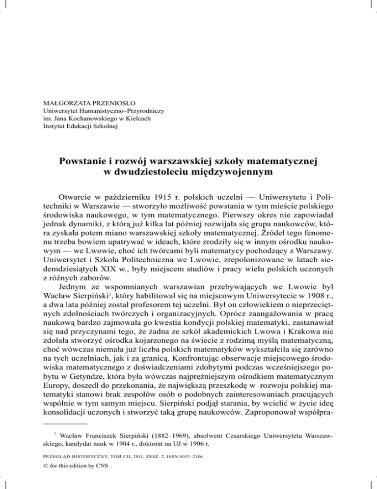 MAŁGORZATA PRZENIOSŁO Uniwersytet Humanistyczno–Przyrodniczy im. Jana Kochanowskiego w Kielcach Instytut Edukacji Szkolnej Powstanie i rozwój warszawskiej szkoły matematycznej w dwudziestoleciu międzywojennym Otwarcie w październiku 1915 r. polskich uczelni — Uniwersytetu i Politechniki w Warszawie — stworzyło możliwość powstania w tym mieście polskiego środowiska naukowego, w tym matematycznego. Pierwszy okres nie zapowiadał jednak dynamiki, z którą już kilka lat później rozwijała się grupa naukowców, która zyskała potem miano warszawskiej szkoły matematycznej. Źródeł tego fenomenu trzeba bowiem upatrywać w ideach, które zrodziły się w innym ośrodku naukowym — we Lwowie, choć ich twórcami byli matematycy pochodzący z Warszawy. Uniwersytet i Szkoła Politechniczna we Lwowie, zrepolonizowane w latach siedemdziesiątych XIX w., były miejscem studiów i pracy wielu polskich uczonych z różnych zaborów. Jednym ze wspomnianych warszawian przebywających we Lwowie był Wacław Sierpiński1, który habilitował się na miejscowym Uniwersytecie w 1908 r., a dwa lata później został profesorem tej uczelni. Był on człowiekiem o nieprzeciętnych zdolnościach twórczych i organizacyjnych. Oprócz zaangażowania w pracę naukową bardzo zajmowała go kwestia kondycji polskiej matematyki, zastanawiał się nad przyczynami tego, że żadna ze szkół akademickich Lwowa i Krakowa nie zdołała stworzyć ośrodka kojarzonego na świecie z rodzimą myślą matematyczną, choć wówczas niemała już liczba polskich matematyków wykształciła się zarówno na tych uczelniach, jak i za granicą. Konfrontując obserwacje miejscowego środowiska matematycznego z doświadczeniami zdobytymi podczas wcześniejszego pobytu w Getyndze, która była wówczas najprężniejszym ośrodkiem matematycznym Europy, doszedł do przekonania, że największą przeszkodę w rozwoju polskiej matematyki stanowi brak zespołów osób o podobnych zainteresowaniach pracujących wspólnie w tym samym miejscu. Sierpiński podjął starania, by wcielić w życie ideę konsolidacji uczonych i stworzyć taką grupę naukowców. Zaproponował współpra1 Wacław Franciszek Sierpiński (1882–1969), absolwent Cesarskiego Uniwersytetu Warszawskiego, kandydat nauk w 1904 r., doktorat na UJ w 1906 r. PR ZEGLĄD HISTORYCZNY, TOM CII, 2011, ZESZ. 2, ISSN 0033–2186 © for this edition by CNS 206 MAŁGORZATA PRZENIOSŁO cę przebywającemu za granicą młodemu dr. Zygmuntowi Janiszewskiemu2, również pochodzącemu z Warszawy, ten podzielał bowiem jego poglądy w kwestiach organizacji nauki, miał też własne przemyślenia, które później okazały się równie istotne dla rozwoju w Polsce szkół matematycznych. Janiszewski przyjął zaproszenie, habilitował się na Uniwersytecie we Lwowie (UL) w 1913 r. i rozpoczął wykłady na tej uczelni. W tym samym roku na UL zostało również wypromowanych dwóch doktorów, uczniów Sierpińskiego — Stefan Mazurkiewicz3 (on także pochodził z Warszawy) i Stanisław Ruziewicz. Wybuch wojny przerwał współpracę tej grupy, Sierpińskiego internowano w Rosji, a Janiszewski zaciągnął się do Legionów4. U progu niepodległości przemyślenia z czasów wspólnej pracy uczonych legły u podstaw sukcesu warszawskiej szkoły matematycznej. Tym razem stało się to za sprawą Zygmunta Janiszewskiego, który po kilkumiesięcznym pobycie na froncie i placówce Centralnego Biura Werbunkowego wrócił na początku 1917 r. na Uniwersytet we Lwowie5. Wówczas w odpowiedzi na ankietę rozesłaną przez Kasę im. Mianowskiego w Warszawie uczonym różnych dziedzin z prośbą o przekazanie informacji dotyczących potrzeb polskiej nauki, Janiszewski napisał tekst „O potrzebach matematyki w Polsce” uznany potem za „program ideowy” całego międzywojennego pokolenia polskich matematyków. Został on opublikowany w 1918 r. w pierwszym tomie wydawanego przez Kasę nowego czasopisma „Nauka Polska”, poświęconego rozwojowi nauki. Przedstawione w nim przemyślenia były w dużym stopniu wynikiem obserwacji zagranicznych ośrodków naukowych, w których Janiszewski przebywał w czasie studiów i dalszego kształcenia6. Artykuł zawierał bardzo dojrzałe studium kondycji ówczesnej polskiej matematyki, z rozpoznaniem przyczyn trudnej sytuacji i wskazaniem środków zaradczych. Janiszewski pisał m.in. o konieczności realizacji idei konsolidacji uczonych oraz o potrzebie wprowadzenia sytemu stypendialnego dla młodych talentów. Najważniejszy z nowych pomysłów, które przedstawił, dotyczył sposobu publikacji. Zwracał uwagę na rozproszenie prac naukowych polskich matematy2 Zygmunt Janiszewski (1888–1920), studiował na Uniwersytetach w Zurychu, Getyndze, Paryżu i Monachium, doktorat na Sorbonie w 1911 r. 3 Stefan Mazurkiewicz (1888–1945), studiował na Uniwersytetach w Krakowie, Monachium, Getyndze i Lwowie. 4 Centralne Archiwum Wojskowe, Akta Krzyża Niepodległości, sygn. KN 7.VII.1931 (akta Z. Janiszewskiego); AAN, Ministerstwo Wyznań Religijnych i Oświecenia Publicznego (dalej: MWRiOP), sygn. 5618, k. 62–63; W. S i e r p i ń s k i , O polskiej szkole matematycznej, „Problemy”, 1963, nr 3, s. 147–149. 5 Lwowskie Państwowe Archiwum Obwodowe (dalej: LPAO), Uniwersytet Jana Kazimierz we Lwowie (dalej: UJK), f. 26, op. 5, spr. 2242, k. 45; AP w Krakowie, Archiwum Naczelnego Komitetu Narodowego, mf. 100.551, k.141. 6 AGAD, C.K. Ministerstwo Wyznań i Oświaty (dalej: MWiO), sygn. 119u, Życiorys Z. Janiszewskiego. "Przegląd Historyczny" 102, 2011, z. 2 © for this edition by CNS POWSTANIE I ROZWÓJ WARSZAWSKIEJ SZKOŁY MATEMATYCZNEJ 207 ków w różnych czasopismach w wielu krajach, co utrudniało — jego zdaniem — upowszechnienie w świecie rodzimej myśli matematycznej. Postulował zakładanie w Polsce czasopism specjalistycznych, które byłyby poświęcone tylko jednej gałęzi matematyki lub wybranym, powiązanym ze so