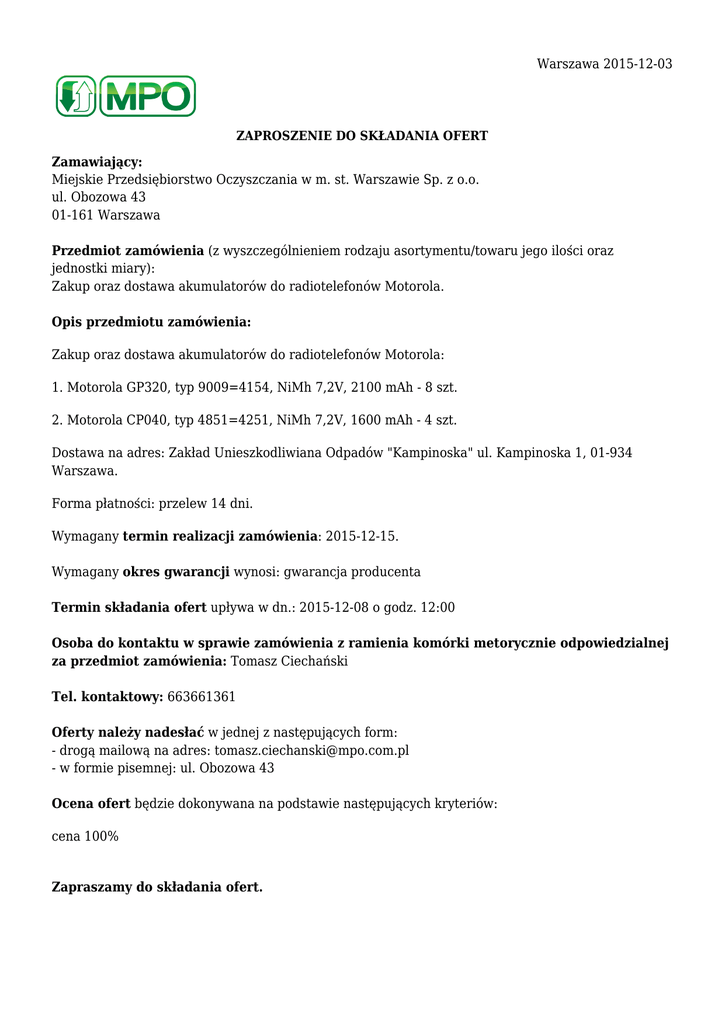 Warszawa 2015-12-03 ZAPROSZENIE DO SKŁADANIA OFERT Zamawiający: Miejskie Przedsiębiorstwo Oczyszczania w m. st. Warszawie Sp. z o.o. ul. Obozowa 43 01-161 Warszawa Przedmiot zamówienia (z wyszczególnieniem rodzaju asortymentu/towaru jego ilości oraz jednostki miary): Zakup oraz dostawa akumulatorów do radiotelefonów Motorola. Opis przedmiotu zamówienia: Zakup oraz dostawa akumulatorów do radiotelefonów Motorola: 1. Motorola GP320, typ 9009=4154, NiMh 7,2V, 2100 mAh - 8 szt. 2. Motorola CP040, typ 4851=4251, NiMh 7,2V, 1600 mAh - 4 szt. Dostawa na adres: Zakład Unieszkodliwiana Odpadów "Kampinoska" ul. Kampinoska 1, 01-934 Warszawa. Forma płatności: przelew 14 dni. Wymagany termin realizacji zamówienia: 2015-12-15. Wymagany okres gwarancji wynosi: gwarancja producenta Termin składania ofert upływa w dn.: 2015-12-08 o godz. 12:00 Osoba do kontaktu w sprawie zamówienia z ramienia komórki metorycznie odpowiedzialnej za przedmiot zamówienia: Tomasz Ciechański Tel. kontaktowy: 663661361 Oferty należy nadesłać w jednej z następujących form: - drogą mailową na adres: [email protected] - w formie pisemnej: ul. Obozowa 43 Ocena ofert będzie dokonywana na podstawie następujących kryteriów: cena 100% Zapraszamy do składania ofert.