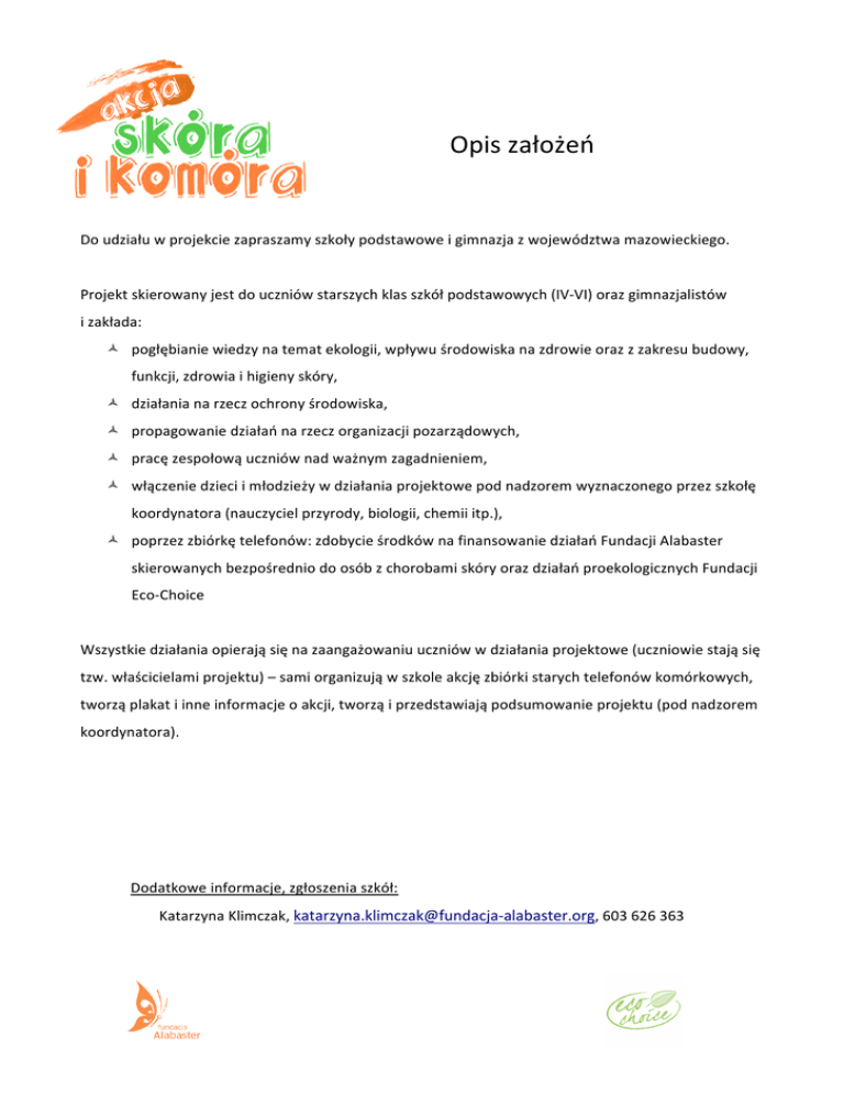 Opis założeń Do udziału w projekcie zapraszamy szkoły podstawowe i gimnazja z województwa mazowieckiego. Projekt skierowany jest do uczniów starszych klas szkół podstawowych (IV-‐VI) oraz gimnazjalistów i zakłada: pogłębianie wiedzy na temat ekologii, wpływu środowiska na zdrowie oraz z zakresu budowy, funkcji, zdrowia i higieny skóry, działania na rzecz ochrony środowiska, propagowanie działań na rzecz organizacji pozarządowych, pracę zespołową uczniów nad ważnym zagadnieniem, włączenie dzieci i młodzieży w działania projektowe pod nadzorem wyznaczonego przez szkołę koordynatora (nauczyciel przyrody, biologii, chemii itp.), poprzez zbiórkę telefonów: zdobycie środków na finansowanie działań Fundacji Alabaster skierowanych bezpośrednio do osób z chorobami skóry oraz działań proekologicznych Fundacji Eco-‐Choice Wszystkie działania opierają się na zaangażowaniu uczniów w działania projektowe (uczniowie stają się tzw. właścicielami projektu) – sami organizują w szkole akcję zbiórki starych telefonów komórkowych, tworzą plakat i inne informacje o akcji, tworzą i przedstawiają podsumowanie projektu (pod nadzorem koordynatora). Dodatkowe informacje, zgłoszenia szkół: Katarzyna Klimczak, katarzyna.klimczak@fundacja-‐alabaster.org, 603 626 363 Co oferujemy? Dwa wykłady wprowadzające w tematykę projektu: ◦ „Historia telefonu komórkowego” (45 minut) ◦ „Krótka opowieść o skórze” (25 minut) kreatywne warsztaty z budowy modelu skóry z wykorzystaniem „śmieci” (tektury, pudełka, szmatki, patyczki itp.) warsztaty dramowe mające na celu wczucie się w sytuację młodej osoby z chorą skórą. wycieczka do sortowni śmieci firmy Ekon lub do Ekostacji Stena Recycling (opcjonalnie, koszty transportu po stronie szkoły) Co zyskuje szkoła? wsparcie w realizacji podstawy programowej (z ewentualnym rozszerzeniem) z przedmiotów: ◦ przyroda / biologia ◦ historia i społeczeństwo / wiedza o społeczeństwie ◦ etyka realizację projektu ekologicznego aktywizację uczniów, naukę dla uczniów w zakresie działania zespołowego w projekcie. Czego oczekujemy? zaangażowania ze strony uczniów i nauczycieli, wyznaczenia nauczyciela odpowiedzialnego za projekt (szkolnego koordynatora), wsparcia rzeczowego w formie zbiórki telefonów komórkowych. Dodatkowe informacje, zgłoszenia szkół: Katarzyna Klimczak, katarzyna.klimczak@fundacja-‐alabaster.org, 603 626 363