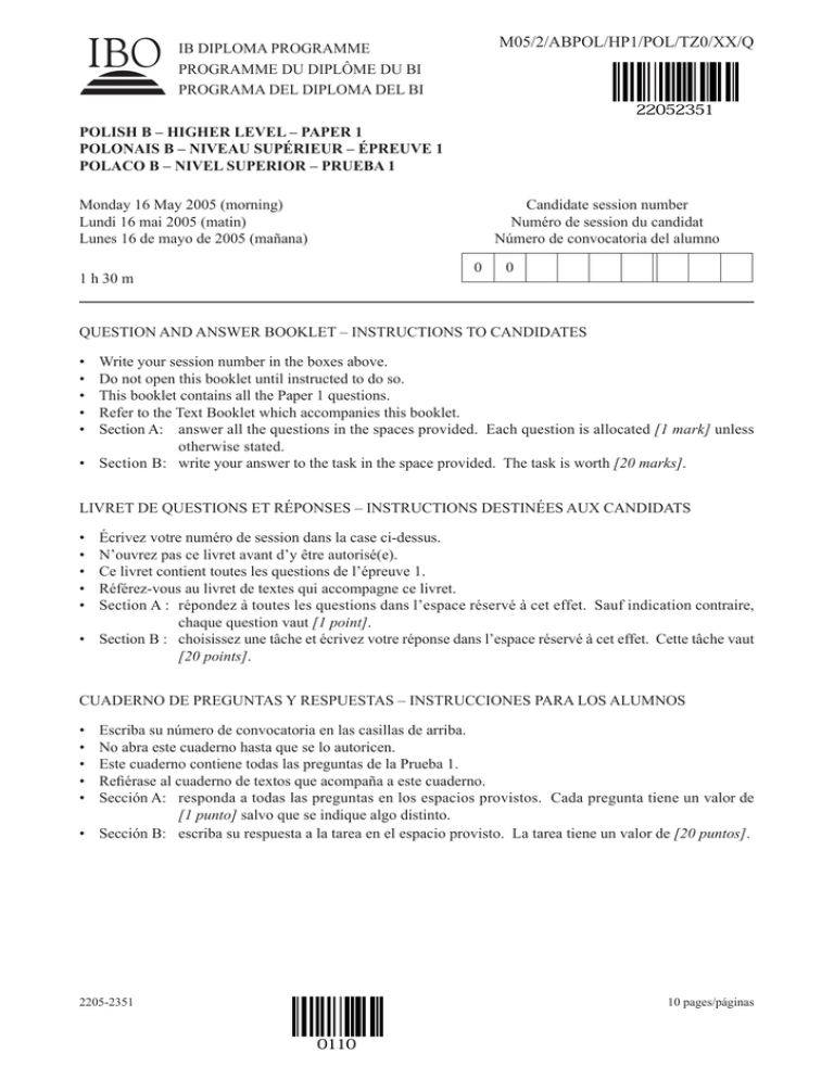 M05/2/ABPOL/HP1/POL/TZ0/XX/Q IB DIPLOMA PROGRAMME PROGRAMME DU DIPLÔME DU BI PROGRAMA DEL DIPLOMA DEL BI 22052351 POLISH B – HIGHER LEVEL – PAPER 1 POLONAIS B – NIVEAU SUPÉRIEUR – ÉPREUVE 1 POLACO B – NIVEL SUPERIOR – PRUEBA 1 Monday 16 May 2005 (morning) Lundi 16 mai 2005 (matin) Lunes 16 de mayo de 2005 (mañana) Candidate session number Numéro de session du candidat Número de convocatoria del alumno 0 1 h 30 m 0 QUESTION AND ANSWER BOOKLET – INSTRUCTIONS TO CANDIDATES • • • • • Write your session number in the boxes above. Do not open this booklet until instructed to do so. This booklet contains all the Paper 1 questions. Refer to the Text Booklet which accompanies this booklet. Section A: answer all the questions in the spaces provided. Each question is allocated [1 mark] unless otherwise stated. • Section B: write your answer to the task in the space provided. The task is worth [20 marks]. LIVRET DE QUESTIONS ET RÉPONSES – INSTRUCTIONS DESTINÉES AUX CANDIDATS • • • • • Écrivez votre numéro de session dans la case ci-dessus. N’ouvrez pas ce livret avant d’y être autorisé(e). Ce livret contient toutes les questions de l’épreuve 1. Référez-vous au livret de textes qui accompagne ce livret. Section A : répondez à toutes les questions dans l’espace réservé à cet effet. Sauf indication contraire, chaque question vaut [1 point]. • Section B : choisissez une tâche et écrivez votre réponse dans l’espace réservé à cet effet. Cette tâche vaut [20 points]. CUADERNO DE PREGUNTAS Y RESPUESTAS – INSTRUCCIONES PARA LOS ALUMNOS • • • • • Escriba su número de convocatoria en las casillas de arriba. No abra este cuaderno hasta que se lo autoricen. Este cuaderno contiene todas las preguntas de la Prueba 1. Refiérase al cuaderno de textos que acompaña a este cuaderno. Sección A: responda a todas las preguntas en los espacios provistos. Cada pregunta tiene un valor de [1 punto] salvo que se indique algo distinto. • Sección B: escriba su respuesta a la tarea en el espacio provisto. La tarea tiene un valor de [20 puntos]. 2205-2351 10 pages/páginas 0110 –2– M05/2/ABPOL/HP1/POL/TZ0/XX/Q SEKCJA A TEKST A – MAŁA CZARNA BŁYSKAWICZNA 1. Spośród zdań A - G tylko trzy są prawdziwe. Do kratek znajdujących się po lewej stronie wpisz tylko te litery, którymi oznaczono prawdziwe zdania. Uwaga: zdań jest więcej niż potrzebujesz. Przykład: D A. Tradycje picia kawy są różne w zależności od kraju. B. Kawę po turecku pija się tylko w Turcji. C. Polacy piją tylko kawę parzoną przez filtr. D. Kawa na wynos – to kawa pita poza kawiarnią. E. Błyskawiczny sposób serwowania kawy pochodzi z USA. F. W Polsce istnieje obecnie 20 kawiarni Coffee Heaven. G. Oprócz kawy w kawiarniach Coffee Heaven można też zjeść lunch i coś na słodko. Spośród odpowiedzi A, B, C, D wybierz tę, która jest poprawna. Wpisz ją do kratki znajdującej się po prawej stronie kartki. 2. Kawosz to osoba: A. B. C. D. 3. nie lubiąca pić kawy? lubiąca pić kawę? lubiąca pić czarną kawę? lubiąca specjalny rodzaj kawy? Raj to: A. B. C. D. ziemia niczyja? dziki zakątek? biblijna kraina szczęścia? miejsce tylko dla bogaczy? 2205-2351 0210 –3– 4. Centrum handlowe to? A. B. C. D. 5. M05/2/ABPOL/HP1/POL/TZ0/XX/Q miejsce, w którym znajdują się sklepy? miejsce, w którym znajdują się sklepy i kina? miejsce, w którym znajdują się sklepy i restauracje? miejsce, w którym znajdują sklepy, kina, restauracje? Serwowanie kawy to? A. B. C. D. podawanie kawy w kawiarni, itp? kupowanie kawy? sprzedawanie kawy? wytwarzanie kawy? Odpowiedz na następujące pytania związane z Tekstem A: 6. Którą kawę przygotowuje się w miedzianym naczyniu? ................................................................................ 7. Czym się różni cafe latte od kawy cappucino? ................................................................................ 8. Jak jest serwowana kawa po wiedeńsku? ................................................................................ 9. Jak przyrządza się kawę po irlandzku? ................................................................................ 10. Która kawa składa się z gorącego mleka i gorącej czekolady? ................................................................................ 11. Skąd pochodzi nazwa: kawa z filtra? ................................................................................ Turn over / Tournez la page / Véase al dorso 2205-2351 0310 –4– M05/2/ABPOL/HP1/POL/TZ0/XX/Q TEKST B – CURRICULUM VITAE Spośród odpowiedzi A, B, C, D wybierz tę, która jest poprawna. Wpisz ją do kratki znajdującej się po prawej stronie kartki. 12. Co to jest curriculum vitae? A. B. C. D. 13. W której osobie autor opowiada o sobie? A. B. C. D. 14. okupację sowiecką, okupację niemiecką, wyzwolenie, czasy powojenne. Co to znaczy ‘zaglądać śmierci w oczy’? A. B. C. D. 16. drugiej, trzeciej, bezosobowo, pierwszej. Na jaki okres historyczny przypadła jego młodość? A. B. C. D. 15. życiorys, podanie, list, prezentacja. być blisko niej, być od niej z dala, myśleć o niej, przywoływać ją. Dlaczego został poetą? A. B. C. D. dlatego, że był młody, dlatego, że skończył studia, dlatego, że musiał, dlatego, że była to błahostka. 2205-2351 0410 –5– 17. M05/2/ABPOL/HP1/POL/TZ0/XX/Q Które wyrażenie z 11 linijki wiersza jest równoznaczne z określeniem ‘dla rozgłosu?’ ................................................................................ 18. Znajdź dwa słowa z 18 linijki, za pomocą których poeta charakteryzuje swoje życie. ................................................................................ Turn over / Tournez la page / Véase al dorso 2205-2351 0510 –6– M05/2/ABPOL/HP1/POL/TZ0/XX/Q Po lewej stronie kartki umieszczono wyrazy pochodzące z wiersza Tadeusza Borowskiego ‘Curriculum vitae