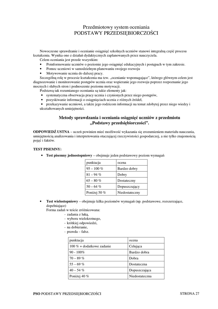Przedmiotowy system oceniania PODSTAWY PRZEDSIĘBIORCZOŚCI