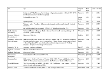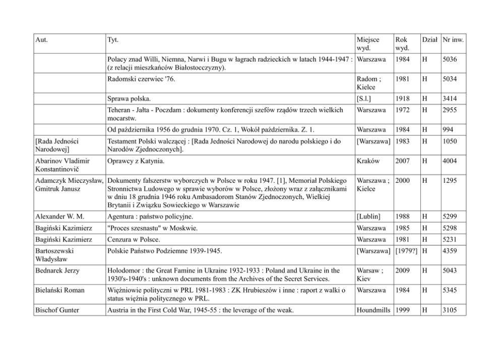 Aut. Tyt. Miejsce wyd. Rok wyd. Dział Nr inw. Polacy znad Willi, Niemna, Narwi i Bugu w łagrach radzieckich w latach 1944-1947 : Warszawa (z relacji mieszkańców Białostocczyzny). 1984 H 5036 Radomski czerwiec '76. Radom ; Kielce 1981 H 5034 Sprawa polska. [S.l.] 1918 H 3414 Teheran - Jałta - Poczdam : dokumenty konferencji szefów rządów trzech wielkich mocarstw. Warszawa 1972 H 2955 Od października 1956 do grudnia 1970. Cz. 1, Wokół października. Z. 1. Warszawa 1984 H 994 [Rada Jedności Narodowej] Testament Polski walczącej : [Rada Jedności Narodowej do narodu polskiego i do Narodów Zjednoczonych]. [Warszawa] 1983 H 1050 Abarinov Vladimir Konstantinovič Oprawcy z Katynia. Kraków 2007 H 4004 Adamczyk Mieczysław, Dokumenty fałszerstw wyborczych w Polsce w roku 1947. [1], Memoriał Polskiego Gmitruk Janusz Stronnictwa Ludowego w sprawie wyborów w Polsce, złożony wraz z załącznikami w dniu 18 grudnia 1946 roku Ambasadorom Stanów Zjednoczonych, Wielkiej Brytanii i Związku Sowieckiego w Warszawie Warszawa ; 2000 Kielce H 1295 Alexander W. M. Agentura : państwo policyjne. [Lublin] 1988 H 5299 Bagiński Kazimierz "Proces szesnastu" w Moskwie. Warszawa 1985 H 5298 Bagiński Kazimierz Cenzura w Polsce. Warszawa 1981 H 5231 Bartoszewski Władysław Polskie Państwo Podziemne 1939-1945. [Warszawa] [1979?] H 4359 Bednarek Jerzy Holodomor : the Great Famine in Ukraine 1932-1933 : Poland and Ukraine in the 1930's-1940's : unknown documents from the Archives of the Secret Services. Warsaw ; Kiev 2009 H 5043 Bielański Roman Więźniowie polityczni w PRL 1981-1983 : ZK Hrubieszów i inne : raport z walki o status więźnia politycznego w PRL. Warszawa 1984 H 5345 Bischof Gunter Austria in the First Cold War, 1945-55 : the leverage of the weak. Houndmills 1999 H 3105 [etc.] Branach Zbigniew Pierwszy grudzień Jaruzelskiego. [Toruń] 1998 H 3691 Braudel Fernand Czas świata. Warszawa 1992 H 2015 Braudel Fernand Struktury codzienności : możliwe i niemożliwe. Warszawa 1992 H 2014 Chmaj Marek, Sokół Wojciech, Wrona Janusz Historia : repetytorium dla kandydatów na studia prawnicze, historyczne, politologiczne i socjologiczne. Warszawa 2010 H 4319 Chmie Beata, Kaczyńska Elzbieta Postulaty 1970-71 i 1980 : materiały źródłowe do dziejów wystąpień pracowniczych w latach 1970-1971 i 1980 (Gdańsk i Szczecin). Warszawa 1998 H 1490 Ciechowski Jan M. Powstanie Warszawskie : zarys podłoża politycznego i dyplomatycznego. Warszawa 1987 H 3007 Ciołek Erazm Jan Stop kontrola : Stocznia Gdańska, sierpień 1980. Warszawa 1981 H 3690 Czeluścińska Beata Miejsca pamięci narodowej w Polsce : bezpieczeństwo i ochrona. Siedlce 2014 H 5438 Czubiński Antoni Historia Polski XX wieku. Poznań 2007 H 3089 Davies Norman Biały orzeł - czerwona gwiazda : wojna polsko-sowiecka 1919-1920. [Warszawa] [1988] H 5350 Davies Norman Boże igrzysko : historia Polski. T. 2, Od roku 1795. Kraków 1991 H 2278 Davies Norman Europa : rozprawa historyka z historią. Kraków 1998 H 2279 Dikötter Frank Wielki głód : tragiczne skutki polityki Mao 1958-1962. Wołowiec 2013 H 4003 Długołecki Jacek Waga stanu wojennego : studium dotyczące roli zamachu wojskowego dokonanego przez generała Wojciecha Jaruzelskiego... Gdańsk 2009 H 3024 Domański Paweł Tajne dokumenty Biura Politycznego : Grudzień 1970. Londyn 1991 H 2927 Drzycimski Andrzej, Skutnik Tadeusz Gdańsk Sierpień' 80 : rozmowy. Gdańsk 1990 H 3697 Dubiński Krzysztof Magdalenka : transakcja epoki : notatki z poufnych spotkań Kiszczak-Wałesa. Warszawa 1990 H 1237 Dudek Antoni Instytut : osobista historia IPN. Warszawa 2011 H 3148 Dziak Waldemar Janusz Pjongjang rok 1956. Warszawa 2010 H 3785 Edelman Marek Warszawa 1983 H 5308 Getto walczy : (udział Bundu w obronie getta warszawskiego). Eisler Jerzy "Polskie miesiące" czyli Kryzys(y) w PRL. Warszawa 2008 H 3681 Friszke Andrzej Polska : losy państwa i narodu : 1939-1989. Warszawa 2003 H 2393 Gałaszewska-Chilczuk Od przedszkola do studenta : kryteria selekcji społecznej i politycznej w edukacji lat Dorota, Wołoszyn 1947-1956. Jacek Witold Lublin 2012 H 3891 Garliński Józef Polskie Państwo Podziemne 1939-1945. Warszawa 1985 H 5339 Geller Mihail Âkovlevič Utopia u władzy : historia Związku Sowieckiego od roku 1917 do naszych czasów. Cz. 1, Do roku 1938. Warszawa 1986 H 5343 Geller Mihail Âkovlevič Utopia u władzy : historia Związku Sowieckiego od roku 1917 do naszych czasów. Cz. 2, 1939-1953. Warszawa 1986 H 5344 Gidwitz Betsy Wystąpienia robotnicze w ZSRR. Warszawa 1983 H 5347 Gluza Zbigniew, Madoń - Mitzner Katarzyna, Sołtysiak Grzegorz W stanie. Warszawa 1991 H 2018 Golcon Jacek Arkadiusz W obronie Europy : wojna bolszewicka z Rosją w 1920 roku. Toruń 2006 H 3289 Golka Marian Pamięć społeczna i jej implanty. Warszawa 2009 H 5444 Gross Jan Tomasz Wybory. Warszawa 1988 H 5340 Gross Jan Tomasz W zaborze sowieckim. [Warszawa] [1983] H 5338 Gross Jan Tomasz Okupacja sowiecka i deportacje do Rosji w oczach dzieci. Warszawa 1981 H 5306 Ivanov Nikolaj Powstanie Warszawskie widziane z Moskwy. Kraków 2010 H 2737 Jegliński Piotr Zapis rokowań gdańskich : Sierpień 1980. Paryż 1987 H 2317 Jegliński Piotr Grudzień 1970. Paryż 1986 H 956 Kamiński Andrzej Józef Koszmar niewolnictwa : obozy koncentracyjne od 1896 do dziś : analiza. Warszawa 1990 H 4449 Kasman Leon Konflikt z Moczarem. [Warszawa] 1986 H 5307 Kende Pierre Rozważania o historii Węgier. Warszawa 1985 H 5329 Kersten Krystyna Polska - probierz porozumień jałtańskich. Warszawa 1987 H 5333 Klochowicz Kazimierz Cztery niedotrzymane pakty. Szczecin [1984] H 5300 Komorowski Tadeusz Bór Armia podziemna. Cz. 2 Warszawa 1986 H 5302 Koneczny Feliks O ład w historii : z dodatkami o twórczości i wpływie Konecznego. Warszawa ; 1991 Struga H 1835 Kopacsi Sandor 13 dni nadziei : Węgry 1956. Warszawa [1983] H 4923 Korzeniewski Bartosz Narodowe i europejskie aspekty polityki historycznej : praca zbiorowa. Pozna
