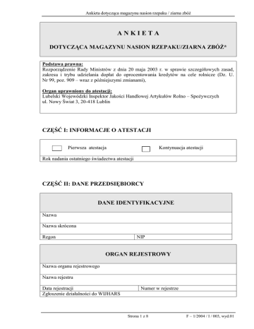 Ankieta dotycząca magazynu nasion rzepaku / ziarna zbóż ANKIETA DOTYCZĄCA MAGAZYNU NASION RZEPAKU/ZIARNA ZBÓŻ* Podstawa prawna: Rozporządzenie Rady Ministrów z dnia 20 maja 2003 r. w sprawie szczegółowych zasad, zakresu i trybu udzielania dopłat do oprocentowania kredytów na cele rolnicze (Dz. U. Nr 99, poz. 909 – wraz z późniejszymi zmianami), Organ uprawniony do atestacji: Lubelski Wojewódzki Inspektor Jakości Handlowej Artykułów Rolno – Spożywczych ul. Nowy Świat 3, 20-418 Lublin CZĘŚĆ I: INFORMACJE O ATESTACJI Pierwsza atestacja Kontynuacja atestacji Rok nadania ostatniego świadectwa atestacji CZĘŚĆ II: DANE PRZEDSIĘBIORCY DANE IDENTYFIKACYJNE Nazwa Nazwa skrócona Regon NIP ORGAN REJESTROWY Nazwa organu rejestrowego Nazwa rejestru Data rejestracji Zgłoszenie działalności do WIJHARS Numer w rejestrze Strona 1 z 8 F – 1/2004 / I / 003, wyd.01 Ankieta dotycząca magazynu nasion rzepaku / ziarna zbóż ADRES SIEDZIBY Województwo Powiat Gmina Miejscowość Kod Ulica Nr domu Nr lokalu Telefon Faks FORMA PRAWNA Osoba prawna Jednostka organizacyjna nie mająca osobowości prawnej Osoba fizyczna CZĘŚĆ III: DANE DOTYCZĄCE MAGAZYNU LOKALIZACJA MAGAZYNU Nazwa magazynu Województwo Gmina Ulica Telefon Powiat Poczta Miejscowość Kod pocztowy Nr domu Nr lokalu Faks Strona 2 z 8 F – 1/2004 / I / 003, wyd.01 Ankieta dotycząca magazynu nasion rzepaku / ziarna zbóż WAŻNIEJSZE DANE ORGANIZACYJNE DOTYCZĄCE MAGAZYNU STATUS PRAWNY Własność Współwłasność Dzierżawa Umowa najmu /użyczenia W PRZYPADKU DZIERŻAWY / UMOWY NAJMU / UŻYCZENIA: Imię i nazwisko właściciela lub przedsiębiorcy / nazwa: Województwo Powiat Gmina Miejscowość Kod pocztowy Ulica Nr domu Nr lokalu Telefon Faks Typ umowy Data zawarcia umowy Czas trwania umowy ZARZĄDZANIE MAGAZYNEM Czy zarządzający jest właścicielem i sam zarządza? Tak Nie Imię i nazwisko zarządzającego ......................................................................... LOKALIZACJA Czy magazyn zlokalizowany jest w rejonie charakteryzującym się dużą towarowością produkcji? Tak Nie Czy magazyn zlokalizowany jest z dala od obiektów uciążliwych dla środowiska? Tak Nie Strona 3 z 8 F – 1/2004 / I / 003, wyd.01 Ankieta dotycząca magazynu nasion rzepaku / ziarna zbóż ZATRUDNIENIE Stan zatrudnienia na stanowiskach związanych ze skupem Magazynier Ilość osób zatrudnionych na stałe Przewidywane zatrudnienie pracowników sezonowych Pracownicy magazynu Pracownicy laboratorium Rzeczoznawcy w zakresie pobierania próbek DANE DOTYCZĄCE STANU TECHNICZNO–TECHNOLOGICZNEGO I SANITARNEGO MAGAZYNU POJEMNOŚĆ I TYP MAGAZYNU Pojemność całkowita magazynu Typ magazynu Pojemność (ton) Sztuk Magazyn płaski Magazyn komorowy metalowy Magazyn komorowy żelbetonowy Inne Możliwość składowania więcej niż jednego rodzaju zboża Tak Nie DANE TECHNICZNE URZĄDZEŃ DO ROZŁADUNKU I ZAŁADUNKU SUROWCA Ważenie surowca Typ wagi Sztuk Nośność Numer wagi Data legali-zacji Waga samochodowa Waga kolejowa Waga automatyczna Strona 4 z 8 F – 1/2004 / I / 003, wyd.01 Ankieta dotycząca magazynu nasion rzepaku / ziarna zbóż TRANSPORT WEWNĘTRZNY SUROWCA Rodzaj urządzenia Sztuk Wydajność (tony/h) Typ Kosz zasypowy Kosz zasypowy z wywrotnicą samochodową Kosz zasypowy z wywrotnicą kolejową Transport pionowy Transport poziomy DANE TECHNICZNE URZĄDZEŃ DO KONSERWACJI SUROWCA Czyszczenie Sztuk Typ Wydajność (tony/h) Forma własności Typ Wydajność (tony/h) Forma własności Czyszczenie wstępne Czyszczenie szczegółowe Suszenie, przewietrzanie i chłodzenie Suszarnia I Suszarnia II Suszarnia III Przewietrzanie i chłodzenie Wydajność suszarni podać w tonach/h przy obniżeniu wilgotności o 6% W przypadku usługowego czyszczenia lub suszenia nasion rzepaku/ziarna zbóż* podać: typ umowy: ..................................................................................................... numer i datę zawarcia umowy: ....................................................................... nazwę i dokładny adres usługodawcy: ........................................................... ......................................................................................................................... Strona 5 z 8 F – 1/2004 / I / 003, wyd.01 Ankieta dotycząca magazynu nasion rzepaku / ziarna zbóż STAN TECHNICZNY MAGAZYNU Stan techniczny magazynu – uwagi przedsiębiorcy: ................................................................................................................................. ................................................................................................................................. ................................................................................................................................. Stan techniczny maszyn i urządzeń zainstalowanych w magazynie – uwagi przedsiębiorcy: ................................................................................................................................. ................................................................................................................................. ................................................................................................................................. Warunki BHP i wyposażenie w sprzęt zapewniający ich przestrzeganie, zgodne z obowiązującymi przepisami – uwagi przedsiębiorcy: ................................................................................................................................. ................................................................................................................................. ................................................................................................................................. Warunki p.poż. i wyposażenie w sprzęt zapewniający ich przestrzeganie, zgodne z obowiązującymi przepisami – uwagi przedsiębiorcy: ...