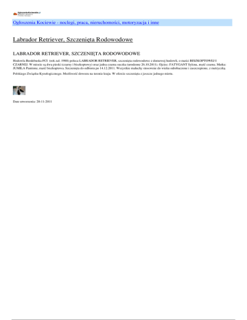 Ogłoszenia Kociewie - noclegi, praca, nieruchomości, motoryzacja i inne Labrador Retriever, Szczenięta Rodowodowe LABRADOR RETRIEVER, SZCZENIĘTA RODOWODOWE Hodowla Berdebuska FCI (rok zał. 1988) poleca LABRADOR RETRIEVER, szczenięta rodowodowe z domowej hodowli, o maści BISZKOPTOWEJ I CZARNEJ. W miocie są dwa pieski (czarny i biszkoptowy) oraz jedna czarna suczka (urodzone 26.10.2011). Ojciec: FATYGANT Sylena, maść czarna. Matka: JUMILA Pamtone, maść biszkoptowa. Szczenięta do odbioru po 14.12.2011. Wszystkie maluchy stosownie do wieku odrobaczone i zaszczepione, z metryczką Polskiego Związku Kynologicznego. Możliwość dowozu na terenie kraju. W ofercie szczenięta z jeszcze jednego miotu. Date utworzenia: 20-11-2011