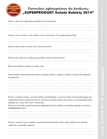 Nazwa i adres firmy zgłaszającej produkt lub serię produktów .................................................................................................................................................................................................................................... .................................................................................................................................................................................................................................... .................................................................................................................................................................................................................................... Kontakt: imię, nazwisko, numer telefonu oraz e-mail osoby z firmy zgłaszającej produkt .................................................................................................................................................................................................................................... .................................................................................................................................................................................................................................... Marka produktu (pełna nazwa) oraz nazwa producenta .................................................................................................................................................................................................................................... .................................................................................................................................................................................................................................... Średnia cena rynkowa za sztukę (proszę podać również wartość słownie) .................................................................................................................................................................................................................................... Data wprowadzenia produktu na polski rynek ......................................................................................................................................................................................................................... Opis produktu (maksymalnie dwa zdania opisujące produkt) – zgodny z opisem ma płycie CD dołączonej do zgłoszenia .................................................................................................................................................................................................................................... .................................................................................................................................................................................................................................... .................................................................................................................................................................................................................................... .................................................................................................................................................................................................................................... .................................................................................................................................................................................................................................... Prosimy o podanie imienia, nazwiska, telefonu kontaktowego, e-mail oraz adresu korespondencyjnego dla maksymalnie dwóch przedstawicieli firmy, do których zostaną wysłane zaproszenia na uroczystą Galę, która odbędzie się w lutym 2015 roku w Warszawie. Powinny to być osoby upoważnione przez zgłaszającą firmę do odbioru ewentualnej nagrody w konkursie SUPERPRODUKT 2014. .................................................................................................................................................................................................................................... .................................................................................................................................................................................................................................... .................................................................................................................................................................................................................................... Prosimy o podanie nazwy produktu i producenta lub dystrybutora, które mają znaleźć się na statuetce i dyplomie w przypadku wygranej. .................................................................................................................................................................................................................................... .................................................................................................................................................................................................................................... .................................................................................................................................................................................................................................... Formularz zgłoszeniowy do konkursu „SUPERPRODUKT Świata Kobiety 2014” Formularz zgłoszeniowy do konkursu „SUPERPRODUKT Świata Kobiety 2014” (prosimy o wpisanie nazwy zgłaszanego produktu i zaznaczenie właściwej kategorii lub podkategorii): I. KOSMETYKI Nazwa podkategorii: Włosy Ciało Zabiegi kosmetyczne Makijaż Pielęgnacja twarzy Apteczne – pielęgnacja ciała Apteczne – pielęgnacja twarzy Zapachy Dla mężczyzn II. ARTYKUŁY HIGIE