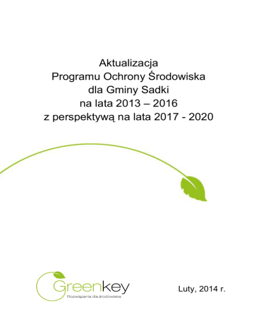 Aktualizacja Programu Ochrony Środowiska dla Gminy Sadki na lata 2013 – 2016 z perspektywą na lata 2017 - 2020 Luty, 2014 r. Zamawiający: Gmina Sadki Urząd Gminy w Sadkach ul. Strażacka 11 89 – 110 Sadki Wykonawca: Green Key ul. Nowy Świat 10a/15 60 - 583 Poznań www.greenkey.pl Aktualizacja Programu Ochrony Środowiska dla Gminy Sadki na lata 2013 – 2016 z perspektywą na lata 2017 - 2020 Kierownik projektu: mgr Joanna Masiota Autorzy opracowania: mgr Joanna Masiota mgr Andrzej Karkowski mgr Joanna Walkowiak Luty, 2014 r. Green K e y Aktualizacja Programu Ochrony Środowiska dla Gminy Sadki na lata 2013 – 2016 z perspektywą na lata 2017 - 2020 SPIS TREŚCI I. WSTĘP ................................................................................................................................................. 7 1.1. 1.2. 1.3. PRZEDMIOT I ZAKRES OPRACOWANIA ....................................................................................7 POTRZEBA I CEL OPRACOWANIA .............................................................................................7 METODA OPRACOWYWANIA PROGRAMU ...............................................................................8 II. CHARAKTERYSTYKA GMINY .................................................................................................... 9 2.1. 2.2. 2.3. 2.4. 2.5. 2.6. 2.7. DANE ADMINISTRACYJNE ..........................................................................................................9 POŁOŻENIE GEOGRAFICZNE .................................................................................................. 11 SPOŁECZEŃSTWO.................................................................................................................... 11 2.3.1. Liczba ludności i jej rozmieszczenie ....................................................................... 11 2.3.2. Przyrost naturalny ................................................................................................... 13 2.3.3. Struktura ekonomiczna ........................................................................................... 14 UŻYTKOWANIE TERENU .......................................................................................................... 14 DZIAŁALNOŚĆ GOSPODARCZA .............................................................................................. 15 ROLNICTWO .............................................................................................................................. 17 TURYSTYKA I REKREACJA ...................................................................................................... 18 III. INFRASTRUKTURA GMINY ...................................................................................................... 18 3.1. GOSPODARKA WODNO – ŚCIEKOWA .................................................................................... 18 3.1.1. Zaopatrzenie w wodę.............................................................................................. 18 3.1.2. Gospodarka ściekowa ............................................................................................ 19 3.1.2.1. Sieć kanalizacyjna i odprowadzanie ścieków .................................................... 19 3.1.2.2. Odprowadzanie wód opadowych i roztopowych ............................................... 21 3.1.2.3. Komunalne oczyszczalnie ścieków ................................................................... 21 3.1.2.4. Systemy indywidualne gospodarki ściekowej.................................................... 22 3.1.2.4.1. Zbiorniki bezodpływowe ............................................................................... 23 3.1.2.4.2. Przydomowe oczyszczalnie ścieków ........................................................... 24 ELEKTROENERGETYKA ORAZ ŹRÓDŁA ENERGII ODNAWIALNEJ ..................................... 24 INSTALACJE EMITUJĄCE POLA ELEKTROMAGNETYCZNE ................................................. 26 GAZOWNICTWO ........................................................................................................................ 26 CIEPŁOWNICTWO ..................................................................................................................... 26 KOMUNIKACJA .......................................................................................................................... 27 3.6.1. Drogi ....................................................................................................................... 27 3.6.1.1. Drogi krajowe ..................................................................................................... 27 3.6.1.2. Drogi powiatowe ................................................................................................ 27 3.6.1.3. Drogi gminne ..................................................................................................... 27 3.6.2. Kolej ........................................................................................................................ 28 GOSPODARKA ODPADAMI W GMINIE .................................................................................... 28 3.7.1. Instalacje do odzysku i unieszkodliwiania odpadów ......................................................... 29 3.2. 3.3. 3.4. 3.5. 3.6. 3.7. IV. OCENA I ANALIZA STANU ŚRODOWISKA PRZYRODNICZEGO ......................................... 30 4.1. RZEŹBA TERENU ...................................................................................................................... 30 4.1.1. Zagrożenia powierzchni ziemi ................................................................................ 30 BUDOWA GEOLOGICZNA......................................................................................................... 31 4.2.1. Surowce mineralne ................................................................................................. 33 GLEBY ....................................