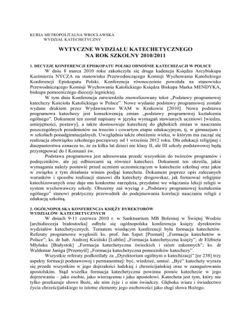 KURIA METROPOLITALNA WROCŁAWSKA WYDZIAŁ KATECHETYCZNY WYTYCZNE WYDZIAŁU KATECHETYCZNEGO NA ROK SZKOLNY 2010/2011 1. DECYZJE KONFERENCJI EPISKOPATU POLSKI ODNOŚNIE KATECHIZACJI W POLSCE W dniu 8 marca 2010 roku zakończyła się druga kadencja Księdza Arcybiskupa Kazimierza NYCZA na stanowisku Przewodniczącego Komisji Wychowania Katolickiego Konferencji Episkopatu Polski. Konferencja równocześnie powołała na stanowisko Przewodniczącego Komisji Wychowania Katolickiego Księdza Biskupa Marka MENDYKA, biskupa pomocniczego diecezji legnickiej. W tym dniu Konferencja zatwierdziła znowelizowany tekst „Podstawy programowej katechezy Kościoła Katolickiego w Polsce”. Nowe wydanie podstawy programowej zostało wydane drukiem przez Wydawnictwo WAM w Krakowie [2010]. Nowa podstawa programowa katechezy jest konsekwencją zmian „podstawy programowej kształcenia ogólnego”. Dokument ten został napisany w języku wymagań stawianych uczniowi [wiedza, umiejętności, postawy], a także dostosowuje katechezę do głębokich zmian w nauczaniu poszczególnych przedmiotów na trzecim i czwartym etapie edukacyjnym, tj. w gimnazjum i w szkołach ponadgimnazjalnych. Uwzględnia także obniżenie wieku, w którym ma zacząć się realizacja obowiązku szkolnego począwszy od 1 września 2012 roku. Dla edukacji religijnej i duszpasterstwa oznacza to, że za kilka lat dzieci nie klasy II, ale III szkoły podstawowej będą przystępować do I Komunii św. Podstawa programowa jest adresowana przede wszystkim do twórców programów i podręczników, ale jej odbiorcami są również katecheci. Dokument ten określa, jakie wymagania należy postawić przed uczniem uczestniczącym w katechezie szkolnej oraz jakie w związku z tym działania winien podjąć katecheta. Dokument poprzez opis zalecanych warunków i sposobu realizacji stanowi dla katechety drogowskaz, jak formować religijnie katechizowanych oraz daje mu konkretne narzędzia, przydatne we włączaniu lekcji religii w system wychowawczy szkoły. Obszerny zaś wyciąg z „Podstawy programowej kształcenia ogólnego” stanowi praktyczny przewodnik do podejmowania korelacji nauczania religii z edukacją szkolną. 2. OGÓLNOPOLSKA KONFERENCJA KSIĘŻY DYREKTORÓW WYDZIAŁÓW KATECHETYCZNYCH W dniach 9-11 czerwca 2010 r. w Sanktuarium MB Bolesnej w Świętej Wodzie [archidiecezja białostocka] odbyła się ogólnopolska konferencja księży dyrektorów wydziałów katechetycznych. Tematem wiodącym konferencji była formacja katechetów. Referaty programowe wygłosili ks. prof. Jan Szpet [Poznań] „Formacja katechetów w Polsce”; ks. dr hab. Andrzej Kiciński [Lublin] „Formacja katechetyczna księży”; dr Elżbieta Młyńska [Białystok] „Formacja katechetyczna świeckich i sióstr zakonnych”; ks. dr Waldemar Janiga [Przemyśl] „Formacja katechetyczna pomocników katechezy”. Wszystkie referaty podkreślały za „Dyrektorium ogólnym o katechizacji” [nr 238] trzy aspekty formacji podstawowej i permanentnej: być, wiedzieć, umieć. „Być” katechety wyraża się przede wszystkim w jego dojrzałości ludzkiej i chrześcijańskiej oraz w zaangażowaniu apostolskim. Stąd wszelka formacja katechetyczna powinna pomóc katechecie w jego dojrzewaniu – jako osobie, jako wierzącemu i jako apostołowi. Katecheta jest tym, który nie tylko przekazuje słowo Boże, ale nim żyje i o nim świadczy. Głęboka wiara i świadectwo życia chrześcijańskiego to istotne elementy jego osobowości jako sługi słowa Bożego. 2 Podkreślono też potrzebę profesjonalizmu w posługiwaniu katechety [„wiedzieć” i „umieć działać”]. Katecheta chcąc dobrze wypełnić swoje zadanie musi znać dogłębnie orędzie Boże, które przekazuje, adresatów, do których to orędzie kieruje oraz kontekst społeczny, w jakim przekaz katechetyczny ma miejsce. Dlatego musi odznaczać się solidnym przygotowaniem biblijno-teologicznym, a także znajomości psychologii, pedagogiki, socjologii i dydaktyki. Mówiąc o kondycji polskich katechetów podkreślono, że są oni wykształceni, zaangażowani w szkole i parafii. Nasilenie tego zaangażowania jest zauważalne zwłaszcza w okresie awansu zawodowego. W trosce o przyszłość katechetów zwrócono uwagę na potrzebę budzenia powołań osób świeckich do posługi katechetycznej. Obecnie w polskich szkołach jest zatrudnionych 33.492 katechetów, w tym 18.348 świeckich, 11.382 księży diecezjalnych, 2610 sióstr zakonnych i 1152 księży zakonnych i braci. 3. PERMANENTNY OBOWIĄZEK LEGITYMOWANIA SIĘ MISJĄ KANONICZNĄ PRZEZ KATECHETĘ Dokumentem o najbardziej podstawowym znaczeniu, umożliwiającym w obecnym stanie prawnym zatrudnienie nauczyciela religii w szkołach, jest misja kanoniczna, czyli imienne skierowanie do nauczania w określonej szkole wydane przez kompetentną władzę kościelną [zob. kan. 805 K.P.K.; konkordat z dn. 28 VII 1993 r., art. 12 ust 3; rozporządzenie MEN z dn. 14 IV 1992 r. § 5]. Wymóg posiadania przez nauczyciela religii misji kanonicznej podyktowany jest tym, że biskup diecezjalny musi mieć wpływ na obsadę stanowiska katechety, gdyż katecheta nie jest tylko nauczycielem i wychowawcą, ale przede wszystkim naucza prawd wiary, które stanowią depozyt Kościoła katolickiego. Zatem misja kanoniczna jest gwarantem wierności danego katechety doktrynie Kościoła, który go desygnował do pełnienia posługi słowa. Obowiązek legitymowania się przez katechetę aktualną misją kanoniczną do nauczania w danej szkole ma charakter permanentny tzn., że winien on legitymować się jej posiadaniem podczas całego okresu zatrudnienia. Wygaśnięcie misji kanonicznej jednorocznej przy zatrudnieniu na czas określony lub pięcioletniej przy zatrudnieniu na czas nieokreślony lub przez mianowanie powoduje konieczność ustąpienia z zajmowanego stanowiska chyba, że nastąpi jej przedłużenie. A zatem sama umowa o pracę na czas określony i nieokreślony 