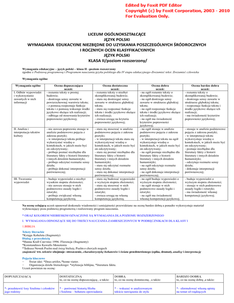 LICEUM OGÓLNOKSZTAŁCĄCE JĘZYK POLSKI WYMAGANIA EDUKACYJNE NIEZBĘDNE DO UZYSKANIA POSZCZEGÓLNYCH ŚRÓDROCZNYCH I ROCZNYCH OCEN KLASYFIKACYJNYCH JĘZYK POLSKI KLASA II/poziom rozszerzony/ Wymagania edukacyjne – j zyk polski – klasa II –poziom rozszerzony zgodne z Podstaw programow i Programem nauczania j zyka polskiego dla IV etapu edukacyjnego-Zrozumieć tekst. Zrozumieć człowieka Wymagania ogólne Wymagania ogólne Ocena dopuszczaj ca ucze Ś - rozumie teksty o prostej budowie; - dostrzega sensy zawarte w powierzchownej warstwie tekstu; - z pomoc rozpoznaje funkcje tekstu i z pomoc wskazuje rodki j zykowe słu ce ich realizacji; - odbiega od stosowania kryteriów poprawno ci j zykowejś Ocena dostateczna ucze Ś - rozumie teksty o niezbyt skomplikowanej budowie; - stara si dostrzegać sensy zawarte w strukturze gł bokiej tekstu; - stara si rozpoznać funkcje tekstu i rodki j zykowe słu ce ich realizacji; - zwraca uwag na kryteria poprawno ci j zykowejś II. Analiza i interpretacja tekstów kultury - nie zawsze poprawnie stosuje w analizie podstawowe poj cia z zakresu poetyki; - w interpretacji tekstu próbuje wykorzystać wiedz o kontekstach, w jakich mo e być on odczytywany; - próbuje poznać niezb dne dla literatury fakty z historii literatury i innych dziedzin humanistyki; - próbuje odczytać rozmaite sensy dziełaś - próbuje dokonać interpretacji porównawczejś III. Tworzenie wypowiedzi - buduje wypowiedzi o niezbyt wysokim stopniu zło ono ciś - nie zawsze stosuje w nich podstawowe zasady logiki i retoryki; - próbuje zwi kszać własn kompetencj j zykow . - stara si stosować w analizie podstawowe poj cia z zakresu poetyki; - w interpretacji tekstu stara si wykorzystywać wiedz o kontekstach, w jakich mo e być on odczytywany; - stara si poznać niezb dne dla literatury fakty z historii literatury i innych dziedzin humanistyki; - stara si odczytać rozmaite sensy dziełaś - stara si dokonać interpretacji porównawczejś - stara si budować wypowiedzi o wy szym stopniu zło ono ciś - stara si stosować w nich podstawowe zasady logiki i retoryki; - zwraca uwag na własn kompetencj j zykow . I. Odbiór wypowiedzi i wykorzystanie zawartych w nich informacji Ocena dobra ucze Ś - na ogół rozumie teksty o skomplikowanej budowie; - na ogół dostrzega sensy zawarte w strukturze gł bokiej tekstu; - na ogół rozpoznaje funkcje tekstu i rodki j zykowe słu ce ich realizacji; - na ogół ma wiadomo ć kryteriów poprawno ci j zykowejś - na ogół stosuje w analizie podstawowe poj cia z zakresu poetyki; - w interpretacji tekstu na ogół wykorzystuje wiedz o kontekstach, w jakich mo e być on odczytywany; - na ogół poznaje niezb dne dla literatury fakty z historii literatury i innych dziedzin humanistyki; - na ogół odczytuje rozmaite sensy dziełaś - na ogół dokonuje interpretacji porównawczejś - na ogół buduje wypowiedzi o wy szym stopniu zło ono ciś - na ogół stosuje w nich podstawowe zasady logiki i retoryki; - na ogół ma wiadomo ć własnej kompetencji j zykowej. Ocena bardzo dobra ucze Ś - rozumie teksty o skomplikowanej budowie; - dostrzega sensy zawarte w strukturze gł bokiej tekstuś - rozpoznaje funkcje tekstu i rodki j zykowe słu ce ich realizacji; - ma wiadomo ć kryteriów poprawno ci j zykowejś - stosuje w analizie podstawowe poj cia z zakresu poetykiś - w interpretacji tekstu wykorzystuje wiedz o kontekstach, w jakich mo e być on odczytywany; - poznaje niezb dne dla literatury fakty z historii literatury i innych dziedzin humanistyki; - odczytuje rozmaite sensy dziełaś - dokonuje interpretacji porównawczejś - buduje wypowiedzi o wy szym stopniu zło ono ciś - stosuje w nich podstawowe zasady logiki i retoryki; - ma wiadomo ć własnej kompetencji j zykowej. Na ocen celuj c ucze opanował doskonale wiadomo ci i umiej tno ci przewidziane na ocen bardzo dobr a ponadto wykorzystuje materiał wykraczaj cy poza podstaw programow i realizowany program nauczania. * ORAZ KOLOREM NIEBIźSKIM OZNACZONź S WYMAGANIA DLA POZIOMU ROZSZERZONEGO I. WYMAGANIA ODNOSZ Cź SI DO TRź CI NAUCZANIA ZAMIESZCZONYCH W PODR CZNIKACH DLA KLASY I 1.BIBLIA Teksty literackie *Ksi ga Koheleta (fragmenty) Dialog z przeszło ci *Hanna Krall Czerwiec 1996. Florencja (fragmenty) *Konstandinos Kawafis Monotonia *Tadeusz Nowak Psalm nad nieg bielszy, Psalm o chorych nogach znajomo ć ww. tekstów obejmuje: streszczenie, charakterystyk bohaterów i wiata przedstawionego (epika, dramat), analiz i interpretacj Poj cia kluczowe − wiat idei: *Deus artifex,*homo viator. − Organizacja dzieła literackiego: *stylizacja biblijna, *literatura faktu. Ucze powinien na ocen Ś DOPUSZCZAJ C DOSTATźCZN to, co na ocen dopuszczaj c , a tak eŚ DOBR to, co na ocen dostateczn , a tak eŚ BARDZO DOBR to, co na ocen dobr ,a tak eŚ *- przedstawić losy Szulima i członków jego rodziny * – porównać histori Hioba i Szulima – bohatera opowiadania * – wskazać w analizowanym tek cie nawi zania do stylu *– sformułować własn opini na temat sił rz dz cych * – obja nić sens wyrazu „ marno ć” w kontek cie ksi gi biblijnej * – wskazać aluzje i nawi zania biblijne w Psalmie nad nieg bielszym *– obja nić tytuł wiersza Nowaka (Psalm nad nieg bielszy *– wyja nić, na czym polega warto ć faktograficzna omawianego opowiadania * – odszukać w tek cie biblijnym i zinterpretować aforyzmy wyra aj ce prawdyo wiecie i człowieku * – odszukać i nazwać rodki j zykowe buduj ce stylizacj biblijn w Psalmie nad nieg bielszym *– wyja nić, na czym polega reinterpretacja psalmu biblijnego w wierszu biblijnego *– zinterpretować symboliczne znaczenie tafli lodowych upami tniaj cych ofiary Holokaustu * – obja nić tytuł Ksi gi Koheleta (Eklezjasty) oraz wskazać jej genez i czas powstania *– wskazać j zykowe rodki stylistyczne podkre laj ce refleksyjny charakter analizowanych tekstów * – samodzielnie zinterpretować Psalm o chorych nogach, odczytuj c 
