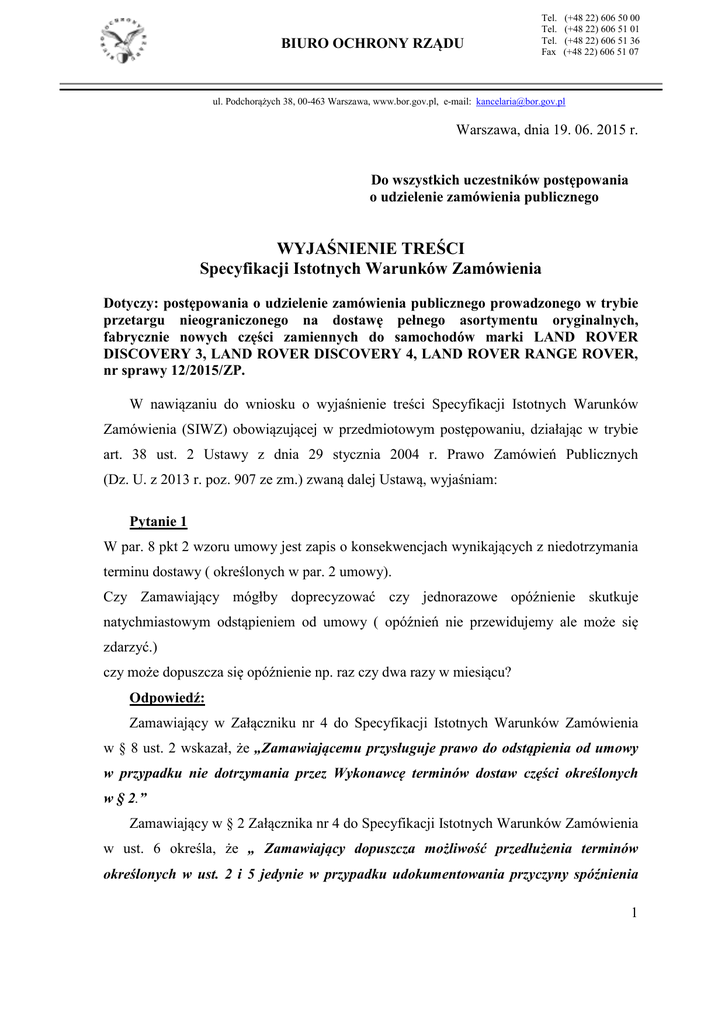 BIURO OCHRONY RZĄDU Tel. Tel. Tel. Fax (+48 22) 606 50 00 (+48 22) 606 51 01 (+48 22) 606 51 36 (+48 22) 606 51 07 ul. Podchorążych 38, 00-463 Warszawa, www.bor.gov.pl, e-mail: [email protected] Warszawa, dnia 19. 06. 2015 r. Do wszystkich uczestników postępowania o udzielenie zamówienia publicznego WYJAŚNIENIE TREŚCI Specyfikacji Istotnych Warunków Zamówienia Dotyczy: postępowania o udzielenie zamówienia publicznego prowadzonego w trybie przetargu nieograniczonego na dostawę pełnego asortymentu oryginalnych, fabrycznie nowych części zamiennych do samochodów marki LAND ROVER DISCOVERY 3, LAND ROVER DISCOVERY 4, LAND ROVER RANGE ROVER, nr sprawy 12/2015/ZP. W nawiązaniu do wniosku o wyjaśnienie treści Specyfikacji Istotnych Warunków Zamówienia (SIWZ) obowiązującej w przedmiotowym postępowaniu, działając w trybie art. 38 ust. 2 Ustawy z dnia 29 stycznia 2004 r. Prawo Zamówień Publicznych (Dz. U. z 2013 r. poz. 907 ze zm.) zwaną dalej Ustawą, wyjaśniam: Pytanie 1 W par. 8 pkt 2 wzoru umowy jest zapis o konsekwencjach wynikających z niedotrzymania terminu dostawy ( określonych w par. 2 umowy). Czy Zamawiający mógłby doprecyzować czy jednorazowe opóźnienie skutkuje natychmiastowym odstąpieniem od umowy ( opóźnień nie przewidujemy ale może się zdarzyć.) czy może dopuszcza się opóźnienie np. raz czy dwa razy w miesiącu? Odpowiedź: Zamawiający w Załączniku nr 4 do Specyfikacji Istotnych Warunków Zamówienia w § 8 ust. 2 wskazał, że „Zamawiającemu przysługuje prawo do odstąpienia od umowy w przypadku nie dotrzymania przez Wykonawcę terminów dostaw części określonych w § 2.” Zamawiający w § 2 Załącznika nr 4 do Specyfikacji Istotnych Warunków Zamówienia w ust. 6 określa, że „ Zamawiający dopuszcza możliwość przedłużenia terminów określonych w ust. 2 i 5 jedynie w przypadku udokumentowania przyczyny spóźnienia 1 nie leżącego po stronie Wykonawcy.” Zamawiający nie określa częstotliwości wystąpienia takich zdarzeń, nie mniej jednak wskazuje w tym zapisie, w jakim przypadku tylko i wyłącznie dopuszcza możliwość przedłużenia terminów. Pytanie 2 Czy przefaksowane przez nas zaświadczenia producenta oryginalnych części zamiennych nie oznaczone znakiem towarowym LAND ROVER ( pkt 3 SIWZ) spełniają wymogi Zamawiającego?. Zaświadczenie – treść załącznika nr 1: „...Zaświadczenie Zaświadczenie wydane w oparciu o Regulację Wyłączeń Blokowych Nr 461/2010 i stanowiących suplement wytycznych (210/C 138/5) Paragrafy 19 & 20 Niniejszym zaświadczamy, że produkowane przez TRW Automotive elementy układów hamulcowych, układów kierowniczych i zawieszeń spełniają wymagane prawnie normy bezpieczeństwa. Tym samym oświadczamy, że oryginalne części produkowane przez TRW Automotive mogą znaleźć, zgodnie z ich przeznaczeniem, zastosowanie w przeglądach okresowych i naprawach pojazdów silnikowych.” „...Certyfikat jakości części zgodnie z punktem 19 i 20 uzupełniających wytycznych w sprawie ograniczeń wertykalnych w porozumieniach dotyczących sprzedaży i napraw pojazdów silnikowych oraz dystrybucji części zamiennych do pojazdów silnikowych (28.05.2010) Nasze produkty marki LuK, INA i FAG spełniają wymogi użycia części zamiennych w szczególności dla napraw i przeglądów dokonywanych w „autoryzowanych warsztatach”. Nasze oryginalne części są tej samej jakości co części użyte podczas pierwszego montażu pojazdu i zostały wyprodukowane zgodnie z wytycznymi i standardami produkcji producenta pojazdu, oferowane przez nas części odpowiadające pod względem jakości częściom użytym do pierwszego montażu, spełniają wymogi dotyczące jakości zawarte w punkcie 20 wytycznych. <Niniejszy certyfikat zastępuje certyfikat w rozumieniu RWG 1400/2002, który wygasł 31.05.2010.>” 2 Odpowiedź Zamawiający w dniu 10. 06. 2015 r. w Rozdziale 6 Wykaz oświadczeń i dokumentów, jakie mają dostarczyć Wykonawcy w celu potwierdzania spełniania warunków udziału w postępowaniu, w pkt 3 dokonał zmiany treści SIWZ i wskazał że wymaga: „Wykonawcy oferujący oryginalne części zamienne nie oznaczone znakiem towarowym LAND ROVER i numerami katalogowymi LAND ROVER muszą przedstawić zaświadczenie producenta tych części, że zostały one wyprodukowane zgodnie ze specyfikacjami i standardami produkcyjnymi ustalonymi przez producenta danych pojazdów i są one tej samej jakości, co części stosowane do montażu tych pojazdów.” Wobec powyższego w celu potwierdzenia, że oferowana dostawa spełnia wymagania Zamawiającego, Wykonawca oferujący oryginalne części zamienne nie oznaczone znakiem towarowym LAND ROVER i numerami katalogowymi LAND ROVER zobowiązany jest dostarczyć Zamawiającemu dokument producenta tych części o wskazanej powyżej treści. Przedmiotowe wyjaśnienie treści SIWZ jest wiążące dla uczestników postępowania i należy je uwzględnić w składanej ofercie. 3