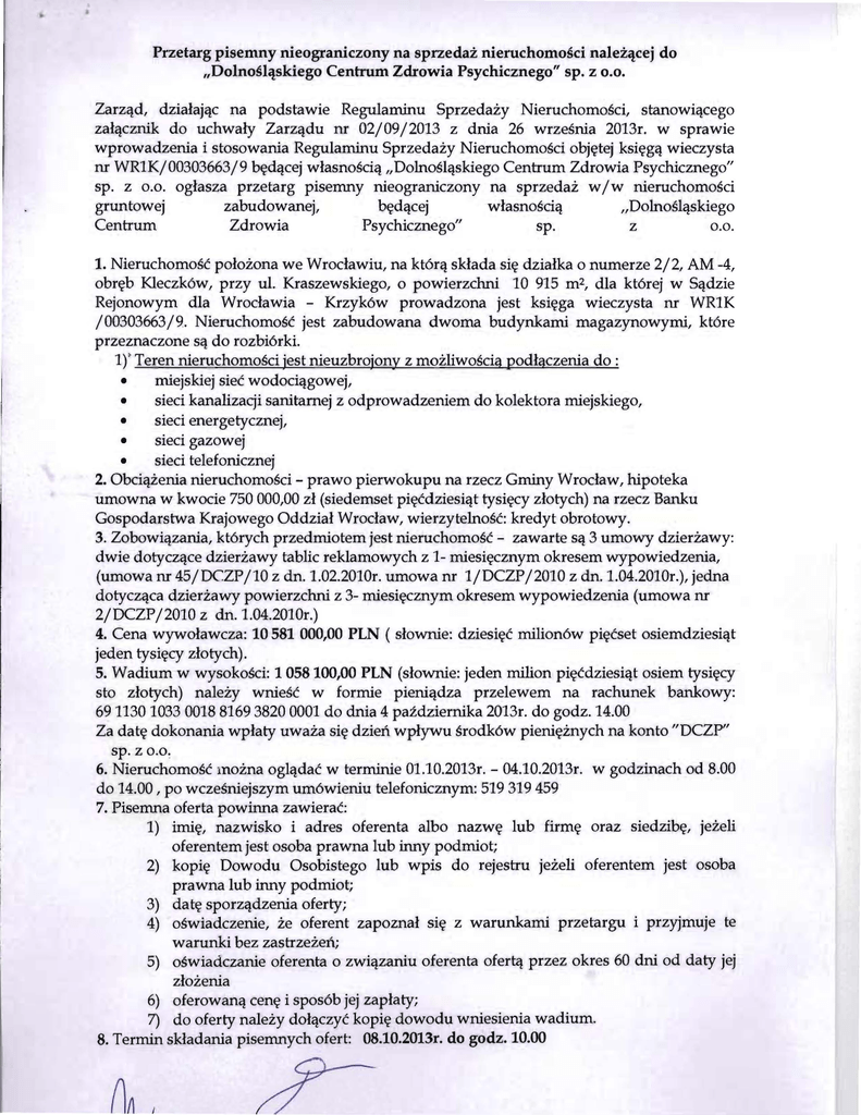Przetarg pisemny nieograniczony na sprzedaz nieruchomosci nalez'lcej do "Dolnosl'lskiego Centrum Zdrowia Psychicznego" sp. z 0.0. Zarz'ld, dzialaj'lc na podstawie Regulaminu Sprzedazy Nieruchomosci, stanowi'lcego za1'lcznik do uchwaly Zarz'ldu nr 02/09/2013 z dnia 26 wrzesnia 2013r. w sprawie wprowadzenia i stosowania Regulaminu Sprzedazy Nieruchomosci obj~tej ksi~g'l wieczysta nr WR1K/00303663/9 b~d'lcej wlasnosci'l "Dolnosl'lskiego Centrum Zdrowia Psychicznego" sp. z 0.0. oglasza przetarg pisemny nieograniczony na sprzedaz w /w nieruchomosci gruntowej zabudowanej, b~d'lcej wlasnosci'l "Dolnosl'lskiego Centrum Zdrowia Psychicznego" sp. z 0.0. 1. Nieruchomosc polozona we Wrodawiu, na kt6r'l sklada si~ dzialka 0 numerze 2/2, AM -4, obr~b Kleczk6w, przy ul. Kraszewskiego, 0 powierzchni 10 915 m 2, dla kt6rej w S'ldzie Rejonowym dla Wrodawia - Krzyk6w prowadzona jest ksi~ga wieczysta nr WR1K /00303663/9. Nieruchomosc jest zabudowana dwoma budynkami magazynowymi, kt6re przeznaczone S'l do rozbi6rki. 1)' Teren nieruchomosci jest nieuzbrojony z mozliwosciq podlqczenia do : • miejskiej' siec wodoci'lgowej, • sieci kanalizacji sanitamej z odprowadzeniem do kolektora miejskiego, • sieci energetycznej, • sieci gazowej • sieci telefonicznej 2. Obci'lzenia nieruchomosci - prawo pierwokupu na rzecz Gminy Wrodaw, hipoteka umowna w kwocie 750 000,00 zl (siedemset pi~cdziesi'lt tysi~cy zlotych) na rzecz Banku Gospodarstwa Krajowego Oddzial Wrodaw, wierzytelnosc: kredyt obrotowy. 3. Zobowi'lzania, kt6rych przedmiotem jest nieruchomosc - zawarte S'l 3 umowy dzierZawy: dwie dotycz'lce dzierzawy tablic reklamowych z 1- miesi~cznym okresem wypowiedzenia, (umowa nr 45/DCZP/10 z dn. 1.02.2010r. umowa nr l/DCZP/2010 z dn. 1.04.2010r.), jedna dotycz'lca dzierZawy powierzchni z 3- miesi~cznym okresem wypowiedzenia (umowa nr 2/OCZP/2010 z dn.l.04.2010r.) 4. Cena wywolawcza: 10581 000,00 PLN ( slownie: dziesi~c milion6w pi~cset osiemdziesi'lt jeden tysi~cy zlotych). 5. Wadium w wysokosci: 1058100,00 PLN (slownie: jeden milion pi~cdziesi'lt osiem tysi~cy sto zlotych) nalezy wniesc w formie pieni'ldza przelewem na rachunek bankowy: 69113010330018816938200001 do dnia 4 paidziernika 2013r. do godz. 14.00 Za dat~ dokonania wplaty uwaza si~ dzien wplywu srodk6w pieni~znych na konto "DCZP" sp. z O.o~ 6. Nieruchomosc mozna ogl'ldac w terminie 01.10.2013r. - 04.10.2013r. w godzinach od 8.00 do 14.00, po wczesniejszym um6wieniu telefonicznym: 519 319 459 7. Pisemna oferta powinna zawierac: 1) imi~, nazwisko i adres oferenta alba nazw~ lub firm~ oraz siedzib~, jezeli oferentem jest osoba prawna lub inny podmiot; 2) kopi~ Dowodu Osobistego lub wpis do rejestru jezeli oferentem jest osoba prawna lub inny podmiot; 3) dat~ sporz'ldzenia oferty; 4) oswiadczenie, ze oferent zapoznal si~ z warunkami przetargu i przyjmuje te warunki bez zastrzezen; 5) oswiadczanie oferenta 0 zwi'lzaniu oferenta ofert'l przez okres 60 dni od daty jej zlozenia 6) oferowan'l cen~ i spos6b jej zaplaty; 7) do oferty nalezy dol'lczyc kopi~ dowodu wniesienia wadium. 8. Termin skladania pisemnych ofert: OS.10.2013r. do godz. 10.00 9. Miejsce skladania pisemnych ofert: Dolnosl'lskie Centrum Zdrowia Psychicznego" Spolka z ograniczon'l odpowiedzialnosci'l ul. Wybrzeze J. C-Korzeniowskiego 18, 50-226 Wrodaw, Sekretariat 10. Tennin otwarcia ofert: 08. 10.2013r. do godz. 10.30 11. Miejsce otwarcia ofert: Dolnosl'lskie Centrum Zdrowia Psychicznego" Spolka z ograniczon'l odpowiedzialnosci'l ul. Wybrzeze J. C-Korzeniowskiego 18, 50-226 Wrodaw, budynek G, sala konferencyjna Otwarcie Ofert jest jawne. 12. U<;;zestnik przetargu, kt6ry zaproponuje najwyzszq cen~ zostanie ustalony nabywCC!, a wplacone przez niego wadium zostanie zaliczone na poczet ceny nabycia. W razie uchylenia si~ nabywcy od zawarcia umowy sprzedazy wadium ulega przepadkowi na rzecz "DCZP" sp. z 0.0.. Pozostalym uczestnikom przetargu wadium zostanie zwr6cone niezwlocznie od zamkni~cia, odwolania, uniewaznienia lub zakOI1czenia przetargu wynikiem negatywnym. 13.Umowa sprzedazy nieruchomosci zostanie sporzqdzona przed Notariuszem wskazanym przez Sp61k~. Koszty notarialne w calosci pokrywa Nabywca. Oglaszajqcemu przysluguje prawo zamkni~ia przetargu bez wybrania kt6rejkolwiek z ofert. Wi~ Zarzqdu I/..M' ~'fJ lei "IlCZI"' l i"; I h.· cL4 . Zbigniew Michal • .