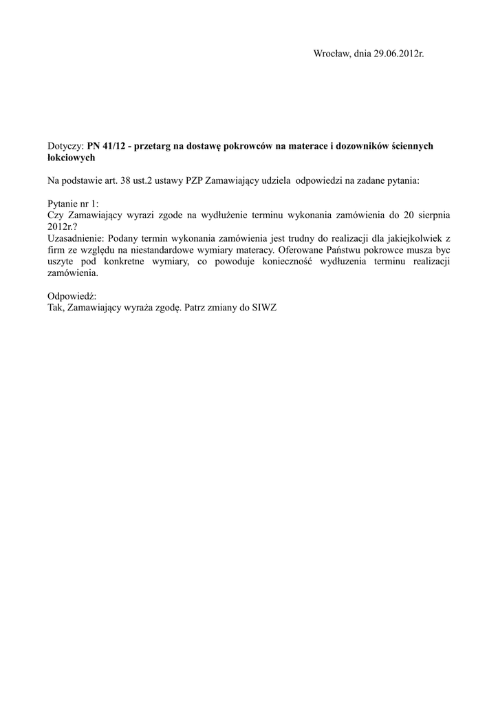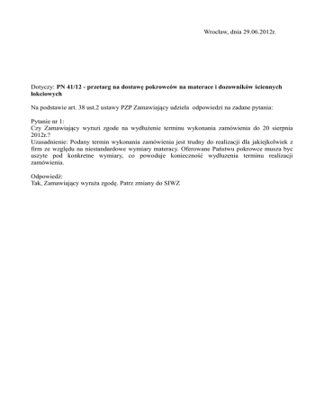 Wrocław, dnia 29.06.2012r. Dotyczy: PN 41/12 - przetarg na dostawę pokrowców na materace i dozowników ściennych łokciowych Na podstawie art. 38 ust.2 ustawy PZP Zamawiający udziela odpowiedzi na zadane pytania: Pytanie nr 1: Czy Zamawiający wyrazi zgode na wydłużenie terminu wykonania zamówienia do 20 sierpnia 2012r.? Uzasadnienie: Podany termin wykonania zamówienia jest trudny do realizacji dla jakiejkolwiek z firm ze względu na niestandardowe wymiary materacy. Oferowane Państwu pokrowce musza byc uszyte pod konkretne wymiary, co powoduje konieczność wydłuzenia terminu realizacji zamówienia. Odpowiedź: Tak, Zamawiający wyraża zgodę. Patrz zmiany do SIWZ