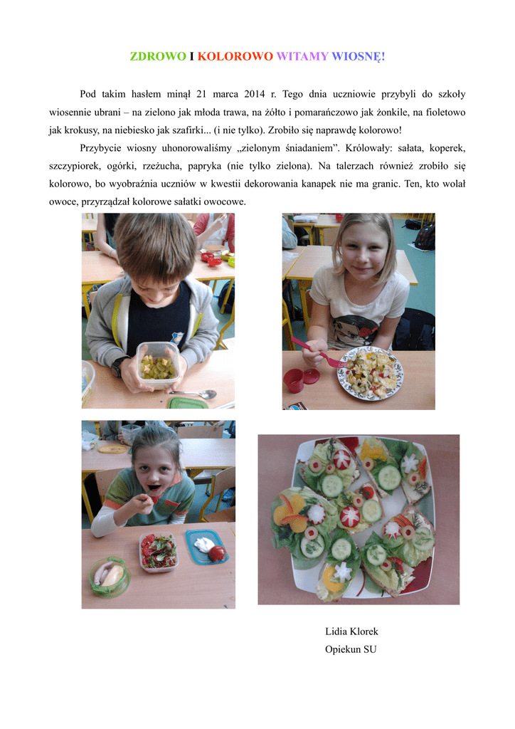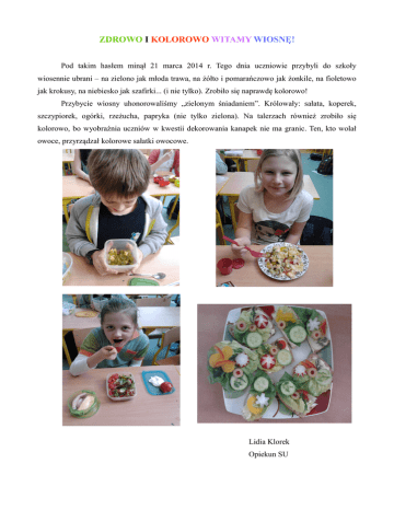 ZDROWO I KOLOROWO WITAMY WIOSNĘ! Pod takim hasłem minął 21 marca 2014 r. Tego dnia uczniowie przybyli do szkoły wiosennie ubrani – na zielono jak młoda trawa, na żółto i pomarańczowo jak żonkile, na fioletowo jak krokusy, na niebiesko jak szafirki... (i nie tylko). Zrobiło się naprawdę kolorowo! Przybycie wiosny uhonorowaliśmy „zielonym śniadaniem”. Królowały: sałata, koperek, szczypiorek, ogórki, rzeżucha, papryka (nie tylko zielona). Na talerzach również zrobiło się kolorowo, bo wyobraźnia uczniów w kwestii dekorowania kanapek nie ma granic. Ten, kto wolał owoce, przyrządzał kolorowe sałatki owocowe. Lidia Klorek Opiekun SU
