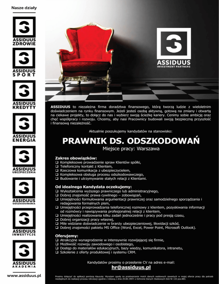 ASSIDUUS to niezależna firma doradztwa finansowego, którą tworzą ludzie z wieloletnim doświadczeniem na rynku finansowym. Jeżeli jesteś osobą aktywną, gotową na zmiany i otwartą na ciekawe projekty, to dołącz do nas i wybierz swoją ścieżkę kariery. Cenimy sobie ambicję oraz chęć współpracy i rozwoju. Chcemy, aby nasi Pracownicy budowali swoją bezpieczną przyszłość i finansową niezależność. Aktualnie poszukujemy kandydatów na stanowisko: PRAWNIK DS. ODSZKODOWAŃ Miejsce pracy: Warszawa Zakres obowiązków: Kompleksowe prowadzenie spraw Klientów spółki, Telefoniczny kontakt z Klientem, Rzeczowa komunikacja z ubezpieczycielem, Kompleksowa obsługa procesu odszkodowawczego, Budowanie i utrzymywanie stałych relacji z Klientami. Od idealnego Kandydata oczekujemy: Wykształcenia wyższego prawniczego lub administracyjnego, Dobrej znajomość prawa cywilnego – zobowiązań, Umiejętności formułowania argumentacji prawniczej oraz samodzielnego sporządzania i redagowania formalnych pism, Umiejętności przeprowadzania telefonicznej rozmowy z klientem, pozyskiwania informacji od rozmówcy i nawiązywania profesjonalnej relacji z klientem, Umiejętności realizowania kilku zadań jednocześnie i pracy pod presją czasu, Dobrej organizacji pracy własnej, Mile widziane doświadczenie w branży ubezpieczeniowej, likwidacji szkód, Dobrej znajomości pakietu MS Office (Word, Excel, Power Point, Microsoft Outlook).) Oferujemy: Atrakcyjne wynagrodzenie w intensywnie rozwijającej się firmie, Możliwość rozwoju zawodowego i osobistego, Dostęp do materiałów edukacyjnych, bazy wiedzy, komunikatora, intranetu, Szkolenie z oferty produktowej i systemu CRM. Kandydatów prosimy o przesłanie CV na adres e-mail: [email protected] Prosimy dołączyć do aplikacji poniższą klauzulę: Wyrażam zgodę na przetwarzanie moich danych osobowych zawartych w mojej ofercie pracy dla potrzeb niezbędnych do realizacji procesu rekrutacji zgodnie z Ustawą z dnia 29.08.1997r o Ochronie Danych Osobowych DzU Nr 133 poz.883.