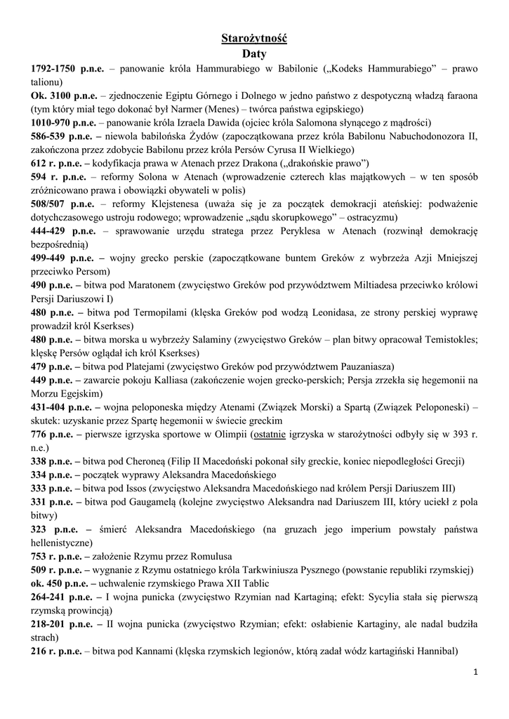 Starożytność Daty 1792-1750 p.n.e. – panowanie króla Hammurabiego w Babilonie („Kodeks Hammurabiego” – prawo talionu) Ok. 3100 p.n.e. – zjednoczenie Egiptu Górnego i Dolnego w jedno państwo z despotyczną władzą faraona (tym który miał tego dokonać był Narmer (Menes) – twórca państwa egipskiego) 1010-970 p.n.e. – panowanie króla Izraela Dawida (ojciec króla Salomona słynącego z mądrości) 586-539 p.n.e. – niewola babilońska Żydów (zapoczątkowana przez króla Babilonu Nabuchodonozora II, zakończona przez zdobycie Babilonu przez króla Persów Cyrusa II Wielkiego) 612 r. p.n.e. – kodyfikacja prawa w Atenach przez Drakona („drakońskie prawo”) 594 r. p.n.e. – reformy Solona w Atenach (wprowadzenie czterech klas majątkowych – w ten sposób zróżnicowano prawa i obowiązki obywateli w polis) 508/507 p.n.e. – reformy Klejstenesa (uważa się je za początek demokracji ateńskiej: podważenie dotychczasowego ustroju rodowego; wprowadzenie „sądu skorupkowego” – ostracyzmu) 444-429 p.n.e. – sprawowanie urzędu stratega przez Peryklesa w Atenach (rozwinął demokrację bezpośrednią) 499-449 p.n.e. – wojny grecko perskie (zapoczątkowane buntem Greków z wybrzeża Azji Mniejszej przeciwko Persom) 490 p.n.e. – bitwa pod Maratonem (zwycięstwo Greków pod przywództwem Miltiadesa przeciwko królowi Persji Dariuszowi I) 480 p.n.e. – bitwa pod Termopilami (klęska Greków pod wodzą Leonidasa, ze strony perskiej wyprawę prowadził król Kserkses) 480 p.n.e. – bitwa morska u wybrzeży Salaminy (zwycięstwo Greków – plan bitwy opracował Temistokles; klęskę Persów oglądał ich król Kserkses) 479 p.n.e. – bitwa pod Platejami (zwycięstwo Greków pod przywództwem Pauzaniasza) 449 p.n.e. – zawarcie pokoju Kalliasa (zakończenie wojen grecko-perskich; Persja zrzekła się hegemonii na Morzu Egejskim) 431-404 p.n.e. – wojna peloponeska między Atenami (Związek Morski) a Spartą (Związek Peloponeski) – skutek: uzyskanie przez Spartę hegemonii w świecie greckim 776 p.n.e. – pierwsze igrzyska sportowe w Olimpii (ostatnie igrzyska w starożytności odbyły się w 393 r. n.e.) 338 p.n.e. – bitwa pod Cheroneą (Filip II Macedoński pokonał siły greckie, koniec niepodległości Grecji) 334 p.n.e. – początek wyprawy Aleksandra Macedońskiego 333 p.n.e. – bitwa pod Issos (zwycięstwo Aleksandra Macedońskiego nad królem Persji Dariuszem III) 331 p.n.e. – bitwa pod Gaugamelą (kolejne zwycięstwo Aleksandra nad Dariuszem III, który uciekł z pola bitwy) 323 p.n.e. – śmierć Aleksandra Macedońskiego (na gruzach jego imperium powstały państwa hellenistyczne) 753 r. p.n.e. – założenie Rzymu przez Romulusa 509 r. p.n.e. – wygnanie z Rzymu ostatniego króla Tarkwiniusza Pysznego (powstanie republiki rzymskiej) ok. 450 p.n.e. – uchwalenie rzymskiego Prawa XII Tablic 264-241 p.n.e. – I wojna punicka (zwycięstwo Rzymian nad Kartaginą; efekt: Sycylia stała się pierwszą rzymską prowincją) 218-201 p.n.e. – II wojna punicka (zwycięstwo Rzymian; efekt: osłabienie Kartaginy, ale nadal budziła strach) 216 r. p.n.e. – bitwa pod Kannami (klęska rzymskich legionów, którą zadał wódz kartagiński Hannibal) 1 202 r. p.n.e. – bitwa pod Zamą (klęska Hannibala zadana mu przez wodza rzymskiego Scypiona Afrykańskiego) 149-146 p.n.e. – III wojna punicka (efekt: zrównanie Kartaginy z ziemią) 146 r. p.n.e. – Rzymianie zburzyli zbuntowany Korynt (efekt: cała Grecja włączona została do państwa rzymskiego) 52 r. p.n.e. – bitwa pod Alezją (pokonanie przez Juliusza Cezara armii galijskiej pod wodzą Wercyngetoryksa; efekt: włączenie Galii do państwa rzymskiego) 48 r. p.n.e. – bitwa pod Farsalos (w czasie wojny domowej Juliusz Cezar pokonuje Pomepujsza 73-71 p.n.e. – powstanie Spartakusa (inicjator powstania zginął w bitwie, jego towarzyszy ukrzyżowano wzdłuż drogi prowadzącej z Kapui do Rzymu) 44 r. p.n.e. – śmierć Juliusza Cezara (rzymskiego wodza, polityka i pisarza; konsula i dożywotniego dyktatora; autora dzieł: „Pamiętniki o wojnie galijskiej” oraz „O wojnie domowej” 31 r. p.n.e. – bitwa pod Akcjum (kolejna wojna domowa w Rzymie, tym razem między Markiem Antoniuszem a Oktawianem; w bitwie zwycięstwo odniósł Oktawian; Antoniusz uciekł do Egiptu, gdzie wraz z ukochaną Kleopatrą popełnił samobójstwo) 27 r. p.n.e. – początek cesarstwa w Rzymie (pierwszy cesarz Oktawian August); pierwsza z form cesarstwa to tzw. pryncypat („komedia republiki”) 284 r. – nowa forma cesarstwa – dominat („Dominus ac Deus” – Pan i Bóg – tak powiedział o sobie cesarz Dioklecjan) 313 r. – edykt mediolański – cesarz Konstantyn Wielki przyznał chrześcijanom równouprawnienie w społeczeństwie rzymskim, 380 r. – cesarz Teodozjusz Wielki uznaje chrześcijaństwo za religię panującą w Rzymie 395 r. – podział cesarstwa przez Teodozjusza Wielkiego na część zachodnią (stolicą Rzym) oraz wschodnią (stolicą Konstantynopol) 451 r. – pokonanie przez rzymskiego wodza Aecjusza władcę Hunów Attylę w bitwie na Polach Katalunijskich 476 r. – upadek cesarstwa zachodniorzymskiego (barbarzyński wódz Odoaker strącił z tronu ostatniego cesarza rzymskiego Romulusa Augustulusa) Pojęcia Rewolucja neolityczna – przejście z trybu koczowniczego na osiadły (dokonane między 9. a 3. tysiącleciem p.n.e.), dwie kluczowe umiejętności: hodowla zwierząt i uprawa roli (najwcześniej na terenie „Żyznego Półksiężyca”) Zikkurat – mezopotamska świątynia Tora – Pięcioksiąg, najważniejsza święta księga Żydów (Księgi: Rodzaju, Wyjścia, Kapłańska, Liczb, Powtórzonego Prawa) Menora – siedmioramienny świecznik nawiązujący swoim kształtem do biblijnego drzewa życia Szabat – siódmy dzień tygodnia (sobota), kultowy dzień żydowskiego odpoczynku trwający od piątkowego do sobotniego zachodu słońca) Arka Przymierza –