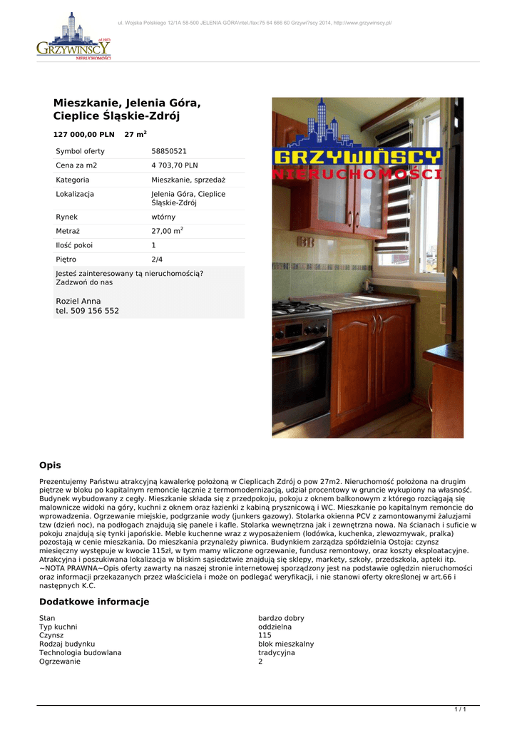 ul. Wojska Polskiego 12/1A 58-500 JELENIA GÓRA\ntel./fax:75 64 666 60 Grzywi?scy 2014, http://www.grzywinscy.pl/ Mieszkanie, Jelenia Góra, Cieplice Śląskie-Zdrój 127 000,00 PLN 27 m2 Symbol oferty 58850521 Cena za m2 4 703,70 PLN Kategoria Mieszkanie, sprzedaż Lokalizacja Jelenia Góra, Cieplice Śląskie-Zdrój Rynek wtórny Metraż 27,00 m2 Ilość pokoi 1 Piętro 2/4 Jesteś zainteresowany tą nieruchomością? Zadzwoń do nas Roziel Anna tel. 509 156 552 Opis Prezentujemy Państwu atrakcyjną kawalerkę położoną w Cieplicach Zdrój o pow 27m2. Nieruchomość położona na drugim piętrze w bloku po kapitalnym remoncie łącznie z termomodernizacją, udział procentowy w gruncie wykupiony na własność. Budynek wybudowany z cegły. Mieszkanie składa się z przedpokoju, pokoju z oknem balkonowym z którego rozciągają się malownicze widoki na góry, kuchni z oknem oraz łazienki z kabiną prysznicową i WC. Mieszkanie po kapitalnym remoncie do wprowadzenia. Ogrzewanie miejskie, podgrzanie wody (junkers gazowy). Stolarka okienna PCV z zamontowanymi żaluzjami tzw (dzień noc), na podłogach znajdują się panele i kafle. Stolarka wewnętrzna jak i zewnętrzna nowa. Na ścianach i suficie w pokoju znajdują się tynki japońskie. Meble kuchenne wraz z wyposażeniem (lodówka, kuchenka, zlewozmywak, pralka) pozostają w cenie mieszkania. Do mieszkania przynależy piwnica. Budynkiem zarządza spółdzielnia Ostoja: czynsz miesięczny występuje w kwocie 115zł, w tym mamy wliczone ogrzewanie, fundusz remontowy, oraz koszty eksploatacyjne. Atrakcyjna i poszukiwana lokalizacja w bliskim sąsiedztwie znajdują się sklepy, markety, szkoły, przedszkola, apteki itp. ~NOTA PRAWNA~Opis oferty zawarty na naszej stronie internetowej sporządzony jest na podstawie oględzin nieruchomości oraz informacji przekazanych przez właściciela i może on podlegać weryfikacji, i nie stanowi oferty określonej w art.66 i następnych K.C. Dodatkowe informacje Stan Typ kuchni Czynsz Rodzaj budynku Technologia budowlana Ogrzewanie bardzo dobry oddzielna 115 blok mieszkalny tradycyjna 2 1/1 Powered by TCPDF (www.tcpdf.org)