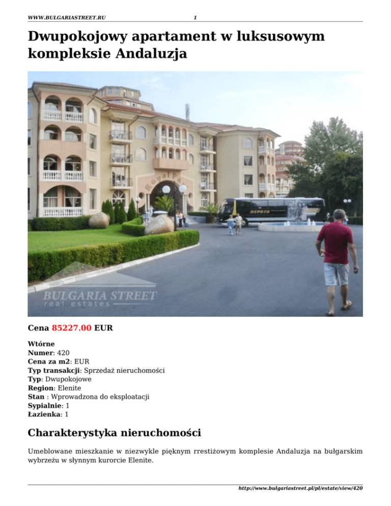 WWW.BULGARIASTREET.RU 1 Dwupokojowy apartament w luksusowym kompleksie Andaluzja Cena 85227.00 EUR Wtórne Numer: 420 Cena za m2: EUR Typ transakcji: Sprzedaż nieruchomości Typ: Dwupokojowe Region: Elenite Stan : Wprowadzona do eksploatacji Sypialnie: 1 Łazienka: 1 Charakterystyka nieruchomości Umeblowane mieszkanie w niezwykle pięknym rrestiżowym komplesie Andaluzja na bułgarskim wybrzeżu w słynnym kurorcie Elenite. http://www.bulgariastreet.pl/pl/estate/view/420 WWW.BULGARIASTREET.RU 2 Kompleks apartamentów znajduje się nad brzegiem morza i oferuje właścicielom i gościom wiele udogodnień i rozrywek, zważywszy na jego własne potężne sieci infrastruktury, znajduje się w obszarze chronionym. Mieszkanie znajduje się na drugim piętrze i składa się z - przedpokóju, pokóju dziennego, sypialni, łazienki i tarasu. Infrastruktura ● ● ● ● ● ● ● ● ● ● ● ● ● ● ● ● ● ● ● ● ● ● ● ● ● ● Stajnia konie Barbecue Pralka Sprzatanie apartamentow Kamery ochrony Ochrona Supermarket Sklep Internet Telewizja kablowa Silownia Gabinet medyczny Masaż Dzakuzi Sauna Centrum SPA Basen odkryty Bar lobby Bar Restauracja Recepcja Elektrczność Woda Okna PVC Meble Przypilnowane terytorium Informacje o regionie Lokacja: Elenite jest niewielkim kurortem, rozmieszczonym na południowym nadbrzeżu Bułgarii. Kurort jest częścią tak zwanego Bułgarskiej Riwiery i przyciąga w zasadzie turystów z zagranicy i Bułgarów, co oddaje przewagę spokojowi i przytulności. Kurort ma unikalny rozkład - południowe stoki łańcucha gór Stara Planina schodzą bezpośrednio do przepięknych piaszczystych plaż. Kurort jest miejscem, które jest znane swoją prawdziwą pięknością, spokojem i świeżym powietrzem. Charakterystyka kurortu: Kurort jest piękny i czarowny z jego współczesnymi hotelami, czystymi plażami i doskonałymi warunkami dla odpoczynku i turyzmu. http://www.bulgariastreet.pl/pl/estate/view/420 WWW.BULGARIASTREET.RU 3 Elenite wywalczył sobie sławę prestiżowego kurortu, gdzie jest współczesna zdrojowa baza i możliwość praktykować więcej 20 różnych rodzajów sportu. Hotele w diapazonie od 4 do 5 gwiazd, rozmieszczone w kilku metrach od morza. Oni mają atrakcyjny wygląd zewnętrzny i sprawiają wrażenie swoją ciekawą architekturą. Bliskość kurortu do jednego z największych letnich kurortów na nadbrzeżu Bułgarii Słoneczny brzeg, jest warunkiem dla nieodżałowanych wspomnień i dziwnych momentów. W nocy tu można ciekawie przeprowadzać kłamiemy w jednym z licznych barów i klubów nad Słonecznym Brzegiem, a w dzień rozkoszować się błogim odpoczynkiem na plaży kurortu. Jedna z głównych rzeczy, która wyróżnia kurort od innych letnich kurortów, - sumiastą zielony zarost, którym otoczony kurort Elenite. Są duże парки i ogrody, które idealnie podchodzą dla przechadzek i odpoczynku. Plaże kurortu: Plaża w Elenite ma ogólną długość 800 m, na którym zamieszczone parasole i szezlongi, które mogą wolno wykorzystywać się gośćmi. Woda jest tu bardzo czysta i ciepła, poza tym tu są stworzone doskonałe warunki dla zajmowania różnymi rodzajami wodnych sportów. http://www.bulgariastreet.pl/pl/estate/view/420 WWW.BULGARIASTREET.RU 4 http://www.bulgariastreet.pl/pl/estate/view/420 WWW.BULGARIASTREET.RU 5 http://www.bulgariastreet.pl/pl/estate/view/420 WWW.BULGARIASTREET.RU 6 http://www.bulgariastreet.pl/pl/estate/view/420 WWW.BULGARIASTREET.RU 7 Kontakty Agencja "Ulica Bułgarska" (Bulgaria Street Ltd) Bułgaria m. Burgas, 8000 ul. Mitropolit Simeon 3 Strona: www.bulgariastreet.ru http://www.bulgariastreet.pl/pl/estate/view/420 WWW.BULGARIASTREET.RU 8 Tel: + 359 894 51 50 51 Tel: + 48 223 906 334 Mail: [email protected] Mail: [email protected] Skype: bulstreet http://www.bulgariastreet.pl/pl/estate/view/420