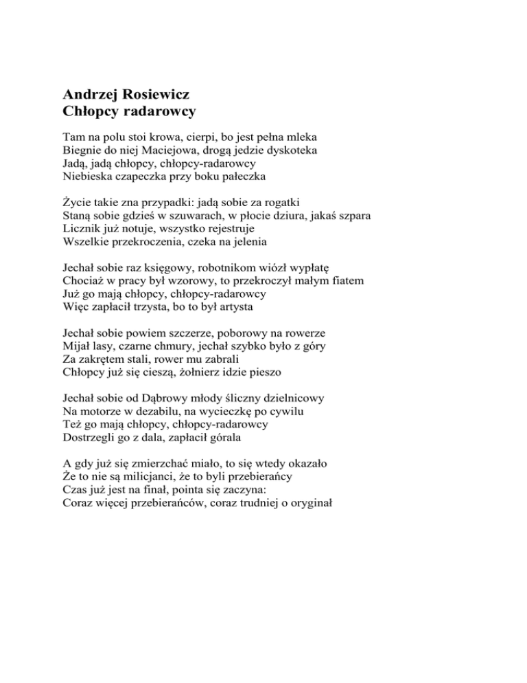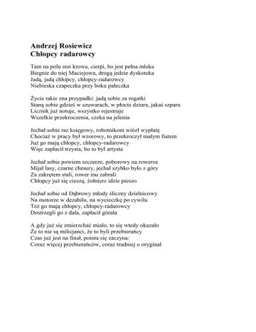 Andrzej Rosiewicz Chłopcy radarowcy Tam na polu stoi krowa, cierpi, bo jest pełna mleka Biegnie do niej Maciejowa, drogą jedzie dyskoteka Jadą, jadą chłopcy, chłopcy-radarowcy Niebieska czapeczka przy boku pałeczka Życie takie zna przypadki: jadą sobie za rogatki Staną sobie gdzieś w szuwarach, w płocie dziura, jakaś szpara Licznik już notuje, wszystko rejestruje Wszelkie przekroczenia, czeka na jelenia Jechał sobie raz księgowy, robotnikom wiózł wypłatę Chociaż w pracy był wzorowy, to przekroczył małym fiatem Już go mają chłopcy, chłopcy-radarowcy Więc zapłacił trzysta, bo to był artysta Jechał sobie powiem szczerze, poborowy na rowerze Mijał lasy, czarne chmury, jechał szybko było z góry Za zakrętem stali, rower mu zabrali Chłopcy już się cieszą, żołnierz idzie pieszo Jechał sobie od Dąbrowy młody śliczny dzielnicowy Na motorze w dezabilu, na wycieczkę po cywilu Też go mają chłopcy, chłopcy-radarowcy Dostrzegli go z dala, zapłacił górala A gdy już się zmierzchać miało, to się wtedy okazało Że to nie są milicjanci, że to byli przebierańcy Czas już jest na finał, pointa się zaczyna: Coraz więcej przebierańców, coraz trudniej o oryginał