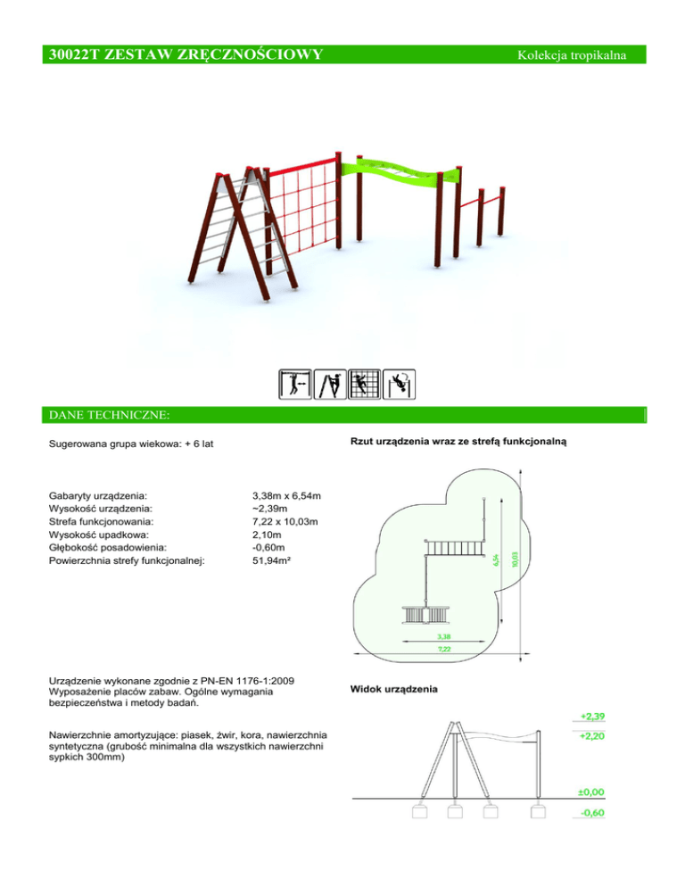 30022T ZESTAW ZRĘCZNOŚCIOWY Kolekcja tropikalna DANE TECHNICZNE: Rzut urządzenia wraz ze strefą funkcjonalną Sugerowana grupa wiekowa: + 6 lat Gabaryty urządzenia: Wysokość urządzenia: Strefa funkcjonowania: Wysokość upadkowa: Głębokość posadowienia: Powierzchnia strefy funkcjonalnej: 3,38m x 6,54m ~2,39m 7,22 x 10,03m 2,10m -0,60m 51,94m² Urządzenie wykonane zgodnie z PN-EN 1176-1:2009 Wyposażenie placów zabaw. Ogólne wymagania bezpieczeństwa i metody badań. Nawierzchnie amortyzujące: piasek, żwir, kora, nawierzchnia syntetyczna (grubość minimalna dla wszystkich nawierzchni sypkich 300mm) Widok urządzenia SKŁAD URZĄDZENIA: Drabinka pozioma Drabinka ukośna Przeplotnia pionowa z lin Zestaw do przewrotów MATERIAŁY: 1 szt. 1 szt. 1 szt. 1 szt. Nogi konstrukcyjne: Kotwy: Elementy stalowe: Elementy połaciowe: Liny: Zaślepki: Fundamenty: drewno klejone warstwowo malowane lakierobejcą na kolor ciemny orzech, stal ocynkowana kąpielowo, stal ocynkowana kąpielowo, malowana proszkowo, płyty HDPE, polipropylenowe na oplocie stalowym połączone ze sobą poprzez plastikowe łączniki, tworzywo sztuczne, beton klasy min. B-15; SATERNUS DISTRIBUTION Sp. z o.o. sp. k. ul. Nowa 32 41-500 Chorzów SATERNUS DISTRIBUTION Sp. z o.o. sp. k. zastrzega sobie wszelkie prawa do ochrony praw autorskich na podstawie Ustawy z dnia 04.02.1994 r. o prawie autorskim i prawach pokrewnych ( DZ. U. Nr 28 poz. 83) a zwłaszcza art. 78 i 79 tejże ustawy. Właściciel certyfikatu: Producent: Dystrybutor: GRUPA SATERNUS Sp. z o.o. S. K. A. (następca prawny Place Zabaw Saternus Sp. z o.o.) Saternus Production Sp. z o.o. sp. k. Saternus Distribution Sp. z o.o. sp. k.