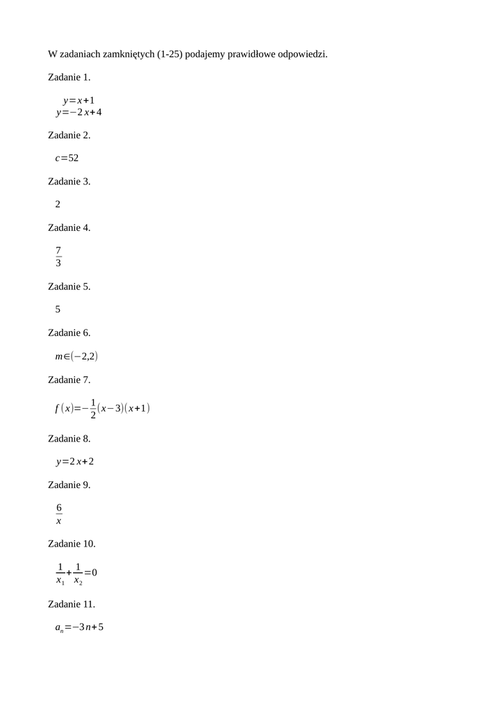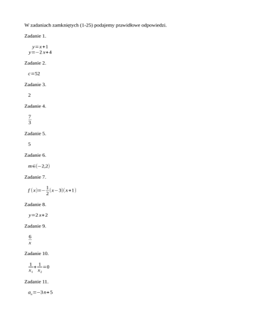 W zadaniach zamkniętych (1-25) podajemy prawidłowe odpowiedzi. Zadanie 1. y=x +1 y=−2 x+ 4 Zadanie 2. c=52 Zadanie 3. 2 Zadanie 4. 7 3 Zadanie 5. 5 Zadanie 6. m∈(−2,2) Zadanie 7. 1 f ( x)=− (x−3)( x +1) 2 Zadanie 8. y=2 x+ 2 Zadanie 9. 6 x Zadanie 10. 1 1 + =0 x1 x2 Zadanie 11. an =−3 n+ 5 Zadanie 12. √2 Zadanie 13. 5 Zadanie 14. − 11 23 Zadanie 15. 1 Zadanie 16. 3 Zadanie 17. 160 Zadanie 18. 1 7 f ( x)=− x + 3 3 Zadanie 19. 5 Zadanie 20. dwa razy dłuższa od wysokości walca Zadanie 21. 1 Zadanie 22. A=(2,−1) Zadanie 23. P( A)= 2 3 Zadanie 24. 45 Zadanie 25. a=9 Zadanie 26. W =( p , q)=(4,0) −b p= 2∗2 −b 4= 4 b=−16 0=2∗16−16∗4+ c c=32 Zadanie 27. 9 x3 +18 x 2−4 x−8=0 2 9 x ( x +2)−4 ( x +2)=0 2 ( x+2)(9 x −4)=0 4 9( x +2)( x 2− )=0 9 2 2 (x+2)( x− )( x+ )=0 3 3 2 2 Pierwiastki: −2,− , 3 3 Zadanie 28. k =7 n+2 , gdzie n∈N 2 3 k =3(7 n+2)=3( 49 n + 28 n+4)= 2 2 = 21∗7 n +12∗7 n+7+5=7(21 n +12 n+1) 3 k 2=7 p+ 5 , gdzie p∈ N 3 Zadanie 29. a) x ∈(2,3) 1 −1 x−2 1 1 g( x )= −1= −1 x−3−2 x−5 1 0= −1 x−5 x−5=1 x=6 b) f (x )= Zadanie 30. (5,1);( 6,2);(7,3) ;(8,4 ); (7,1);( 8,2) A=6 Ω =8∗8 A 6 3 P ( A )= = = Ω 64 32 Zadanie 31. β=360o −2(180o −2 α )=360o −360o + 4 α =4 α Zadanie 32. p=2(2 x x +3 x x +3 x 2 x )=22 x2 198=22 x 2 x 2=9 x=3 2 d=√ x + 4 x 2 +9 x 2=√ 17 x d=3 √ 17 Zadanie 33. s=2,1 km= 21 4 16 km , t=1 h= h 10 60 15 v 1 +1=v 2 s s +1= t1 t2 t=t 1 +t 2 => t 2 =t−t 1 s+t 1 s = t1 t−t 1 (s +t 1 )(t−t 1)=s t 1 s t−s t 1+t t 1−t 2−s t 1=0 −t 21 +(t−2 s)t 1 +s t=0 t 21−(t−2 s)t 1−st=0 16 42 21 16 t 21 −( − )t 1 − =0 15 10 10 15 94 336 t 21+ t 1− =0 30 150 47 56 t 21+ t 1− =0 15 25 2209 2016 4225 65 2 Δ= + = =( ) 225 225 225 15 −47 65 −47 65 − + 15 15 15 15 9 t1 = < 0 v t 1= = 2 2 15 21 s 10 7 v 1= = = t1 9 2 15 km Odpowiedź: 3,5 h Zadanie 34. 2 a =4 a=2 |ED| 2 |AD|= = =4 o sin(30 ) 1 2 Δ CDG ~ Δ DAE => ∢CDG=30o √3 |CD|=|GD|cos(30 o)=2 =√ 3 2 |AC|=|CD|+|AD|=4+ √ 3 |BS| o tg(30 )= |AC| 4 √3 |BC|= (4+ √ 3)=1+ √ 3 3 3 1 4 1 16 PΔ ABC = (4+ √3)(1+ √ 3)= ( 4+ √ 3+ √ 3+ 4) 2 3 2 3 19 PΔ ABC =4+ √ 3 6