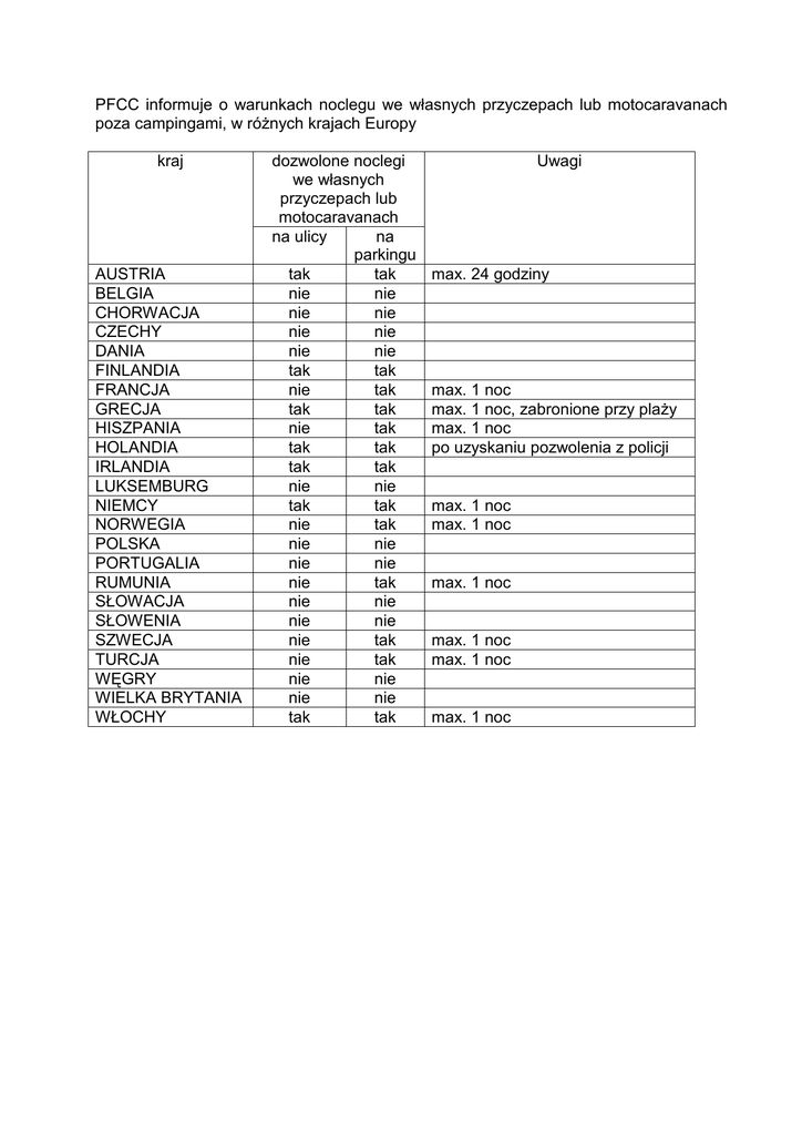 PFCC informuje o warunkach noclegu we własnych przyczepach lub motocaravanach poza campingami, w róŜnych krajach Europy kraj AUSTRIA BELGIA CHORWACJA CZECHY DANIA FINLANDIA FRANCJA GRECJA HISZPANIA HOLANDIA IRLANDIA LUKSEMBURG NIEMCY NORWEGIA POLSKA PORTUGALIA RUMUNIA SŁOWACJA SŁOWENIA SZWECJA TURCJA WĘGRY WIELKA BRYTANIA WŁOCHY dozwolone noclegi we własnych przyczepach lub motocaravanach na ulicy na parkingu tak tak nie nie nie nie nie nie nie nie tak tak nie tak tak tak nie tak tak tak tak tak nie nie tak tak nie tak nie nie nie nie nie tak nie nie nie nie nie tak nie tak nie nie nie nie tak tak Uwagi max. 24 godziny max. 1 noc max. 1 noc, zabronione przy plaŜy max. 1 noc po uzyskaniu pozwolenia z policji max. 1 noc max. 1 noc max. 1 noc max. 1 noc max. 1 noc max. 1 noc