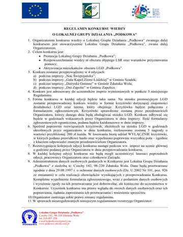 REGULAMIN KONKURSU WIEDZY O LOKALNEJ GRUPY DZIAŁANIA „PODKOWA” 1. Organizatorem konkursu wiedzy o Lokalnej Grupie Działania „Podkowa” zwanego dalej konkursem jest stowarzyszenie Lokalna Grupa Działania „Podkowa”, zwana dalej Organizatorem. 2. Celem konkursu jest: Promocja Lokalnej Grupy Działania „Podkowa”; Rozpowszechnianie wiedzy nt obszaru objętego LSR oraz warunków przyznawania pomocy; Aktywizacja mieszkańców obszaru LGD „Podkowa”. 3. Konkurs zostanie przeprowadzony w 4 edycjach: a) podczas imprezy „Noc Świętojańska”; b) podczas imprezy „Gala Kapel Ziemi Łódzkiej” w Gminie Szadek; c) podczas imprezy „Dożynki Gminne” w Gminie Zduńska Wola; d) podczas imprezy „Dni Zapolic” w Gminie Zapolice. 4. Konkurs jest adresowany do uczestników imprez wymienionych w punkcie 3 niniejszego Regulaminu. 5. Forma konkursu w każdej edycji będzie taka sama. Na stoisku promocyjnym LGD zostanie przeprowadzony konkurs wiedzy w formie krzyżówki dotyczącej znajomości działalności LGD oraz terenu, który obejmuje. Krzyżówka będzie połączona z formularzem zgłoszeniowym. Krzyżówki sprawdzone zostaną przez przedstawicieli Organizatora, którzy danego dnia będą obsługiwać stoisko LGD. Konkurs odbywać się będzie w godzinach wskazanych przez Organizatora w dniu imprezy. Ilość formularzy zgłoszeniowych ograniczona, podana będzie każdorazowo w dniu imprezy. 6. Spośród poprawnie rozwiązanych krzyżówek, złożonych na stoisku LGD w godzinach określonych przez organizatora w dniu konkursu, rozlosowane zostaną 3 nagrody o wartości przybliżonej 200 zł każda. W losowaniu biorą udział WYŁĄCZNIE krzyżówki, w których podano prawidłowe hasło oraz wypełniono poprawnie wszystkie pola – zgodnie z kluczem odpowiedzi znanym przedstawicielom Organizatora. 7. Rozstrzygnięcie kolejnych edycji konkursu nastąpi podczas ww. imprez na scenie głównej o godzinie podanej przez Organizatora w dniu przeprowadzania konkursu. 8. W każdej kolejnej edycji konkursu nie będą mogli uczestniczyć laureaci poprzednich edycji, pracownicy Organizatora oraz członkowie Zarządu. 9. Administratorem danych osobowych podanych w Konkursie jest Lokalna Grupa Działania „Podkowa” z siedzibą w: Czechy 142, 98-220 Zduńska Wola. Dane będą przetwarzane zgodnie z dnia 29.08.1997 r. o ochronie danych osobowych (Dz. U.2002 Nr 101, poz. 926 ze zmianami) w celu realizacji obowiązków wynikających z przeprowadzania Konkursu. Kompletne wypełnienie formularza zgłoszeniowego, wraz z podaniem danych osobowych i wyrażenie zgody na ich przetwarzanie jest dobrowolne, ale konieczne do uczestnictwa w Konkursie. Uczestnik konkursu ma prawo wglądu do swoich danych osobowych oraz ich poprawienia, żądania zaprzestania ich przetwarzania i wniesienie sprzeciwu 10. Organizator zastrzega sobie prawo zmiany regulaminu. 11. W sprawach nieuregulowanych niniejszym regulaminem rozstrzyga Organizator. Lokalna Grupa Działania „Podkowa” Czechy 142, 98-220 Zduńska Wola tel. 519 057 250 e-mail:[email protected] www.podkowa.zdwola.com.pl