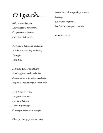 O łzach… Niby słony deszcz Niby deszcz marcowy Powoli i cicho wpadają na się Znikają I jak letnie słońce Radość wynurzać zda się Co zmywa z ziemi Szarość niepogody Kroplami pełnymi zadumy A jednak swoistej radości, Finezji, Lekkości Z gracją po sercu spływa Fantazyjna melancholia Zamknięta w przeźroczystych Acz niedocenionych kroplach Mogło być morze, Lecz jest kałuża Morze z kałuży Kałuża z morza Z morza kałuża powstaje Okręty zderzają się na niej Monika Strąk Oczy marzyciela Wiał zimny, przenikliwy wiatr, Wiatr niepokoju On spoglądał przez szklaną taflę okna A mimo tego pisał Wspaniałe wiersze Wiersze tętniące życiem, Patrzył na niebo Jego oczy były niczym morska głębia Lecz nierealne Zwrócone na październikowe Bo w tym matowym świecie niebo Odbijały czarne chmury Jak fale na wzburzonych wodach Istnieje tylko Z morza kałuża powstaje Pustka Już niedługo zacznie padać Łzy deszczu połączą się z jego łzami Łzami samotności Szary świat nie zwraca uwagi na malutkie myszki Takie, jak on Jakub Łuczak Upadły Anioł Me oczy Jak iskry z pożogi W dal spoglądając Drogi szukają Droga zamknięta już nie ma zbawienia Ja nie chcę umierać Lecz we mnie nic nie ma Oczy anielskie Jak gwiazdy niebieskie W dół spoglądają Lecz smutek w nich mają On skrzydła chowając W dół upadając Krzyczy: - Ja nie chcę tu być, Ja pragnę żyć! Upadły mój Anioł Skrzydła zszargane Lecz On na zawsze Będzie mym panem Razem przez wieczność To dla nas przekleństwo Lecz miłość tu wygra Ona zawsze jest żywa! Beata Rustowska Morskie opowieści Słońce pochyla się nad horyzontem Niczym kula płynnego złota Promieniami łaskocze bladą skórę Ogrzewając ją swym słodkim dotykiem Gdy noc dzień zastąpi Księżyc srebrną poświatą oświetli plażę Morze wzburzone fale przysyła Pochłaniając wszystko do cna Śpiew syren stąd słychać Głosem swym wabią żeglarzy na zgubę Statki już puste Niczym muszle bez pereł Opowieści zza mórz Szepce mi wiatr Ziarenka piasku przesypują się przez palce Niczym me myśli zmieszane Wypływa ma dusza W bezkres wszystkiego Statek rozpościera swe żagle Odpływając w zapomnienie Beata Rustowska Nasze ludzkie życie Jakże to ludzkie życie kruche A przede wszystkim nudne I nawet bywa krótkie Więc nie ma czasu na te wszystkie kłótnie Bo piasek w klepsydrze ucieka Niczym bezlitosny zegar Co tę wskazówkę przyspiesza To już ten czas Lecz nikt nie chce odejść z nas Bo boimy się tego Jakże okrutnie nieznanego Co czyha w górze Niczym zwierz co na swą ofiarę poluje Ale co to za życie Gdzie chwile mijają I już nie powracają Może tam będzie lepiej Chodźmy czym prędzej Beata Rustowska Smak świata Wiśnie czerwienią się w blasku letniego słońca Drewniany płotek otacza zadbany ogródek Wierzba płacze nad potokiem A ja biegnę W złote kłosy zbóż Czerwone maki smagają me dłonie Wiatr burzy zadbaną fryzurę Wokół mnie liście drzew grają koncert niezapomniany A ja biegnę dalej Słońce pochyla się ku zachodowi Czerwienią oblewając rozległe pola Jastrząb w górze wiruje Melodię dnia słowik gra Rozpływam się w powietrzu Uciekam stąd Daleko w przestworza świadomości Nie chcę już myśleć Nie chcę już istnieć. Beata Rustowska Miłość do… Pokocham Ja Co mi pozostaje? Mam Cię kochać Nie znać Nie rozumieć Bezgranicznie kochać Tobie dziękować za każde z barwnych wrażeń Ciebie prosić, błagać, przepraszać… A Ty Moje życie Mój dar Mój skarb Nie wiem, co mi dasz Co zabierzesz Kiedy się wzbogacę Kiedy zubożeję Będę szczęśliwa? Czy zostanę garstką niespełnionych marzeń? Dasz mi szansę? Zaraz ją zabierzesz? Nie wiem Monika Strąk „Kochać” to tak wiele znaczy, Każdy to sobie inaczej tłumaczy, Kochać do woli, kochać zbyt skrycie, Kochać za mocno, kochać nad życie, Kochać za oczy, za głos, Kochać za uśmiech, kochać za nos, Kochać za dobro, kochać za chwilę, Kochać za bajkę, kochać za siłę, Kochać na wszystkie miliony sposobów, Bo, aby kochać nie trzeba dowodów. Lena Stets Dziękuję za Dziękuję za każdy dzień, Za każdy uśmiech Twój do mnie. Dziękuję za podmuch wiatru I za powietrze, za przyjaźń Dziękuję za każde słowo, za każdą myśl o mnie. Za opiekę i współczucie. Ale to już koniec. Koniec, bo umieram z braku nadziei, Wiary w to, że wszystko się zmieni Z braku sensu życia… Ola Raszplewicz Która za chwilę miała zasłonić ich zupełnie Burza Niczym płatek śniegu tańczyła w Niczym dwa światy wzajemnie walczące powietrzu Teraz skakały wraz z nutami miłości By opaść w końcu w przepaść Wyczerpując się zupełnie bezdenną Ciemną, niczyją i bardzo senną Ogień zwalczający lód I lód zwalczający ogień Usnąwszy, topiła się w lodowym deszczu Porwani wichrem nie opierali się On widział już smutków trzysta Cienisty rycerz z mrocznej otchłani Zobaczył dziewczę, niczym myśl Wiedzieli o swej pięknej śmierci A mimo tego zaczęli Dreptać ku bramom piekła czysta Co rozjaśniła swym boskim blaskiem Jak lilia i róża Kopułę ognia z czarnych serc Jak biel i czerń Jak kwiecień i październik Porwał ją w taniec, lecz dziewczę już słabe Jak łza co zaraz wyschnie Chłonący ducha serc Biegli naprzeciw nieubłaganej niedoli Znów obudzona do życia po śmierci By odbić jeszcze choć trochę księżycowego światła Jeszcze jedna figura I zakręt mały Tańczyli sekundę przed czarną kurtyną Jakub Łuczak Po tym niepełny ukłon Głucha śmierć Artystka Atramentowa czerń i smutek Czarne serce, ściekające świeżym wypełniały jej oczy atramentem z inicjałami ze snu Brzydka, lecz dobra Nie mogła nic poradzić na to że chłopcy wolą Piękne i puste a nie, Skromne, choć tłuste I wtedy go ujrzała Obiekt jej codziennych westchnień Znów pogrążyła się w marzeniach Naszła ją wena, Wena origami Siedziała samotnie przy ławce Co z