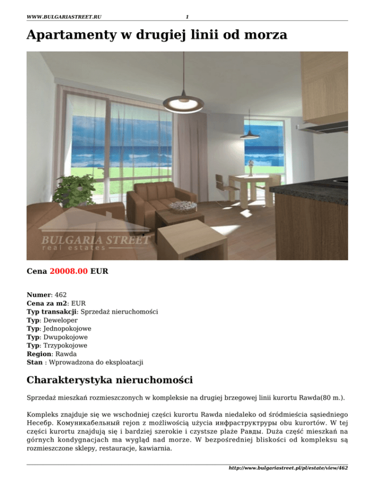 WWW.BULGARIASTREET.RU 1 Apartamenty w drugiej linii od morza Cena 20008.00 EUR Numer: 462 Cena za m2: EUR Typ transakcji: Sprzedaż nieruchomości Typ: Deweloper Typ: Jednopokojowe Typ: Dwupokojowe Typ: Trzypokojowe Region: Rawda Stan : Wprowadzona do eksploatacji Charakterystyka nieruchomości Sprzedaż mieszkań rozmieszczonych w kompleksie na drugiej brzegowej linii kurortu Rawda(80 m.). Kompleks znajduje się we wschodniej części kurortu Rawda niedaleko od śródmieścia sąsiedniego Несебр. Комуникабельный rejon z możliwością użycia инфраструктруры obu kurortów. W tej części kurortu znajdują się i bardziej szerokie i czystsze plaże Равды. Duża część mieszkań na górnych kondygnacjach ma wygląd nad morze. W bezpośredniej bliskości od kompleksu są rozmieszczone sklepy, restauracje, kawiarnia. http://www.bulgariastreet.pl/pl/estate/view/462 WWW.BULGARIASTREET.RU 2 Infrastruktura ● ● ● ● ● ● ● Ochrona Internet Telewizja kablowa Elektrczność Woda Okna PVC Przypilnowane terytorium Informacje o regionie Przedtem Rawda była międzynarodowym centrum dziecięcego turyzmu i odpoczynku. Ostatnimi rokami Rawda przekształcił się na współczesny wielofunkcyjny morski kurort, który stał się niezwykle popularnym u cudzoziemskich turystów, w tej liczbie u Rosjan. Wiele osób wybierają Rawda dla spokojnego rodzinnego odpoczynku, w tej liczbie z dziećmi. Malownicze bułgarskie osiedle Rawda jest rozmieszczone na południowym czarnomorskim nadbrzeżu Bułgarii w półtora kilometrach od prastarego miasta Несебр. Popularny bułgarski kurort Słoneczny brzeg znajduje się zaledwie 5 km, a międzynarodowy port lotniczy m. Burgas - do 30 km Klimat Miękki śródziemnomorski klimat z dużą ilością słonecznych godzin(2 200 - 2 300) korzystnie wyróżniają Rawdе od innych kurortów. Temperatura latem waha się od 20 do 30 stopniów Celsjusza, a wody - 20-26 stopniów Celsjusza. Plaże Świeże powietrze i кристально czysta morska woda - wizytówka Rawdy. Plaże Rawda - wygodne i bezpieczne z drobnym złocistym piaskiem. Są najbardziej znane dwie plaże - Południowa i druga, która jest rozmieszczona między przylądkiem Rawdy i przylądkiem Akrotiria. Tu są wszystkie atrybuty dla komfortowego plażowego odpoczynku - szezlongi, parasole, kawiarnie, fachowa ochrona i animatorzy. Infrastruktura Mimo to, że Rawda jest osiedlem, infrastruktura jest opracowana i jest całe potrzebne nie tylko dla odpoczynku, ale i dla całorocznego pobytu. W Rawdzie stale mieszka miejscowa ludność. W osiedlu funkcjonują następne obiekty: municypalne i prywatne dziecięce sadki, szkoła, poczta, filie banków, supermarket, sklepy, warzywne sklepy, medyczne centrum, apteki i sportowy kompleks z trenażerem salą. Dla amatorów śródziemnomorskiej i internacjonalnej kuchni w Равде są 10 wytwornych restauracji, a smakoszy, co oddaje przewagę bułgarskiej kuchni, ucieszy całe dziesięć knaip. Liczne kawiarnie i bistro, rozmieszczone po całym osiedlu, zaproponują dostatek zakąsek i deserów. http://www.bulgariastreet.pl/pl/estate/view/462 WWW.BULGARIASTREET.RU 3 http://www.bulgariastreet.pl/pl/estate/view/462 WWW.BULGARIASTREET.RU 4 http://www.bulgariastreet.pl/pl/estate/view/462 WWW.BULGARIASTREET.RU 5 Kontakty Agencja "Ulica Bułgarska" (Bulgaria Street Ltd) Bułgaria m. Burgas, 8000 ul. Mitropolit Simeon 3 Strona: www.bulgariastreet.ru Tel: + 359 894 51 50 51 Tel: + 48 223 906 334 Mail: [email protected] Mail: [email protected] Skype: bulstreet http://www.bulgariastreet.pl/pl/estate/view/462