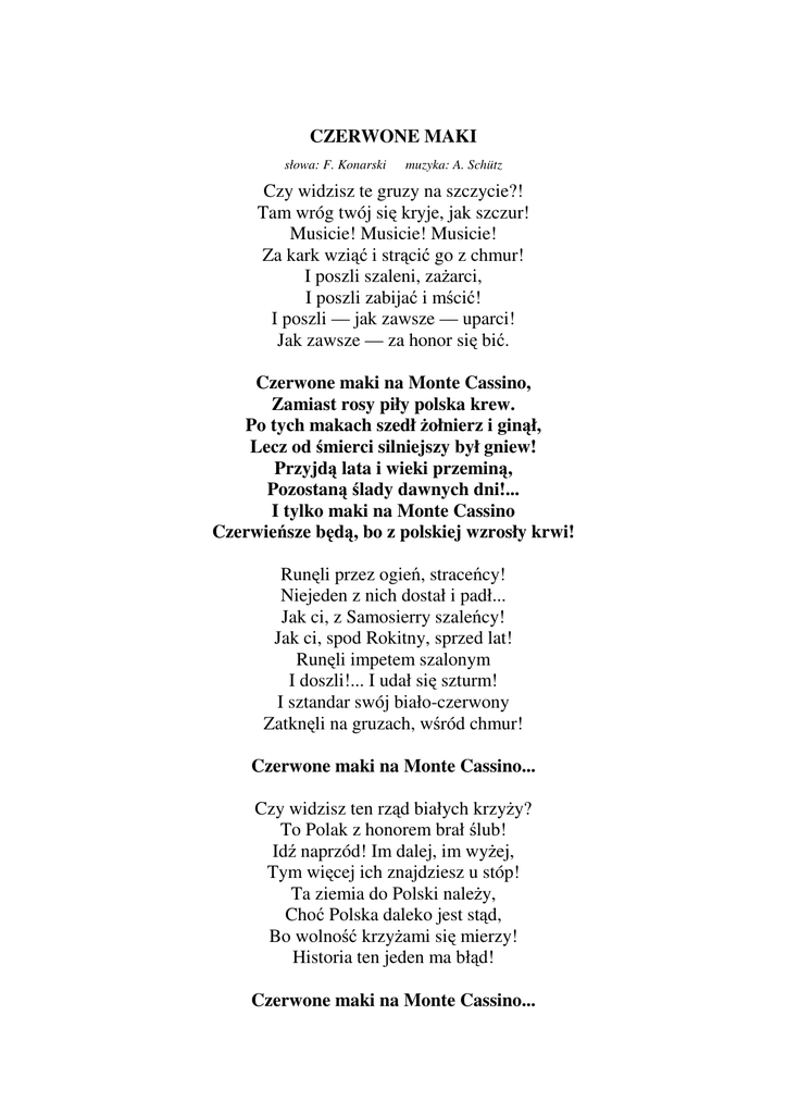 CZERWONE MAKI słowa: F. Konarski muzyka: A. Schütz Czy widzisz te gruzy na szczycie?! Tam wróg twój się kryje, jak szczur! Musicie! Musicie! Musicie! Za kark wziąć i strącić go z chmur! I poszli szaleni, zażarci, I poszli zabijać i mścić! I poszli — jak zawsze — uparci! Jak zawsze — za honor się bić. Czerwone maki na Monte Cassino, Zamiast rosy piły polska krew. Po tych makach szedł żołnierz i ginął, Lecz od śmierci silniejszy był gniew! Przyjdą lata i wieki przeminą, Pozostaną ślady dawnych dni!... I tylko maki na Monte Cassino Czerwieńsze będą, bo z polskiej wzrosły krwi! Runęli przez ogień, straceńcy! Niejeden z nich dostał i padł... Jak ci, z Samosierry szaleńcy! Jak ci, spod Rokitny, sprzed lat! Runęli impetem szalonym I doszli!... I udał się szturm! I sztandar swój biało-czerwony Zatknęli na gruzach, wśród chmur! Czerwone maki na Monte Cassino... Czy widzisz ten rząd białych krzyży? To Polak z honorem brał ślub! Idź naprzód! Im dalej, im wyżej, Tym więcej ich znajdziesz u stóp! Ta ziemia do Polski należy, Choć Polska daleko jest stąd, Bo wolność krzyżami się mierzy! Historia ten jeden ma błąd! Czerwone maki na Monte Cassino...