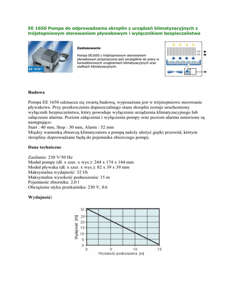 EE 1650 Pompa do odprowadzania skroplin z urządzeń klimatyzacyjnych z trójstopniowym sterowaniem pływakowym i wyłącznikiem bezpieczeństwa Zastosowanie Pompa EE1650 z trójstopniowym sterowaniem pływakowym przeznaczona jest szczególnie do pracy w konwektorowych urządzeniach klimatyzacyjnych oraz szafkach klimatyzacyjnych. Budowa Pompa EE 1650 odznacza się zwartą budową, wyposażona jest w trójstopniowe sterowanie pływakowe. Przy przekroczeniu dopuszczalnego stanu skroplin zostaje uruchomiony wyłącznik bezpieczeństwa, który powoduje wyłączenie urządzenia klimatyzacyjnego lub załączenie alarmu. Poziom załączenia i wyłączenia pompy oraz poziom alarmu ustawione są następująco: Start : 40 mm, Stop : 30 mm, Alarm : 52 mm Między wanienką zbiorczą klimatyzatora a pompą należy ułożyć giętki przewód, którym skropliny doprowadzane będą do pojemnika zbiorczego pompy. Dane techniczne Zasilanie: 230 V/50 Hz Moduł pompy (dł. x szer. x wys.): 244 x 174 x 144 mm Moduł pływaka (dł. x szer. x wys.): 82 x 39 x 39 mm Maksymalna wydajność: 32 l/h Maksymalna wysokość podnoszenia: 15 m Pojemność zbiornika: 2,0 l Obciążenie styku przekaźnika: 230 V, 8A Wydajność: