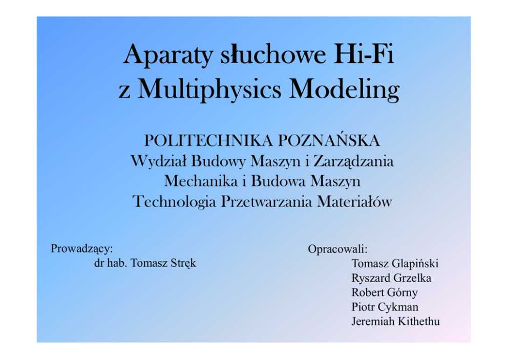 Aparaty słuchowe s uchowe HiHi-Fi z Multiphysics Modeling POLITECHNIKA POZNAŃSKA Wydział Budowy Maszyn i Zarządzania Mechanika i Budowa Maszyn Technologia Przetwarzania Materiałów Prowadzący: dr hab. Tomasz Stręk Opracowali: Tomasz Glapiński Ryszard Grzelka Robert Górny Piotr Cykman Jeremiah Kithethu COMSOL MULTIPHYSICS COMSOL Multiphysics jest środowiskiem symulacyjnym, rozwiązującym układy nieliniowych równań różniczkowych cząstkowych, przy wykorzystaniu metody elementów skończonych w jednym, dwóch lub trzech wymiarach. Jego elastyczność i cechy praktyczne pozwalają skoncentrować się na modelowanych zjawiskach bez konieczności dużego doświadczenia w użytkowaniu konkretnego programu. Comsol posiada bardzo przyjazny i intuicyjny dla użytkownika interfejs (GUI) pozwalający na szybkie i wygodne tworzenie modeli, uruchamianie symulacji oraz wizualizację wyników. Eksperymentując z różnymi parametrami i geometrią modelowanego obiektu, użytkownik może szybko poznać i zrozumieć wpływ różnych parametrów na zachowanie całego systemu. Ułatwia to późniejsze przejście do zaawansowanej analizy systemu, projektowania i optymalizacji. Rosnące zapotrzebowanie na aparaty słuchowe wymusza na producentach stosowanie coraz nowocześniejszych technologii aby urządzenia te były bardziej atrakcyjne i skuteczne. Program COMSOL ® okazał się bardzo przydatny podczas projektowania aparatów słuchowych ze względu na możliwość dowolnego wyznaczania równania oraz dostarczenie innego formatu zintegrowanego sygnału przetwarzania modelu. Z pokolenia Baby Boomer coraz większa liczba osób w wieku emerytalnym cierpi z powodu utraty słuchu. Amerykańska Akademia Audiologii szacuje tą liczbę na około 36 milionów Amerykanów. Dodaje także, że połowa z tych osób ma mniej niż 65 lat, a około 12 % wszystkich dzieci w wieku od 6 do 9 lat z powodu nadmiaru hałasu ma problemy ze słuchem. Wiele z tych osób jest kandydatami do korzystania z aparatów słuchowych. Spełnienie wymogów rynku sprawia, że aparaty słuchowe są coraz bardziej skuteczne i mniej uciążliwe. Takim aparatem słuchowym jest model BTE (za ucho). Model BTE przenosi dźwięk z aparatu słuchowego przez plastikową rurkę do wnętrza ucha, która pasuje do kanałów słuchowych. Niewielkie ilości dźwięku nie trafiają do ucha , a jeśli aparat słuchowy jest źle zaprojektowany mikrofon może wychwycić te dźwięki i doprowadzić do trzasku w aparacie lub innych niepożądanych skutków. Aby wyeliminować te efekty projektanci szukają ulepszonych materiałów na rurki, optymalnego rozmieszczenia mikrofonów, a także algorytmów sprzężenia zwrotnego, które zredukują krytyczne częstotliwości. DĄŻENIE DO LEPSZEGO SŁUCHU Modelowanie w programie COMSOL ma duży wpływ na stabilność i niezawodność algorytmów. Wcześniej algorytmy opierały się na podstawie eksperymentalnych pomiarów samego aparatu słuchowego. Jednakże istnieje wiele aspektów, które trzeba wziąć pod uwagę w celu stworzenia optymalnego algorytmu sprzężenia zwrotnego np. kształt małżowiny usznej oraz położenie aparatu na uchu. Dzięki programowi COMSOL możemy dodać szczegóły, które są trudne do uzyskania z badań doświadczalnych. Chodź dziś wszystkie aparaty słuchowe korzystają z algorytmu sprzężenia zwrotnego, który jest uniwersalny dla wszystkich osób to w przyszłości algorytm ten może być przystosowany do indywidualnego kształtu ucha każdego człowieka. Program COMSOL Multiphysics ® jest szczególnie przydatny w badaniach dotyczących poprawy słuchu, które są oparte przede wszystkim na termolepkości akustycznej. Pakiet ten nie jest dostępny w innych programach symulacyjnych. Możliwości COMSOL dotyczące układów równań były kluczowe w rozwoju aparatów słuchowych. Ponadto, swoboda określenia dowolnych warunków brzegowych jest bardzo pożyteczne. CAD Import Module do czytania w Pro / ENGINEER ® pozwala na zaimportowanie rysunków i użyciu ich w trybie COMSOL PDE's. Na podstawie otrzymanych wyników w programie COMSOL, można utworzyć algorytm oparty na MATLAB ®, który jest programem komputerowym do wykonywania obliczeń naukowych i inżynierskich oraz do tworzenia symulacji komputerowych. Dzięki temu zastosowaniu został znaleziony bardzo bliski związek między dźwiękiem, a ciśnieniem w aparatach słuchowych. Używając tych algorytmów i testując ustawienia zostało skonstruowany plastikowe ucho. BADANIE EFEKTU CIENIA W UCHU Wyniki modelowania wpłynęły na optymalizację aparatów słuchowych oraz ich stabilność mechaniczną w celu najlepszego rozmieszczenia mikrofonów. Stało się to możliwe ponieważ dysponujemy lepszymi narzędziami do badania efektu cienia ucha. Modelowania używamy także aby znaleźć jak najlepszą lokalizację otworu dla formy ucha, która jest niezbędna by zapobiec niepotrzebnemu tłumieniu niskich częstotliwości. OPRACOWANIE KOMPLEKSOWEGO MODELU Dzięki badaniom COMSOL zdobywamy o wiele lepsze zrozumienie akustyki słuchu co przekłada się na coraz to lepszą jakość aparatów słuchowych. COMSOL Multiphysics przyczynia się do rozwoju nowoczesnych technologii aparatów słuchowych. W badanych aparatach słuchowych można opisywać wiele różnych zjawisk fizycznych uzyskując wyniki bardzo dokładnie odzwierciedlające zachowanie rzeczywistego systemu. DZIĘKUJEMY ZA UWAGĘ