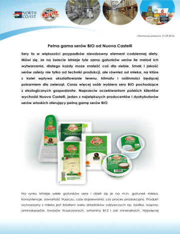 Informacja prasowa 21.09.2016 Pełna gama serów BIO od Nuova Castelli Sery to w większości przypadków nieodzowny element codziennej diety. Mówi się, że na świecie istnieje tyle samo gatunków serów ile metod ich wytwarzania, dlatego każdy może znaleźć coś dla siebie. Smak i jakość serów zależy nie tylko od techniki produkcji, ale również od mleka, na które z kolei wpływa ukształtowanie terenu, klimatu i roślinności będącej pokarmem dla zwierząt. Coraz więcej osób wybiera sery BIO pochodzące z ekologicznych gospodarstw. Naprzeciw oczekiwaniom polskich klientów wychodzi Nuova Castelli, jeden z największych producentów i dystrybutorów serów włoskich oferujący pełną gamę serów BIO. Na rynku istnieje wiele gatunków sera i dzieli się je na m.in. gatunek mleka, konsystencje, zawartość tłuszczu, czas dojrzewania, czy proces produkcyjny. Produkt wytwarzany z mleka jest źródłem wielu składników odżywczych np. białka, wapna, aminokwasów, kwasów tłuszczowych, witaminy B12 i soli mineralnych. Najwięcej Informacja prasowa 21.09.2016 wartości odżywczych mają sery wytwarzane w sposób ekologiczny, gdzie produkcja oparta jest na wysokiej jakości surowcu, czyli mleku. Zwraca się dużą uwagę na to, gdzie dające mleko zwierzęta żyją i czym się żywią. Pełną gamę serów BIO wytwarzanych z mleka pochodzenia ekologicznego oferuje Nuova Castelli. Wybrane sery mają również certyfikat DOP (Chroniona Nazwa Pochodzenia), co oznacza, że ser od początku do końca produkcji przechodzi przez wszystkie fazy na jednym obszarze, np. Gorgonzola i Parmigiano Reggiano. Oryginalne włoskie kremowe sery w Polsce dostępne są na półkach sklepów sieci Piotr i Paweł oraz w wybranych sklepach E.Leclerc. Zwolennicy serów BIO znajdą delikatną Mozzarellę i Gorgonzolę, które powszechnie używane są do wszelkiego rodzaju sałatek, pizzy i makaronów. Do past idealnie nadaje się świeża Ricotta, która jest również lekkostrawną nietłustą alternatywą dla twarogu, używana jako zagęszczacz do sosów, ale też idealna do deserów. Miłośnicy słodkości mogą użyć do Tiramisu serka BIO Mascarpone. W asortymencie dostępnych produktów znajduje się również ser Parmigiano Reggiano, zarówno w kawałku, jak i w formie tartej. Produkty Nuova Castelli są sprzedawane zarówno pod marką własną, jak i pod markami sieci handlowych m.in. Tesco, Auchan, Carrefour, E.Leclerc, Intermarche. Świadczy to o wysokiej jakości produktów, silnej reputacji i wizerunku rzetelnego oraz godnego zaufania partnera, jaki firma osiągnęła wśród największych sieci dystrybucji we Włoszech i za granicą. *** North Coast SA Firma North Coast została założona w 1992 roku. Siedziba spółki znajduje się w Pruszkowie pod Warszawą. Od początku działalności North Coast SA specjalizuje się w dystrybucji wysokogatunkowych produktów spożywczych pochodzących głównie z Włoch. W portfelu produktów North Coast można znaleźć m.in. produkty suche (np. oliwa z oliwek, makaron, ryż), produkty świeże (np. włoskie sery, nadziewany makaron czy desery), produkty mrożone (np. różnego rodzaju makarony, przepyszne włoskie desery), napoje (kawa, woda, wino) oraz profesjonalne ekspresy do kawy i osprzęt. W chwili obecnej firma importuje do Polski produkty wytwarzane przez ponad 70 czołowych producentów markowych wyrobów spożywczych. Dzięki dobrze rozmieszczonym magazynom, North Coast dociera Informacja prasowa 21.09.2016 do klientów w całej Polsce. Wśród nich znajdują się sklepy wielkopowierzchniowe, tzw. nowoczesna dystrybucja, sieci sklepów delikatesowych, niezależne sklepy detaliczne oraz klienci rynku HoReCa. Od 2015 roku North Coast SA weszła do Grupy Nuova Castelli, jednego z największych producentów i eksporterów włoskich serów, aby połączyć siły i wspólnie budować pozycję lidera i eksperta propagującego włoską tradycję kulinarną na polskim rynku. Kontakt Agencja Tauber Promotion Mariusz Skowronek Marika Żołądek-Banaś Tel. 22 833 35 02 tel. 22 833 23 88 Kom. 698 612 866 Kom. 502 831 620 [email protected] [email protected]