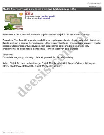 Informacje o produkcie Utworzono 07-03-2017 Mydło Ayurwedyjskie z olejkiem z drzewa herbacianego 125g Cena : 12.00 zł Stan magazynowy : bardzo wysoki Średnia ocena : brak recenzji m .p l Naturalne, czyste, nieperfumowane mydło zawiera olejek i z drzewa herbacianego. Zawartość Tea Tree Oil sprawia, że delikatne mydło pozostawia długotrwały efekt świeżości, Dzięki olejkowi z drzewa herbacianego, który niszczy bakterie i inne mikroorganizmy, mydło posiada właściwości antyseptyczne. Jest szczególnie polecane do pielęgnacji cery problemowej ze skłonnością do trądziku i innych skórnych dolegliwości. .c o Zalecane: Do codziennego mycia całego ciała. Odpowiednie dla całej rodziny. de es is Skłąd: Olejek Drzewa Herbacianego, Olejek Miodły Indyjskiej, Olejek Cytryny, Gliceryna, Olejek Migdałowy, Ratan Joth, Olejek Mięty, Olej roślinny. Wygenerowano w programie www.oscGold.com