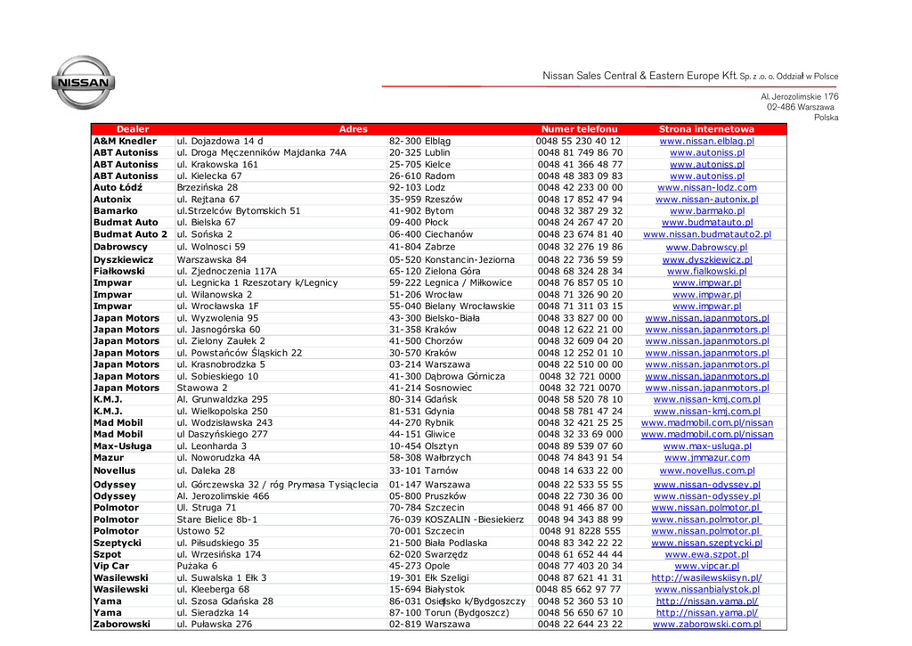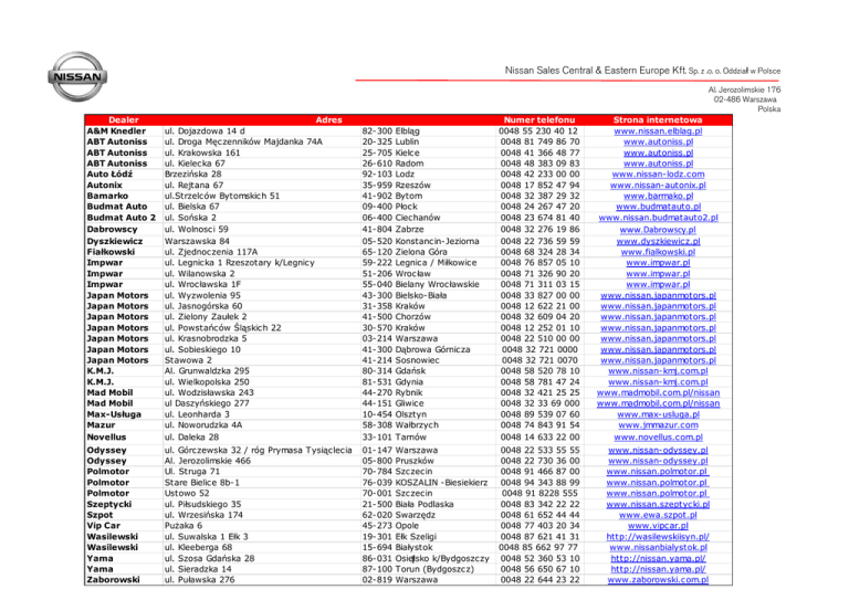 Nissan Sales Central & Eastern Europe Kft. Sp. z .o. o. Oddział w Polsce Al. Jerozolimskie 176 02-486 Warszawa Polska Dealer A&M Knedler ABT Autoniss ABT Autoniss ABT Autoniss Auto Łódź Autonix Bamarko Budmat Auto Budmat Auto 2 Dabrowscy Dyszkiewicz Fiałkowski Impwar Impwar Impwar Japan Motors Japan Motors Japan Motors Japan Motors Japan Motors Japan Motors Japan Motors K.M.J. K.M.J. Mad Mobil Mad Mobil Max-Usługa Mazur Novellus Adres ul. Dojazdowa 14 d ul. Droga Męczenników Majdanka 74A ul. Krakowska 161 ul. Kielecka 67 Brzezińska 28 ul. Rejtana 67 ul.Strzelców Bytomskich 51 ul. Bielska 67 ul. Sońska 2 ul. Wolnosci 59 Warszawska 84 ul. Zjednoczenia 117A ul. Legnicka 1 Rzeszotary k/Legnicy ul. Wilanowska 2 ul. Wrocławska 1F ul. Wyzwolenia 95 ul. Jasnogórska 60 ul. Zielony Zaułek 2 ul. Powstańców Śląskich 22 ul. Krasnobrodzka 5 ul. Sobieskiego 10 Stawowa 2 Al. Grunwaldzka 295 ul. Wielkopolska 250 ul. Wodzisławska 243 ul Daszyńskiego 277 ul. Leonharda 3 ul. Noworudzka 4A ul. Daleka 28 82-300 20-325 25-705 26-610 92-103 35-959 41-902 09-400 06-400 41-804 05-520 65-120 59-222 51-206 55-040 43-300 31-358 41-500 30-570 03-214 41-300 41-214 80-314 81-531 44-270 44-151 10-454 58-308 33-101 Elbląg Lublin Kielce Radom Lodz Rzeszów Bytom Płock Ciechanów Zabrze Konstancin-Jeziorna Zielona Góra Legnica / Miłkowice Wrocław Bielany Wrocławskie Bielsko-Biała Kraków Chorzów Kraków Warszawa Dąbrowa Górnicza Sosnowiec Gdańsk Gdynia Rybnik Gliwice Olsztyn Wałbrzych Tarnów Numer telefonu 0048 55 230 40 12 0048 81 749 86 70 0048 41 366 48 77 0048 48 383 09 83 0048 42 233 00 00 0048 17 852 47 94 0048 32 387 29 32 0048 24 267 47 20 0048 23 674 81 40 0048 32 276 19 86 0048 22 736 59 59 0048 68 324 28 34 0048 76 857 05 10 0048 71 326 90 20 0048 71 311 03 15 0048 33 827 00 00 0048 12 622 21 00 0048 32 609 04 20 0048 12 252 01 10 0048 22 510 00 00 0048 32 721 0000 0048 32 721 0070 0048 58 520 78 10 0048 58 781 47 24 0048 32 421 25 25 0048 32 33 69 000 0048 89 539 07 60 0048 74 843 91 54 0048 14 633 22 00 Strona internetowa www.nissan.elblag.pl www.autoniss.pl www.autoniss.pl www.autoniss.pl www.nissan-lodz.com www.nissan-autonix.pl www.barmako.pl www.budmatauto.pl www.nissan.budmatauto2.pl www.dyszkiewicz.pl www.fialkowski.pl www.impwar.pl www.impwar.pl www.impwar.pl www.nissan.japanmotors.pl www.nissan.japanmotors.pl www.nissan.japanmotors.pl www.nissan.japanmotors.pl www.nissan.japanmotors.pl www.nissan.japanmotors.pl www.nissan.japanmotors.pl www.nissan-kmj.com.pl www.nissan-kmj.com.pl www.madmobil.com.pl/nissan www.madmobil.com.pl/nissan www.max-usluga.pl www.jmmazur.com www.novellus.com.pl Odyssey Odyssey Polmotor Polmotor Polmotor Szeptycki Szpot Vip Car Wasilewski Wasilewski Yama Yama Zaborowski ul. Górczewska 32 / róg Prymasa Tysiąclecia Al. Jerozolimskie 466 Ul. Struga 71 Stare Bielice 8b-1 Ustowo 52 ul. Piłsudskiego 35 ul. Wrzesińska 174 Pużaka 6 ul. Suwalska 1 Ełk 3 ul. Kleeberga 68 ul. Szosa Gdańska 28 ul. Sieradzka 14 ul. Puławska 276 01-147 05-800 70-784 76-039 70-001 21-500 62-020 45-273 19-301 15-694 86-031 87-100 02-819 Warszawa Pruszków Szczecin KOSZALIN -Biesiekierz Szczecin Biała Podlaska Swarzędz Opole Ełk Szeligi Białystok Osielsko 1 k/Bydgoszczy Torun (Bydgoszcz) Warszawa 0048 22 533 55 55 0048 22 730 36 00 0048 91 466 87 00 0048 94 343 88 99 0048 91 8228 555 0048 83 342 22 22 0048 61 652 44 44 0048 77 403 20 34 0048 87 621 41 31 0048 85 662 97 77 0048 52 360 53 10 0048 56 650 67 10 0048 22 644 23 22 www.nissan-odyssey.pl www.nissan-odyssey.pl www.nissan.polmotor.pl www.nissan.polmotor.pl www.nissan.polmotor.pl www.nissan.szeptycki.pl www.ewa.szpot.pl www.vipcar.pl http://wasilewskiisyn.pl/ www.nissanbialystok.pl http://nissan.yama.pl/ http://nissan.yama.pl/ www.zaborowski.com.pl www.Dabrowscy.pl