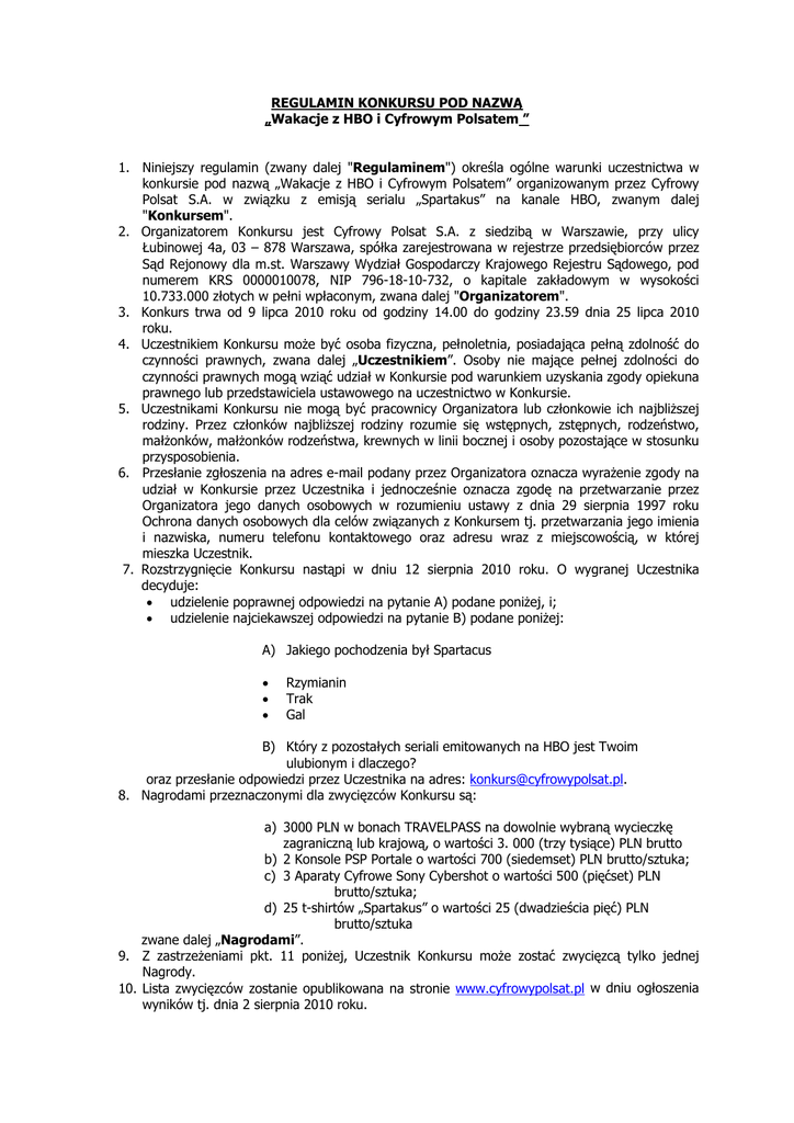 REGULAMIN KONKURSU POD NAZWĄ „Wakacje z HBO i Cyfrowym Polsatem ” 1. Niniejszy regulamin (zwany dalej "Regulaminem") określa ogólne warunki uczestnictwa w konkursie pod nazwą „Wakacje z HBO i Cyfrowym Polsatem” organizowanym przez Cyfrowy Polsat S.A. w związku z emisją serialu „Spartakus” na kanale HBO, zwanym dalej "Konkursem". 2. Organizatorem Konkursu jest Cyfrowy Polsat S.A. z siedzibą w Warszawie, przy ulicy Łubinowej 4a, 03 – 878 Warszawa, spółka zarejestrowana w rejestrze przedsiębiorców przez Sąd Rejonowy dla m.st. Warszawy Wydział Gospodarczy Krajowego Rejestru Sądowego, pod numerem KRS 0000010078, NIP 796-18-10-732, o kapitale zakładowym w wysokości 10.733.000 złotych w pełni wpłaconym, zwana dalej "Organizatorem". 3. Konkurs trwa od 9 lipca 2010 roku od godziny 14.00 do godziny 23.59 dnia 25 lipca 2010 roku. 4. Uczestnikiem Konkursu może być osoba fizyczna, pełnoletnia, posiadająca pełną zdolność do czynności prawnych, zwana dalej „Uczestnikiem”. Osoby nie mające pełnej zdolności do czynności prawnych mogą wziąć udział w Konkursie pod warunkiem uzyskania zgody opiekuna prawnego lub przedstawiciela ustawowego na uczestnictwo w Konkursie. 5. Uczestnikami Konkursu nie mogą być pracownicy Organizatora lub członkowie ich najbliższej rodziny. Przez członków najbliższej rodziny rozumie się wstępnych, zstępnych, rodzeństwo, małżonków, małżonków rodzeństwa, krewnych w linii bocznej i osoby pozostające w stosunku przysposobienia. 6. Przesłanie zgłoszenia na adres e-mail podany przez Organizatora oznacza wyrażenie zgody na udział w Konkursie przez Uczestnika i jednocześnie oznacza zgodę na przetwarzanie przez Organizatora jego danych osobowych w rozumieniu ustawy z dnia 29 sierpnia 1997 roku Ochrona danych osobowych dla celów związanych z Konkursem tj. przetwarzania jego imienia i nazwiska, numeru telefonu kontaktowego oraz adresu wraz z miejscowością, w której mieszka Uczestnik. 7. Rozstrzygnięcie Konkursu nastąpi w dniu 12 sierpnia 2010 roku. O wygranej Uczestnika decyduje: • udzielenie poprawnej odpowiedzi na pytanie A) podane poniżej, i; • udzielenie najciekawszej odpowiedzi na pytanie B) podane poniżej: A) Jakiego pochodzenia był Spartacus • • • Rzymianin Trak Gal B) Który z pozostałych seriali emitowanych na HBO jest Twoim ulubionym i dlaczego? oraz przesłanie odpowiedzi przez Uczestnika na adres: [email protected]. 8. Nagrodami przeznaczonymi dla zwycięzców Konkursu są: a) 3000 PLN w bonach TRAVELPASS na dowolnie wybraną wycieczkę zagraniczną lub krajową, o wartości 3. 000 (trzy tysiące) PLN brutto b) 2 Konsole PSP Portale o wartości 700 (siedemset) PLN brutto/sztuka; c) 3 Aparaty Cyfrowe Sony Cybershot o wartości 500 (pięćset) PLN brutto/sztuka; d) 25 t-shirtów „Spartakus” o wartości 25 (dwadzieścia pięć) PLN brutto/sztuka zwane dalej „Nagrodami”. 9. Z zastrzeżeniami pkt. 11 poniżej, Uczestnik Konkursu może zostać zwycięzcą tylko jednej Nagrody. 10. Lista zwycięzców zostanie opublikowana na stronie www.cyfrowypolsat.pl w dniu ogłoszenia wyników tj. dnia 2 sierpnia 2010 roku. 11. Laureat Konkursu, który otrzyma nagrodę główną określoną w pkt. 8 lit. a) Regulaminu, otrzyma także nagrodę pieniężną w wysokości 300 (trzysta) PLN brutto ufundowaną przez Organizatora Konkursu. 11.1 Całkowita wartość nagrody głównej określonej w pkt. 8 lit. a) Regulaminu wynosi 3 300 (trzy tysiące trzysta) PLN brutto. 11.2 Organizator zobowiązuje się do potrącenia z kwoty o której mowa w pkt. 11.1. Regulaminu 10% podatku od nagród i odprowadzenia go do właściwego Urzędu Skarbowego. 12. Nagrody do zwycięzców Konkursu zostaną wysłane przez Organizatora na jego koszt pod adres zamieszkania wskazany przez Zwycięzców w zgłoszeniu konkursowym. 13. W przypadku niepodania swych danych osobowych lub niewyrażenia zgody na ich przetwarzanie przez Organizatora w zakresie wyżej podanym zwycięzca Konkursu traci prawo do Nagrody. 14. Nagrody zostaną wysłane w ciągu miesiąca licząc od dnia ogłoszenia wyników Konkursu. 15. Organizator Konkursu wyklucza możliwość zamiany jakiejkolwiek Nagrody w Konkursie na ekwiwalent pieniężny lub na inną nagrodę rzeczową. 16. Zasady przeprowadzania Konkursu określa Regulamin. 17. Udział w Konkursie, jest równoznaczny ze złożeniem przez Uczestnika oświadczenia o wyrażeniu zgody na postanowienia Regulaminu. 18. Organizator nie ponosi odpowiedzialności za: a) nieprawdziwość danych i oświadczeń złożonych przez Uczestników; b) problemy w funkcjonowaniu Konkursu, jeżeli nastąpiły one wskutek zdarzeń, których Organizator, przy zachowaniu należytej staranności, nie był w stanie przewidzieć, lub którym nie mógł zapobiec, w szczególności w przypadku problemów związanych ze zdarzeniami losowymi o charakterze siły wyższej; c) przerwy w funkcjonowaniu Konkursu zaistniałe z przyczyn technicznych lub niezależnych od Organizatora; d) nie doręczenie Nagrody spowodowane podaniem przez laureata błędnych danych osobowych niezbędnych do doręczenia Nagrody lub spowodowane działaniem firmy kurierskiej lub Poczty Polskiej, za pośrednictwem której będą doręczane przesyłki. 19. Organizator zastrzega sobie prawo do unieważnienia lub odwołania Konkursu w każdym czasie bez podania przyczyny. 20. W celu zapewnienia prawidłowości przeprowadzenia Konkursu Organizator powoła dwuosobową Komisję Konkursową, zwaną dalej „Komisją”. Do zadań Komisji należeć będzie czuwanie nad prawidłowością przebiegu Konkursu, a w szczególności : a) zapewnienie przyznania Nagród wyłonionym zwycięzcom Konkursu, b) zabezpieczenie zgodności wyłonienia zwycięzców Konkursu oraz przyznania Nagrody zgodnie z Regulaminem i zasadami pełnej rzetelności przeprowadzonych czynności, c) właściwe oznaczenie i zabezpieczenie danych zwycięzców Konkursu, d) podpisanie protokołu zawie