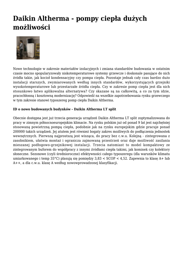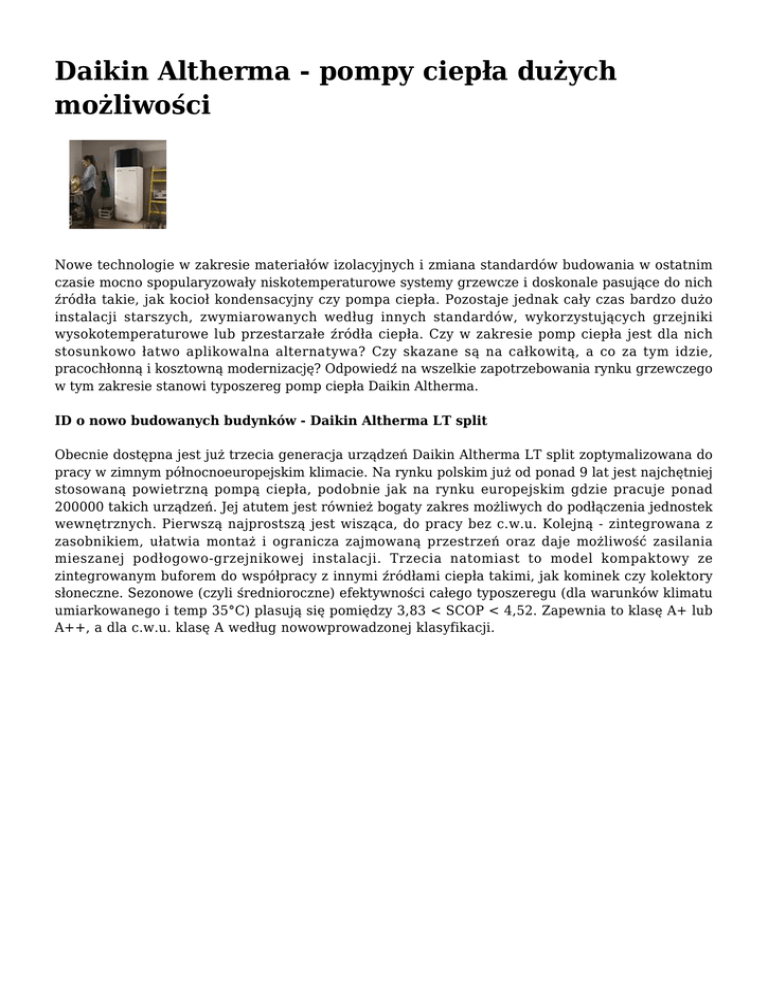 Daikin Altherma - pompy ciepła dużych możliwości Nowe technologie w zakresie materiałów izolacyjnych i zmiana standardów budowania w ostatnim czasie mocno spopularyzowały niskotemperaturowe systemy grzewcze i doskonale pasujące do nich źródła takie, jak kocioł kondensacyjny czy pompa ciepła. Pozostaje jednak cały czas bardzo dużo instalacji starszych, zwymiarowanych według innych standardów, wykorzystujących grzejniki wysokotemperaturowe lub przestarzałe źródła ciepła. Czy w zakresie pomp ciepła jest dla nich stosunkowo łatwo aplikowalna alternatywa? Czy skazane są na całkowitą, a co za tym idzie, pracochłonną i kosztowną modernizację? Odpowiedź na wszelkie zapotrzebowania rynku grzewczego w tym zakresie stanowi typoszereg pomp ciepła Daikin Altherma. ID o nowo budowanych budynków - Daikin Altherma LT split Obecnie dostępna jest już trzecia generacja urządzeń Daikin Altherma LT split zoptymalizowana do pracy w zimnym północnoeuropejskim klimacie. Na rynku polskim już od ponad 9 lat jest najchętniej stosowaną powietrzną pompą ciepła, podobnie jak na rynku europejskim gdzie pracuje ponad 200000 takich urządzeń. Jej atutem jest również bogaty zakres możliwych do podłączenia jednostek wewnętrznych. Pierwszą najprostszą jest wisząca, do pracy bez c.w.u. Kolejną - zintegrowana z zasobnikiem, ułatwia montaż i ogranicza zajmowaną przestrzeń oraz daje możliwość zasilania mieszanej podłogowo-grzejnikowej instalacji. Trzecia natomiast to model kompaktowy ze zintegrowanym buforem do współpracy z innymi źródłami ciepła takimi, jak kominek czy kolektory słoneczne. Sezonowe (czyli średnioroczne) efektywności całego typoszeregu (dla warunków klimatu umiarkowanego i temp 35°C) plasują się pomiędzy 3,83 < SCOP < 4,52. Zapewnia to klasę A+ lub A++, a dla c.w.u. klasę A według nowowprowadzonej klasyfikacji. Do budynków o wyższym zapotrzebowaniu - Daikin Altehrma Flex Daikin Altehrma Flex to system wysokotemperaturowy, modułowy z możliwością chłodzenia. Doskonale sprawdza się we wszelkich obiektach o zwiększonym zapotrzebowaniu na c.w.u., gdyż dzięki dostępnym wysokim wartościom temperatury, codzienny wygrzew c.w.u. lub okresowy przeciw Legionelli jest w efektywny sposób uzyskiwany bez użycia grzałek wspomagających. W trybie chłodzenia latem, odebrane z pomieszczeń ciepło zamiast wyrzucać do atmosfery można gromadzić na potrzeby podgrzewu wody użytkowej. Do budownictwa wielorodzinnego jednostki wewnętrzne można podzielić indywidualnie na użytkowników z bezpośrednim rozliczeniem w razie potrzeby. Do wymiany starszych gazowych kotłów - Daikin Altherma Hybryda To połączenie powietrznej pompy ciepła z gazowym kotłem kondensacyjnym. Jedyna atrakcyjna alternatywa w zakresie pomp ciepła do wymiany gazowego kotła, dzięki optymalnemu wykorzystaniu atutów połączonych źródeł ciepła. Umożliwia, na podstawie zadanych cen nośników energii, optymalne wykorzystanie energii odnawialnej z powietrza atmosferycznego i ciepła spalania gazu. W zakresie c.w.u. oferuje przepływowy podgrzew w oparciu o jedną wysokoefektywną wymianę ciepła ze spalin do wody użytkowej z udziałem bardzo głębokiej kondensacji. Podłączenie zasobnika c.w.u. również jest możliwe. Ponadto w przeciwieństwie do wszystkich typów kotłów umożliwia również funkcję chłodzenia. Temperatura wody do 80°C zapewnia prawidłową współpracę praktycznie z każdym typem emiterów ciepła, a obecność kotła gazowego daje całkowitą niezależność od temperatury zewnętrznej. Dla szukających najefektywniejszych rozwiązań - Gruntowa Daikin Altherma Pompa ciepła ze sprężarką inwerter nie wymaga bufora energii, gdyż moduluje wydajnością do za potrzebowania. Taka regulowana praca przyczynia się do ograniczenia intensywności odbioru ciepła z gruntu, a w ten sposób podniesienie średnio o 4°C w sezonie jego temperatury w czasie pracy pompy ciepła, co wymiernie przekłada się na pobór mocy elektrycznej przez urządzenie. Efektywności sezonowe SCOP > 5 plasują gruntową pompę ciepła Daikin Altherma w klasie A++ i podobnie jak inne gruntowe pompy ciepła, zapewniają najniższe eksploatacyjne koszty ogrzewania spośród wszystkich rozwiązań dostępnych na rynku. Typoszereg pomp ciepła Daikin Altherma to atrakcyjne eksploatacyjnie rozwiązania już nie tylko do nowo budowanych budynków, ale i do modernizacji istniejących, niezależnie od dostępu do gazu ziemnego czy innych nośników energii. Różnorodność oferowanych zastosowań pozwala przekraczać granice możliwości dla pomp ciepła do niedawna jeszcze będące poza ich zasięgiem. Autor: Erwin Szczurek KONTAKT Daikin E-mail: [email protected] WWW: www.daikin.pl Tel: +48 22 319 90 00 Adres: Taśmowa 7 02-677 Warszawa
