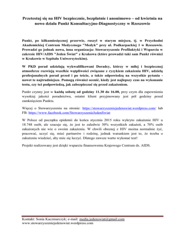 Przetestuj się na HIV bezpiecznie, bezpłatnie i anonimowo – od kwietnia na nowo działa Punkt Konsultacyjno-Diagnostyczny w Rzeszowie Punkt, po kilkumiesięcznej przerwie, ruszył w starym miejscu, tj. w Przychodni Akademickiej Centrum Medycznego "Medyk" przy ul. Podkarpackiej 1 w Rzeszowie. Prowadzi go jednak nowa, inna organizacja: Stowarzyszenie Profilaktyki i Wsparcia w zakresie HIV/AIDS "Jeden Świat" z Krakowa (które prowadzi taki sam Punkt również w Krakowie w Szpitalu Uniwersyteckim). W PKD porad udzielają wykwalifikowani Doradcy, którzy w miłej i bezpiecznej atmosferze rozwieją wszelkie wątpliwości związane z ryzykiem zakażenia HIV, udzielą profesjonalnych porad przed i po teście, a także odpowiedzą na wszystkie pytania nawet te najtrudniejsze. Pomogą również ocenić, kiedy jest najlepszy czas na wykonanie testu, czy też podpowiedzą, jak zabezpieczać się przed zakażeniem. Punkt czynny jest w każdą sobotę od godziny 11.30 do 16.00, przy czym dla zapewnienia wysokiej jakości poradnictwa, ostatni klient przyjmowany jest pół godziny przed zamknięciem Punktu. Więcej o Stowarzyszeniu na stronie: https://stowarzyszeniejedenswiat.wordpress.com/ lub FB: https://www.facebook.com/StowarzyszenieJedenSwiat W Polsce od początku epidemii do końca stycznia 2015 roku wykryto zakażenie HIV u 18.748 osób, ale szacuje się, że jest to zaledwie 30% wszystkich zakażeń, a 70% osób zakażonych nie wie o swoim zakażeniu. W chwili obecnej z HIV można normalnie żyć, pracować, uczyć się, mieć partnerów i rodzinę, jednak warunkiem jest to, że trzeba o zakażeniu wiedzieć, aby móc się leczyć. Dlatego zawsze warto wykonać test! Projekt realizowany jest dzięki wsparciu finansowemu Krajowego Centrum ds. AIDS. Kontakt: Sonia Kaczmarczyk; e-mail: [email protected] www.stowarzyszeniejedenswiat.wordpress.com