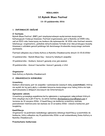 REGULAMIN 12.Rybnik Blues Festival 13-15 października 2016 1. INFORMACJE OGÓLNE O festiwalu Rybnik Blues Festival (RBF) jest międzynarodowym wydarzeniem muzycznym kultywującym tradycje bluesowe. Festiwal organizowany jest w Rybniku od 2005 roku, zaś od 2013 roku towarzyszy mu konkurs dla wykonawców. W 2016 roku festiwal zmienia lokalizację i organizatora, jednakże dotychczasowa formuła oraz idea promująca muzykę bluesową z udziałem gwiazd polskiego lub światowego środowiska muzycznego zostanie zachowana. Festiwal odbędzie się w Domu Kultury w Rybniku-Chwałowicachw dniach 13-15.10.2016r 13 października – Rybnik Blues Day – koncerty lokalnych zespołów 14 października – Konkurs, koncert gwiazdy oraz jam session 15 października – Koncert laureatów i koncert gwiazdy z USA Organizator Dom Kultury w Rybniku-Chwałowicach 2. ORGANIZACJA KONKURSU Uczestnicy Konkurs skierowany jest do zespołów i wykonawców (zwanych dalej uczestnikami), którzy nie wydali do tej pory płyty z udziałem koncernu muzycznego oraz takiej która nie była dystrybuowana w sklepach sieciowych lub Internetowych. Zgłoszenie udziału Uczestnicy przesyłają wypełnioną kartę zgłoszenia z wymaganymi załącznikami których lista znajduje się w pkt.4 karty, na adres mailowy [email protected] w terminie do 31 sierpnia 2016r. O kwalifikacji do konkursu uczestnicy zostaną powiadomieni telefonicznie lub mailowo do 12 września 2016r. Udział w konkursie jest bezpłatny. Kwalifikacja Organizator na podstawie nadesłanego zgłoszenia dokonuje kwalifikacji uczestników do konkursu, który odbędzie się 14 października 2016r w sali widowiskowej Domu Kultury w Rybniku-Chwałowicach. Przesłuchania konkursowe a) Zakwalifikowani uczestnicy zobowiązani są do występu scenicznego podczas festiwalu w dniu 14 października 2016r. od godz. b) Czas występu konkursowego uczestnika wynosi od 20 do 30 minut. c) Uczestnicy przywożą własne instrumenty i procesory, za wyjątkiem perkusisty który zobowiązany jest do przywiezienia werbla, stopy i talerzy. d) Organizator zapewnia obsługę akustyczno-oświetleniową, zestaw perkusyjny oraz dwa wzmacniacze gitarowe i jeden wzmacniacz basowy. e) Uczestnicy przyjeżdżają na koszt własny. f) Organizator nie pokrywa kosztów dojazdu i noclegów dla uczestników festiwalu. Jury Organizator powołuje jury, które wyłoni laureatów konkursu i zdecyduje o podziale nagród. Decyzje jury są ostateczne i nieodwołalne. Uczestnicy konkursu zostaną poinformowani o werdykcie w tym samym dniu. Kryteria oceny a) b) c) d) Autorski repertuar Warsztat wykonawczy Treść tekstu Aranżacja wykonywanych utworów Nagrody a) Uczestnicy zakwalifikowani do przesłuchań konkursowych, którzy wystąpią w II etapie konkursu otrzymają nagrodę gwarantowaną w wysokości 400 pln brutto b) Przewidziano następujące nagrody finansowe: I nagroda – 2000 pln II nagroda – 1000 pln III nagroda – 500 pln Jury może zdecydować o innym podziale nagród c) Nagrody zostaną wręczone podczas Galowego Koncertu Laureatów 12 RBF w dniu 15 października 2016r, tym samym zobowiązuje się laureatów do występu podczas koncertu – planowany czas prezentacji każdego uczestnika wynosi od 30 do 40 minut Inne postanowienia a) Udział w Festiwalu jest równoznaczny z wyrażeniem zgody na rejestrację audiowizualną występów konkursowych oraz na wielokrotne wykorzystywanie tego zapisu w celach promocyjnych i marketingowych Festiwalu i Organizatora b) Nadesłanie utworów do konkursu jest automatyczną zgodą na zamieszczenie materiału muzycznego na stronie internetowej festiwalu z możliwością jego pobieranie c) Uczestnik oświadcza że wyraża zgodę na bezpłatne użytkowanie utworów przez organizatora na wszelkich eksploatacji (wymienione w art. 50 ust. o prawie autorskim i prawach pokrewnych) tj.: - utrwalenie, zwielokrotnienie i zapisywanie utworów na wszelkich dostępnych nośnikach - wprowadzanie utworów do różnych urządzeń i wszelkie inne rozpowszechnianie - nadawanie i reemitowanie utworów - publiczne odtwarzanie, wyświetlanie, wykonywanie, wystawianie utworów d) Organizator jest wyłącznie uprawniony do decydowania o sposobie i terminie i zakresie (w całości lub części) korzystania z rezultatów pracy (wykonawstwa) oraz materiałów nagraniowych powstałych podczas prezentacji na Rybnik Blues Festival. e) Organizator zastrzega sobie prawo do zmiany terminów i kolejności występów oraz do odwołania imprezy Kontakt do Organizatora Dom Kultury w Rybniku-Chwałowicach Ul. 1 Maja 91B, 44-206 Rybnik Biuro Organizacyjne RBF – koordynator Beata Tomas www.rybnikbluesfestival.com e-mail: [email protected] tel. +48 32 42-16-222