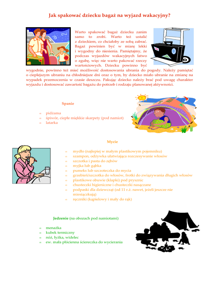 Jak spakować dziecku bagaż na wyjazd wakacyjny? Warto spakować bagaż dziecku zanim samo to zrobi. Warto też ustalić z dzieckiem, co chciałoby ze sobą zabrać. Bagaż powinien być w miarę lekki i wygodny do niesienia. Pamiętajmy, że podczas wyjazdów wakacyjnych łatwo o zgubę, więc nie warto pakować rzeczy wartościowych. Dziecku powinno być wygodnie, powinno też mieć możliwość dostosowania ubrania do pogody. Należy pamiętać o cieplejszym ubraniu na chłodniejsze dni oraz o tym, by dziecko miało ubranie na zmianę na wypadek przemoczenia w czasie deszczu. Pakując dziecko należy brać pod uwagę charakter wyjazdu i dostosować zawartość bagażu do potrzeb i rodzaju planowanej aktywności. Spanie • • • pidżama śpiwór, ciepłe miękkie skarpety (pod namiot) latarka Mycie • • • • • • • • • • mydło (najlepiej w małym plastikowym pojemniku) szampon, odżywka ułatwiająca rozczesywanie włosów szczotka i pasta do zębów myjka lub gąbka pumeks lub szczoteczka do mycia grzebień/szczotka do włosów, frotki do związywania długich włosów plastikowe obuwie (klapki) pod prysznic chusteczki higieniczne i chusteczki nasączane podpaski dla dziewcząt (od 11 r.ż. nawet, jeżeli jeszcze nie miesiączkują) ręczniki (kąpielowy i mały do rąk) Jedzenie (na obozach pod namiotami) • • • • menażka kubek termiczny nóż, łyżka, widelec ew. mała płócienna ściereczka do wycierania Plaża • • • • • • 2 kostiumy kąpielowe ręcznik plażowy obuwie plażowe (może być to samo, co pod prysznic) czapka, kapelusz lub chustka na głowę krem wodoodporny z filtrem (im jaśniejsza karnacja tym wyższy filtr) podręczny plecak lub torba Odzież • • • • • majtki (1 para na każdy dzień) krótkie spodenki kilka bawełnianych lub lnianych bluzek skarpetki bawełniane (1 para na każdy dzień) sandały • • • • • • • pełne obuwie, np. sportowe (najlepiej 2 pary) rajstopy / kalesony / legginsy kurtka nieprzemakalna (również na dni wietrzne) długie spodnie (jak nie ma dresu to 2 pary) dres (spodnie i bluza) 2-3 bluzki z długim rękawem sweter ciepły Leki • tylko te, które są konieczne (z informacją dla wychowawcy jak podawać) Inne rzeczy • • • • • ulubiona maskotka w przypadku wyjazdu na obóz wędrowny należy zabrać używane i sprawdzone obuwie i niewielki plecak na podręczne rzeczy, a na obóz jeździecki odpowiednie ubranie itp. warto ustalić z dzieckiem gdzie będzie trzymać pieniądze i na co może je wydać zostawić swój numer telefonu dziecku i wychowawcy środek odstraszający komary